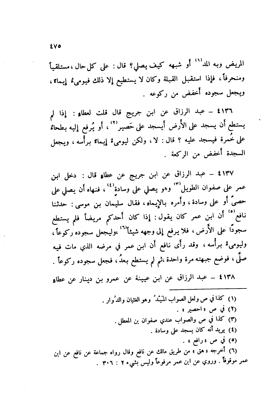 ٤١٣٧ - عَنِ ابْنِ جُرَيْجٍ، عَنْ عَطَاءٍ قَالَ: «دَخَلَ ابْنُ عُمَرَ عَلَى صَفْوَانَ الطَّوِيلِ وَهُوَ يُصَلِّي عَلَى وِسَادَةٍ، فَنَهَاهُ أَنْ يُصَلِّيَ عَلَى حَصًى أَوْ عَلَى وِسَادَةٍ، وَأَمَرَهُ بِالْإِيمَاءِ»