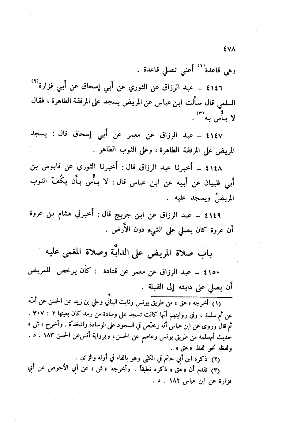 ٤١٤٧ - عَنْ مَعْمَرٍ، عَنْ أَبِي إِسْحَاقَ قَالَ: «يَسْجُدُ الْمَرِيضُ عَلَى الْمِرْفَقَةِ الطَّاهِرَةِ، وَعَلَى الثَّوْبِ الطَّاهِرِ»