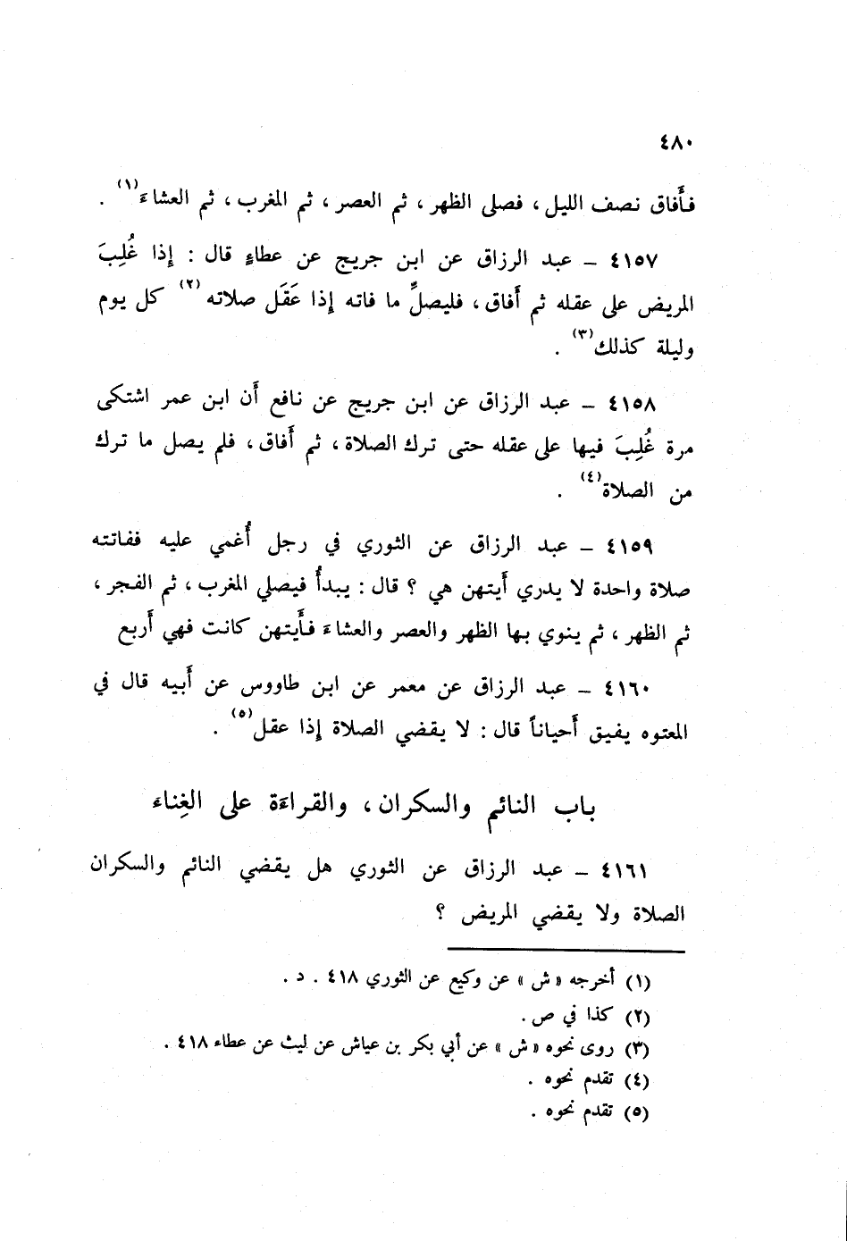 ٤١٥٨ - عَنِ ابْنِ جُرَيْجٍ، عَنْ نَافِعٍ: «أَنَّ ابْنَ عُمَرَ اشْتَكَى مَرَّةً غُلِبَ فِيهَا عَلَى عَقْلِهِ حَتَّى تَرَكَ الصَّلَاةَ، ثُمَّ أَفَاقَ، فَلَمْ يُصَلِّ مَا تَرَكَ مِنَ الصَّلَاةِ»