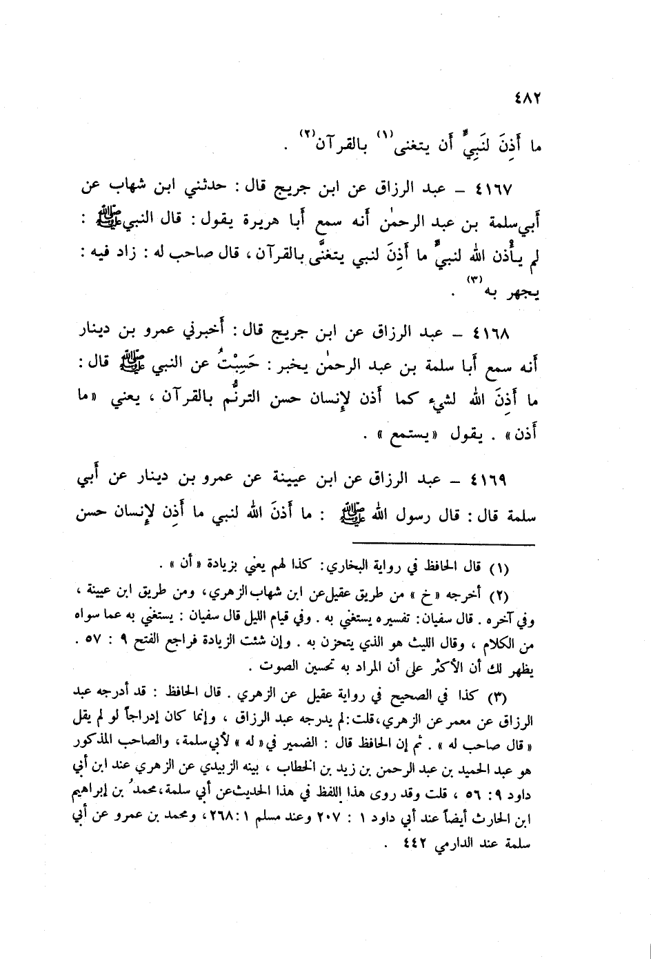 ٤١٦٨ - عَنِ ابْنِ جُرَيْجٍ قَالَ: أَخْبَرَنِي عَمْرُو بْنُ دِينَارٍ، أَنَّهُ سَمِعَ أَبَا سَلَمَةَ بْنِ عَبْدِ الرَّحْمَنِ، يُخْبِرُ: حَسِبْتُ عَنِ النَّبِيِّ صَلَّى اللهُ عَلَيْهِ وَسَلَّمَ قَالَ: «مَا أَذِنَ اللَّهُ لِشَيْءٍ كَمَا أَذِنِ لِإِنْسَانٍ حَسَنِ التَّرَنُّمِ بِالْقُرْآنِ» يَعْنِي مَا أَذِنِ يَقُولُ: يَسْتَمِعُ