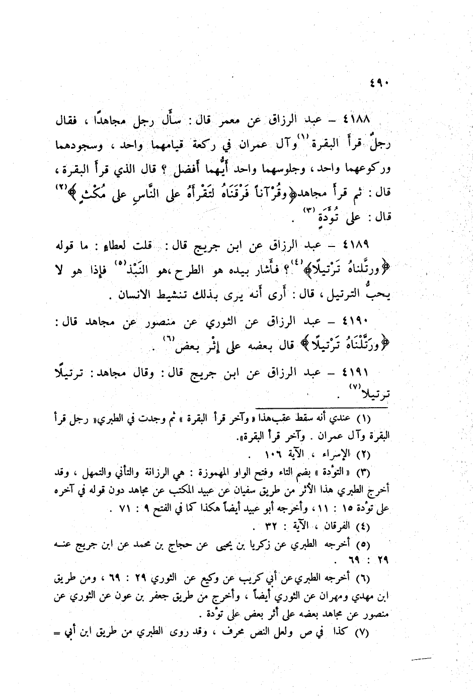 ٤١٩٠ - عَنِ الثَّوْرِيِّ، عَنْ مَنْصُورٍ، عَنْ مُجَاهِدٍ قَالَ: {وَرَتَّلْنَاهُ تَرْتِيلًا} [الفرقان: ٣٢] قَالَ: «بَعْضُهُ عَلَى إِثْرِ بَعْضٍ»