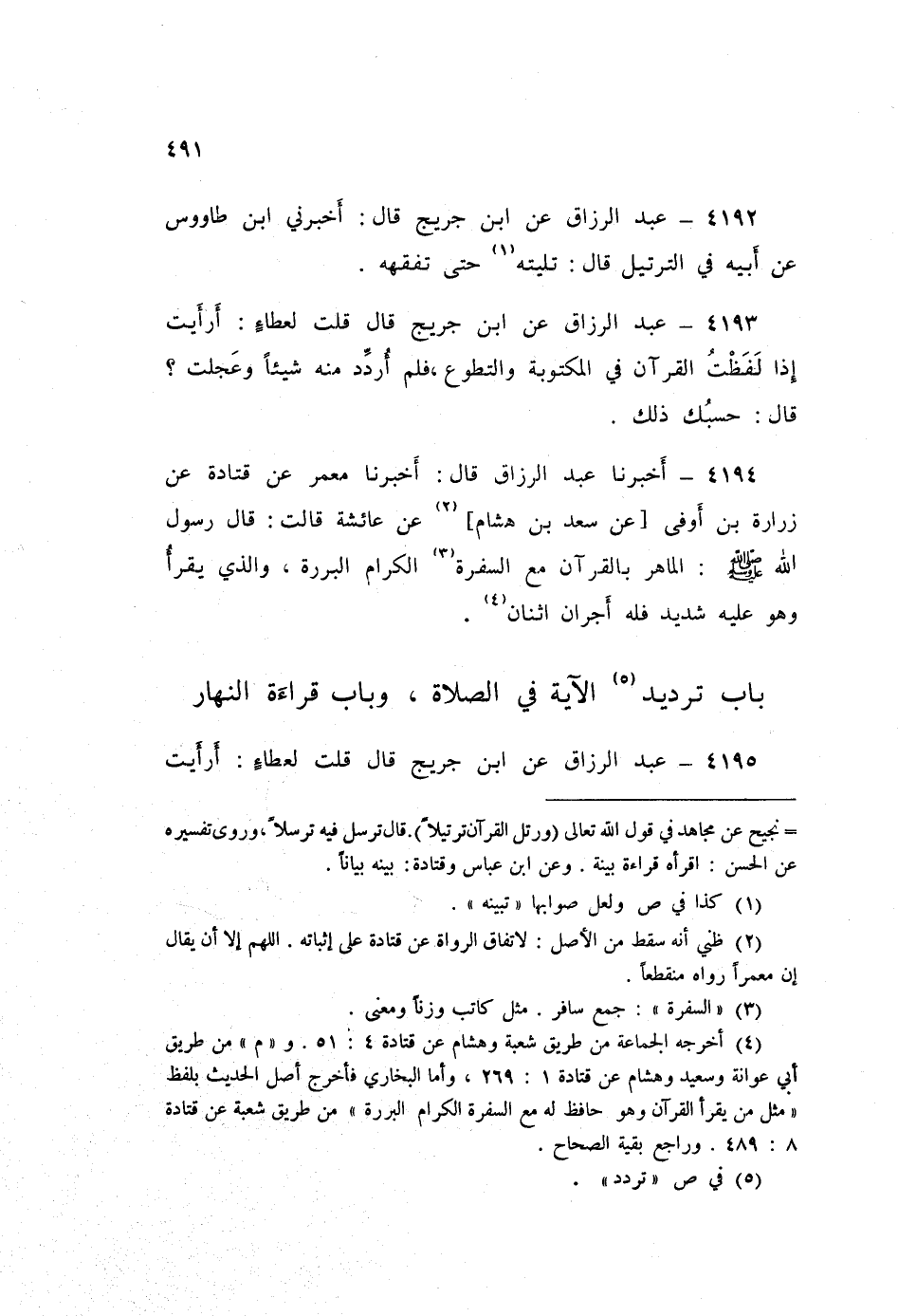 ٤١٩٤ - عَبْدُ الرَّزَّاقِ، أَخْبَرَنَا مَعْمَرٌ، عَنْ قَتَادَةَ، عَنْ زُرَارَةَ بْنِ أَوْفَى، عَنْ سَعْدِ بْنِ هِشَامٍ، عَنْ عَائِشَةَ قَالَتْ: قَالَ رَسُولُ اللَّهِ صَلَّى اللهُ عَلَيْهِ وَسَلَّمَ: «الْمَاهِرُ بِالْقُرْآنِ مَعَ السَّفَرَةِ الْكِرَامِ الْبَرَرَةِ، وَالَّذِي يَقْرَأُ وَهُوَ عَلَيْهِ شَدِيدٌ فَلَهُ أَجْرَانِ اثْنَانِ»