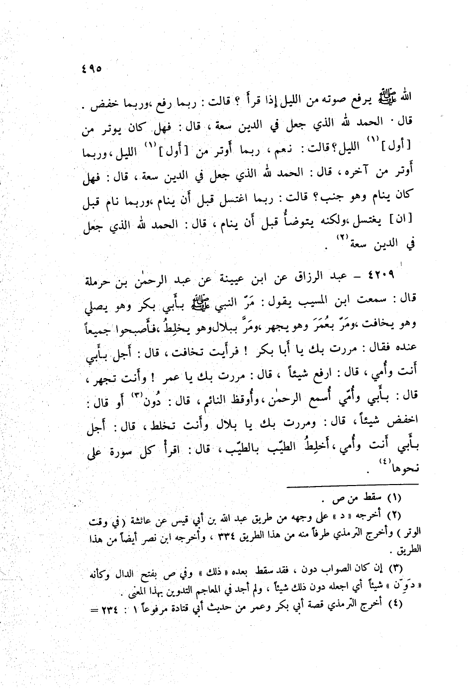 ٤٢٠٩ - عَنِ ابْنِ عُيَيْنَةَ، عَنْ عَبْدِ الرَّحْمَنِ بْنِ حَرْمَلَةَ قَالَ: سَمِعْتُ ابْنَ الْمُسَيَّبِ يَقُولُ: مَرَّ النَّبِيُّ صَلَّى اللهُ عَلَيْهِ وَسَلَّمَ بِأَبِي بَكْرٍ وَهُوَ يُصَلِّي وَهُوَ يُخَافِتُ، وَمَرَّ بِعُمَرَ وَهُوَ يَجْهَرُ، وَمَرَّ بِبِلَالٍ وَهُوَ يَخْلِطُ، فَأَصْبَحُوا جَمِيعًا عِنْدَهُ فَقَالَ: «مَرَرْتُ بِكَ يَا أَبَا بَكْرٍ فَرَأَيْتُ تُخَافِتُ» قَالَ: أَجَلْ بِأَبِي أَنْتَ وَأُمِّي قَالَ: «ارْفَعْ شَيْئًا» قَالَ: «مَرَرْتُ بِكَ يَا عُمَرُ وَأَنْتَ تَجْهَرُ» قَالَ: بِأَبِي وَأُمِّي أُسْمِعُ الرَّحْمَنَ، وَأُوقِظُ النَّائِمَ قَالَ: " دُونَ - أَوْ قَالَ: - اخْفِضْ شَيْئًا " قَالَ: «وَمَرَرْتُ بِكَ يَا بِلَالُ وَأَنْتَ تَخْلِطُ» قَالَ: أَجَلْ بِأَبِي أَنْتَ وَأُمِّي، أَخْلِطُ الطِّيبَ بِالطِّيبِ قَالَ: «اقْرَأْ كُلَّ سُورَةٍ عَلَى نَحْوِهَا»