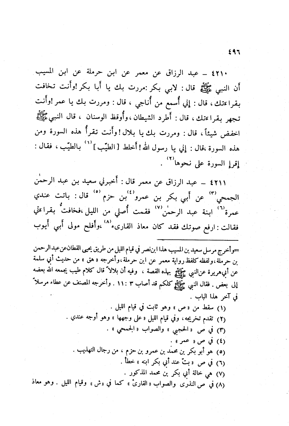 ٤٢١١ - عَنْ مَعْمَرٍ قَالَ: أَخْبَرَنِي سَعِيدُ بْنُ عَبْدِ الرَّحْمَنِ الْجُمَحِيُّ، عَنْ أَبِي بَكْرِ بْنِ عَمْرِو بْنِ حَزْمٍ قَالَ: بَاتَتْ عِنْدِي عَمْرَةُ ابْنَةُ عَبْدِ الرَّحْمَنِ فَقُمْتُ أُصَلِّي مِنَ اللَّيْلِ، فَخَافَتُّ بِقِرَاءَتِي، فَقَالَتِ: «ارْفَعْ صَوْتَكَ، فَقَدْ كَانَ مُعَاذٌ الْقَارِئُ، وَأَفْلَحُ مَوْلَى أَبِي أَيُّوبَ يُوقِظَانِنَا مِنَ اللَّيْلِ بِرَفْعِ أَصْوَاتِهِمَا»