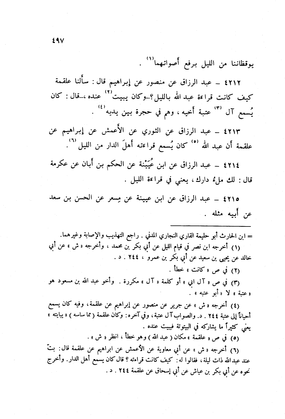 ٤٢١٣ - عَنِ الثَّوْرِيِّ، عَنِ الْأَعْمَشِ، عَنْ إِبْرَاهِيمَ، عَنْ عَلْقَمَةَ: «أَنَّ عَبْدَ اللَّهِ، كَانَ يُسْمِعُ قِرَاءَتَهُ أَهْلَ الدَّارِ مِنَ اللَّيْلِ»