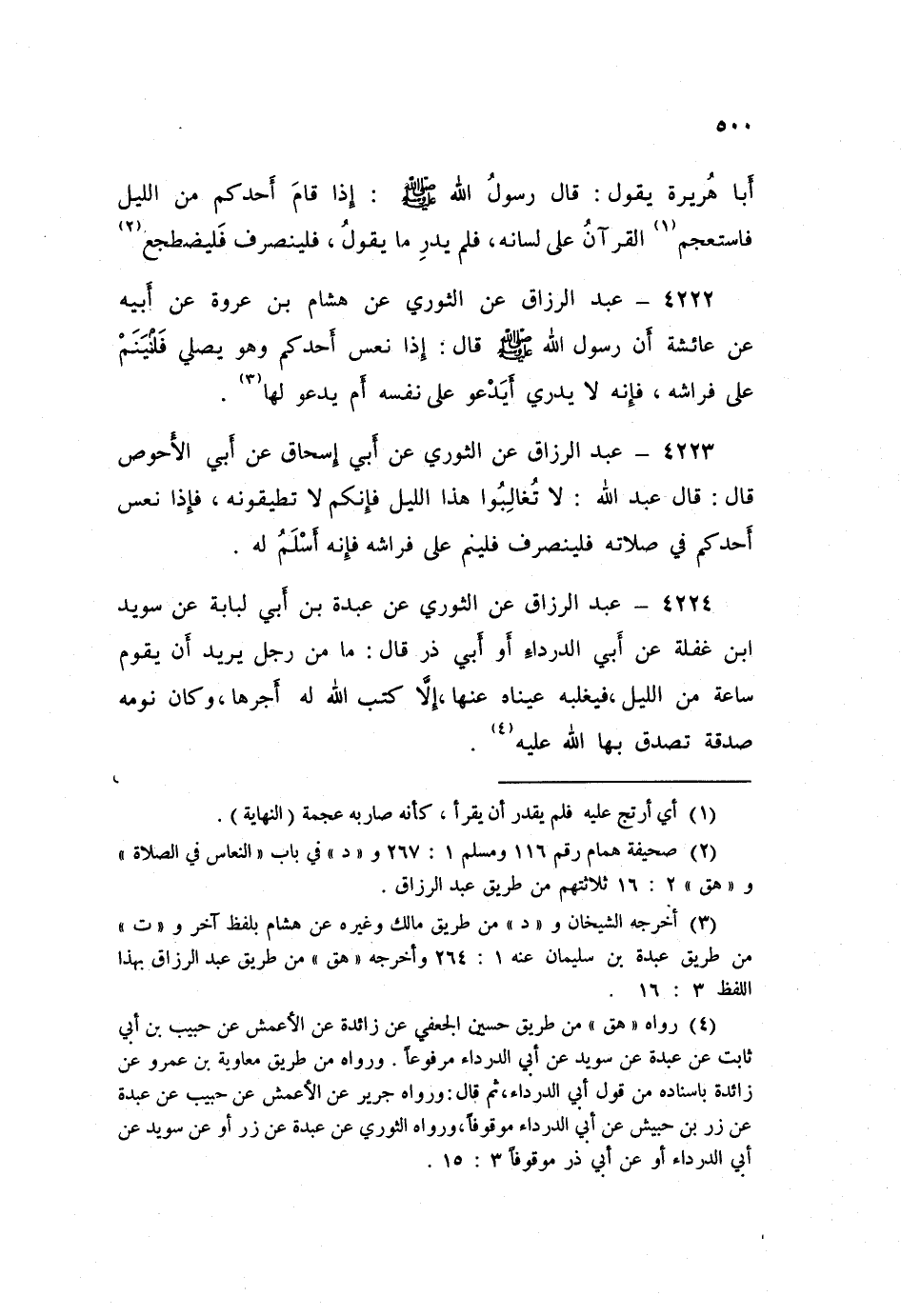 ٤٢٢٣ - عَنِ الثَّوْرِيِّ، عَنْ أَبِي إِسْحَاقَ، عَنْ أَبِي الْأَحْوَصِ قَالَ: قَالَ عَبْدُ اللَّهِ: «لَا تُغَالِبُوا هَذَا اللَّيْلَ؛ فَإِنَّكُمْ لَا تُطِيقُونَهُ، فَإِذَا نَعَسَ أَحَدُكُمْ فِي صَلَاتِهِ فَلْيَنْصَرِفْ فَلْيَنَمْ عَلَى فِرَاشِهِ فَإِنَّهُ أَسْلَمُ لَهُ»