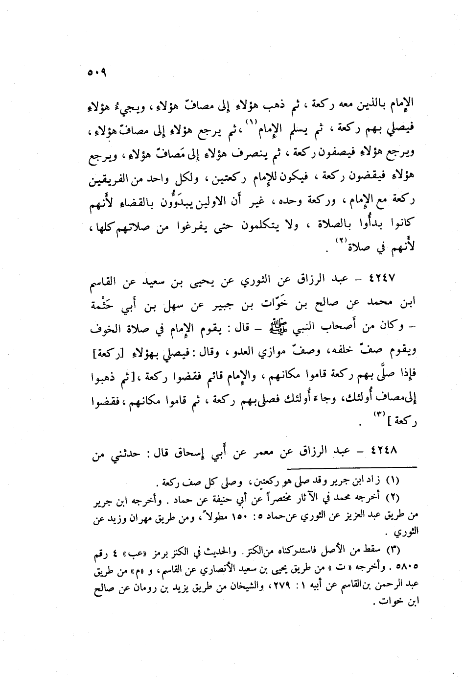 ٤٢٤٨ - عَنْ مَعْمَرٍ، عَنْ أَبِي إِسْحَاقَ قَالَ: حَدَّثَنِي مَنْ شَهِدَ سَعِيدَ بْنَ الْعَاصِ فِي غَزْوَةٍ يُقَالُ لَهَا ذَاتُ الْخَشَبِ، وَمَعَهُ حُذَيْفَةُ، فَقَالَ سَعِيدٌ: أَيُّكُمْ شَهِدَ مَعَ رَسُولِ اللَّهِ صَلَّى اللهُ عَلَيْهِ وَسَلَّمَ صَلَاةَ الْخَوْفِ؟ فَقَالَ حُذَيْفَةُ: أَنَا، فَأَمَرَهُمْ حُذَيْفَةُ فَلَبِسُوا السِّلَاحَ، ثُمَّ قَالَ: إِنْ هَاجَكُمْ هَيْجٌ فَقَدْ حَلَّ لَكُمُ الْقِتَالُ قَالَ: «فَصَلَّى بِإِحْدَى الطَّائِفَتَيْنِ رَكْعَةً، وَالطَّائِفَةُ الْأُخْرَى مُوَاجِهَةٌ الْعَدُوَّ، ثُمَّ انْصَرَفَ هَؤُلَاءِ فَقَامُوا مَقَامَ أُولَئِكَ، وَجَاءَ أُولَئِكَ فَصَلَّى بِهِمْ رَكْعَةً أُخْرَى، ثُمَّ سَلَّمَ عَلَيْهِمْ»