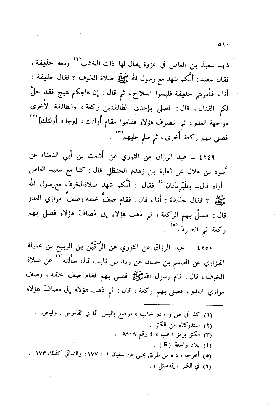 ٤٢٥٠ - عَنِ الثَّوْرِيِّ، عَنِ الرُّكَيْنِ بْنِ الرَّبِيعِ بْنِ عُمَيْلَةَ الْفَزَارِيِّ، عَنِ الْقَاسِمِ بْنِ حَسَّانَ، عَنْ زَيْدِ بْنِ ثَابِتٍ قَالَ: سَأَلْتُهُ عَنْ صَلَاةِ الْخَوْفِ قَالَ: «قَامَ رَسُولُ اللَّهِ صَلَّى اللهُ عَلَيْهِ وَسَلَّمَ فَصَلَّى بِهِمْ، فَقَامَ صَفٌّ خَلْفَهُ وَصَفٌّ مُوَازِيَ الْعَدُوِّ، فَصَلَّى بِهِمْ رَكْعَةً» قَالَ: «ثُمَّ ذَهَبَ هَؤُلَاءِ إِلَى مَصَافِّ هَؤُلَاءِ، وَجَاءَ هَؤُلَاءِ فَصَلَّى بِهِمْ رَكْعَةً، ثُمَّ انْصَرَفَ»