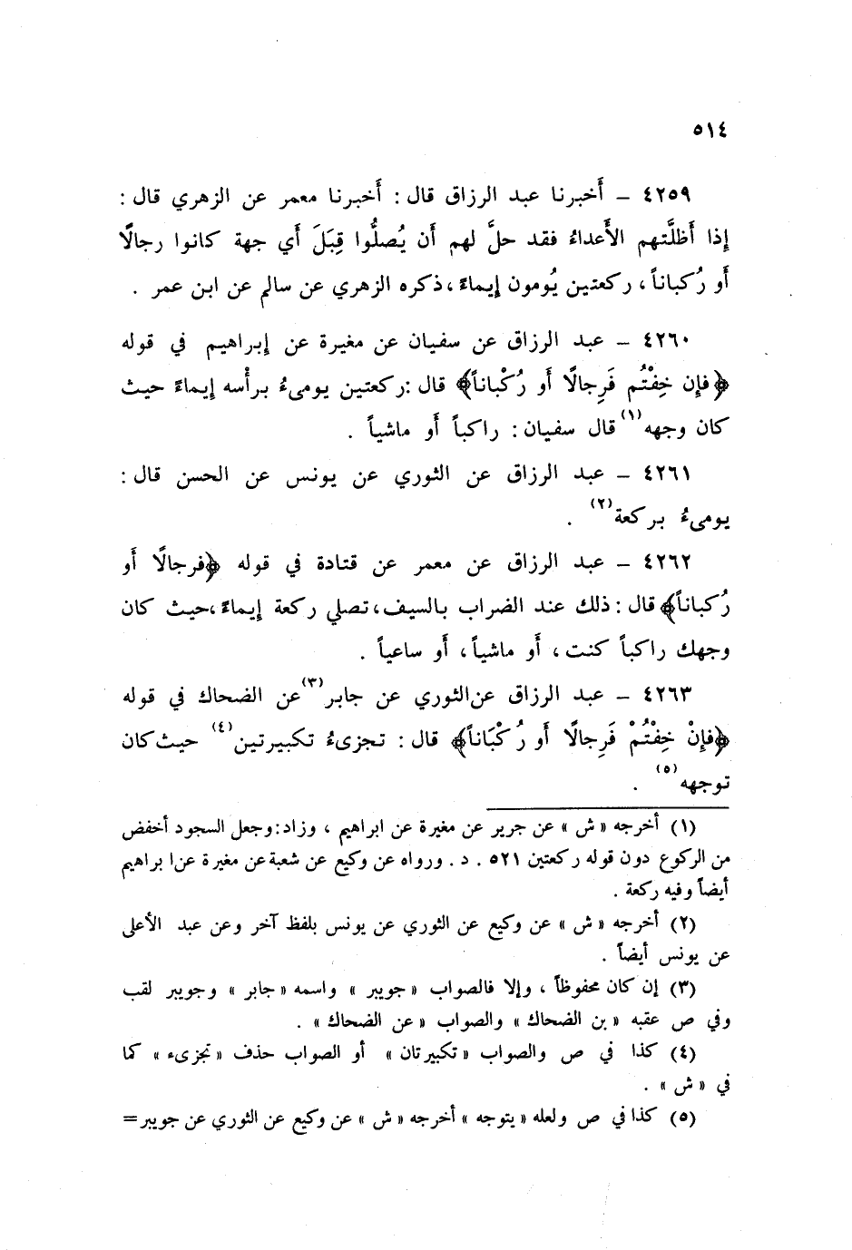 ٤٢٥٩ - عَبْدُ الرَّزَّاقِ، أَخْبَرَنَا مَعْمَرٌ، عَنِ الزُّهْرِيِّ قَالَ: «إِذَا أَظَلَّتْهُمُ الْأَعْدَاءُ فَقَدْ حَلَّ لَهُمْ أَنْ يُصَلُّوا قِبَلَ أَيِّ جِهَةٍ كَانُوا رِجَالًا أَوْ رُكْبَانًا رَكْعَتَيْنِ يُومُونَ إِيمَاءً». ذَكَرَهُ الزُّهْرِيُّ، عَنْ سَالِمٍ عَنِ ابْنِ عُمَرَ