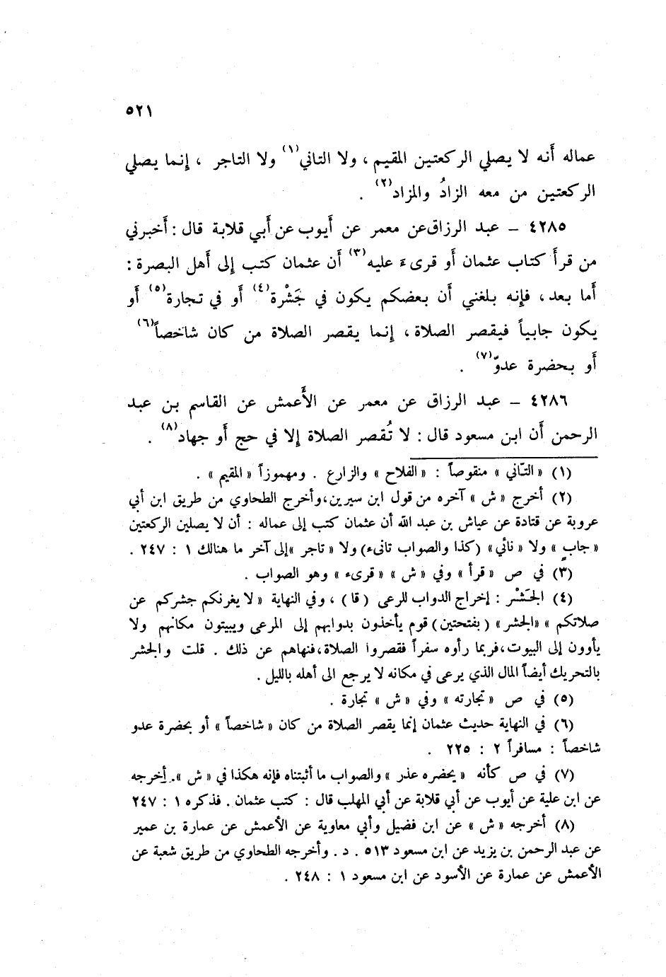 ٤٢٨٦ - عَنْ مَعْمَرٍ، عَنِ الْأَعْمَشِ، عَنِ الْقَاسِمِ بْنِ عَبْدِ الرَّحْمَنِ، أَنَّ ابْنَ مَسْعُودٍ قَالَ: «لَا تُقْصَرُ الصَّلَاةُ إِلَّا فِي حَجٍّ أَوْ جِهَادٍ»