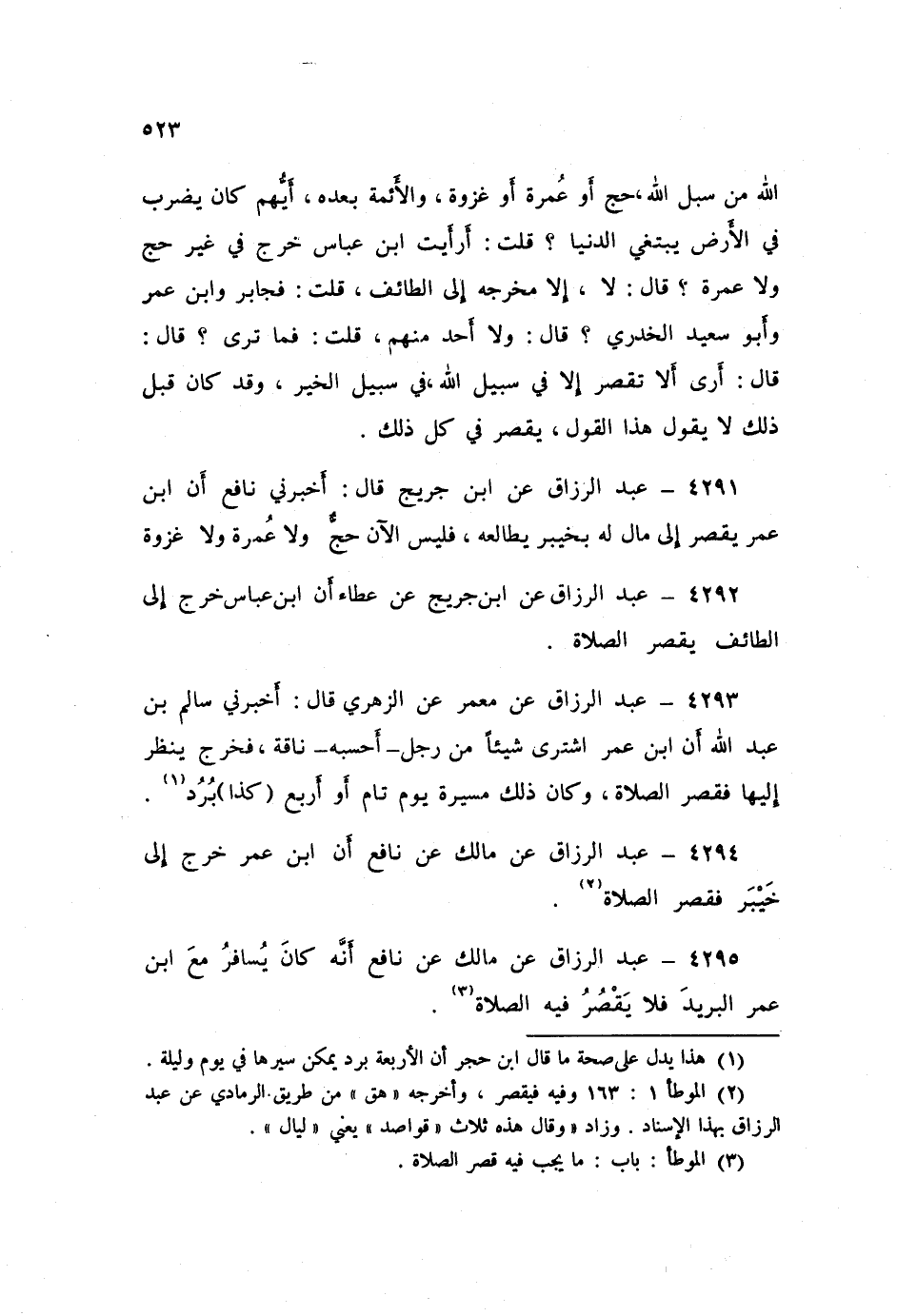٤٢٩١ - عَنِ ابْنِ جُرَيْجٍ قَالَ: أَخْبَرَنِي نَافِعٌ: «أَنَّ ابْنَ عُمَرَ يَقْصُرُ إِلَى مَالٍ لَهُ بِخَيْبَرَ يُطَالِعُهُ، فَلَيْسَ الْآنَ حَجٌّ وَلَا عُمْرَةٌ، وَلَا غَزْوَةٌ»