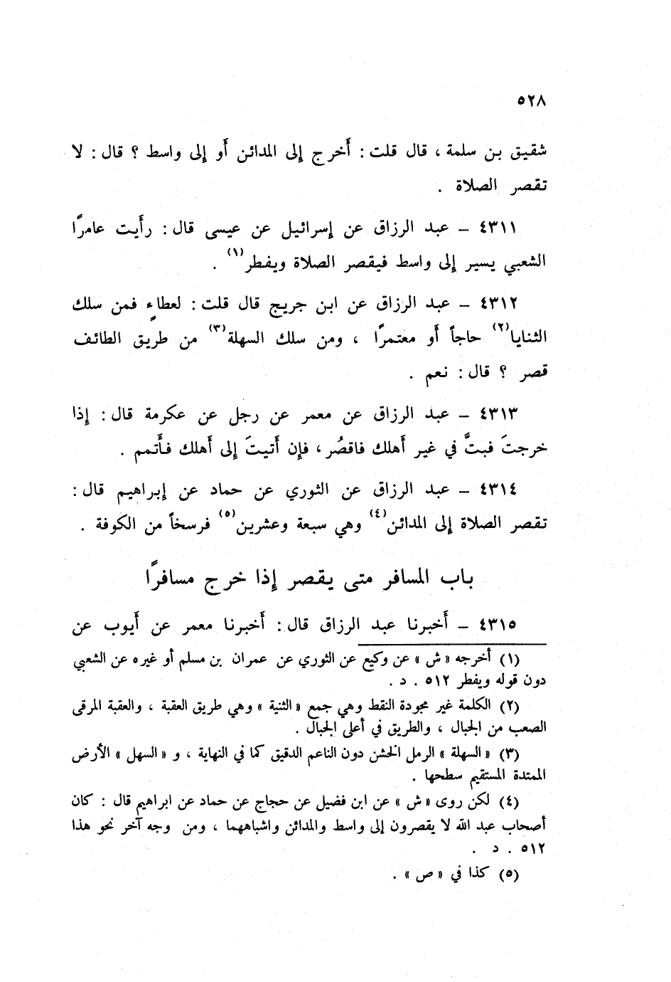 ٤٣١٤ - عَنِ الثَّوْرِيِّ، عَنْ حَمَّادٍ، عَنْ إِبْرَاهِيمَ قَالَ: «تُقْصَرُ الصَّلَاةُ إِلَى الْمَدَائِنِ، وَهِيَ سَبْعَةٌ وَعِشْرُونَ فَرْسَخًا مِنَ الْكُوفَةِ»