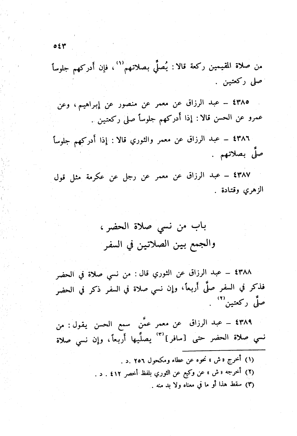 ٤٣٨٦ - عَنْ مَعْمَرٍ، وَالثَّوْرِيِّ، قَالَا: «إِذَا أَدْرَكَهُمْ جُلُوسًا صَلَّى بِصَلَاتِهِمْ».