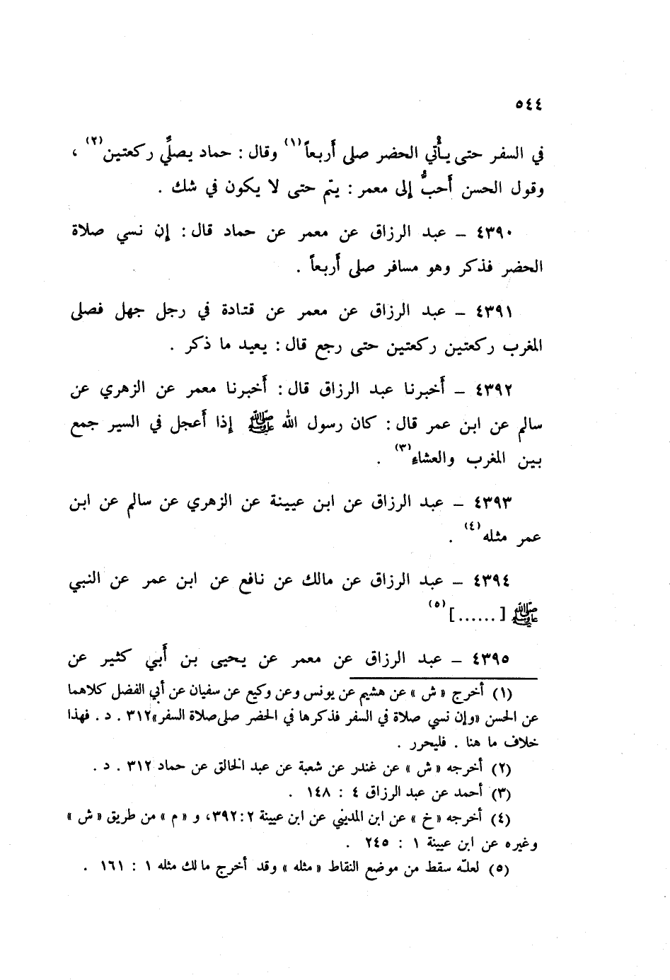 ٤٣٩٢ - عَبْدُ الرَّزَّاقِ، أَخْبَرَنَا مَعْمَرٌ، عَنِ الزُّهْرِيِّ، عَنْ سَالِمٍ، عَنِ ابْنِ عُمَرَ قَالَ: «كَانَ رَسُولُ اللَّهِ صَلَّى اللهُ عَلَيْهِ وَسَلَّمَ إِذَا أَعْجَلَ فِي السَّيْرِ جَمَعَ بَيْنَ الْمَغْرِبِ وَالْعِشَاءِ». عَبْدُ الرَّزَّاقِ،