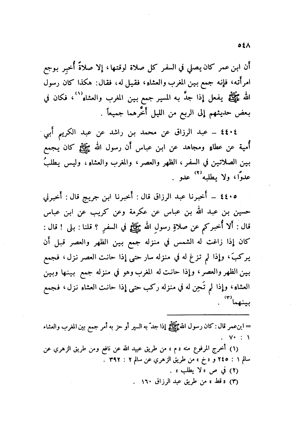 ٤٤٠٥ - عَبْدُ الرَّزَّاقِ، أَخْبَرَنَا ابْنُ جُرَيْجٍ قَالَ: أَخْبَرَنِي حُسَيْنُ بْنُ عَبْدِ اللَّهِ بْنِ عَبَّاسٍ، عَنْ عِكْرِمَةَ، وَعَنْ كُرَيْبٍ، عَنِ ابْنِ عَبَّاسٍ قَالَ: أَلَا أُخْبِرُكُمْ عَنْ صَلَاةِ رَسُولِ اللَّهِ صَلَّى اللهُ عَلَيْهِ وَسَلَّمَ فِي السَّفَرِ؟ قُلْنَا: بَلَى قَالَ: «كَانَ إِذَا زَاغَتْ لَهُ الشَّمْسُ فِي مَنْزِلِهِ جَمَعَ بَيْنَ الظُّهْرِ وَالْعَصْرِ قَبْلَ أَنْ يَرْكَبَ، وَإِذَا لَمْ تَزُغْ لَهُ فِي مَنْزِلِهِ سَارَ حَتَّى إِذَا حَانَتِ الْعَصْرُ نَزَلَ فَجَمَعَ بَيْنَ الظُّهْرِ وَالْعَصْرِ، وَإِذَا حَانَتْ لَهُ الْمَغْرِبُ وَهُوَ فِي مَنْزِلِهِ جَمَعَ بَيْنَهَا وَبَيْنَ الْعِشَاءِ، وَإِذَا لَمْ تَحِنْ لَهُ فِي مَنْزِلِهِ رَكِبَ حَتَّى إِذَا حَانَتِ الْعِشَاءُ نَزَلَ فَجَمَعَ بَيْنَهُمَا» ⦗٥٤٩⦘. قَالَ: وَقَالَ لِيَ الْمِقْدَامُ: «مَا سَمِعْنَا هَذَا مِنِ ابْنِ جُرَيْجٍ، وَلَا جَاءَ بِهِ غَيْرُكَ»