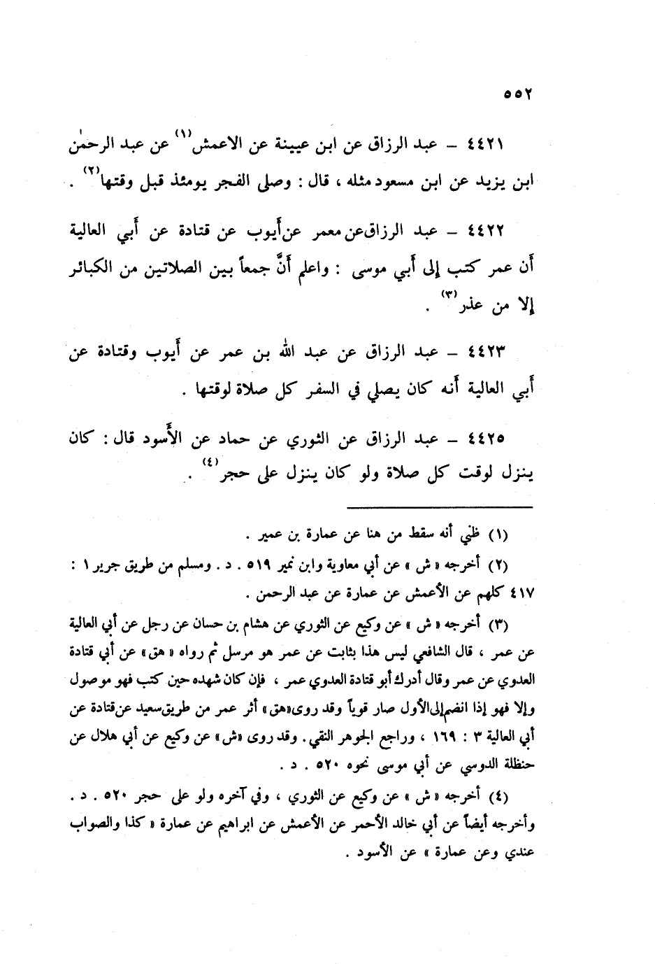 ٤٤٢٢ - عَنْ مَعْمَرٍ، عَنْ أَيُّوبَ، عَنْ قَتَادَةَ، عَنْ أَبِي الْعَالِيَةِ، أَنَّ عُمَرَ كَتَبَ إِلَى أَبِي مُوسَى: «وَاعْلَمْ أَنَّ جَمْعًا بَيْنَ الصَّلَاتَيْنِ مِنَ الْكَبَائِرِ إِلَّا مِنْ عُذْرٍ»
