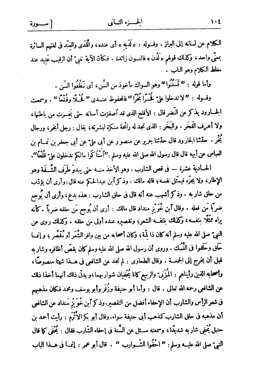 الْكَلَامَ عَنْ لِسَانِهِ إِلَى الْبَرَازِ. وَقَوْلُهُ:" لَدَيْهِ" أَيْ عِنْدَهُ، وَالَّدَى وَالْعِنْدُ فِي لُغَتِهِمُ السَّائِرَةِ بِمَعْنًى وَاحِدٍ، وَكَذَلِكَ قَوْلُهُمْ" لَدُنْ" فَالنُّونُ زَائِدَةٌ. فَكَأَنَّ الْآيَةَ تُنَبِّئُ أَنَّ الرَّقِيبَ عَتِيدٌ عِنْدَ مُغَلَّظِ الْكَلَامِ وَهُوَ النَّابُ. وَأَمَّا قَوْلُهُ: (تَسَنَّنُوا) وَهُوَ السِّوَاكُ مَأْخُوذٌ مِنَ السِّنِّ، أَيْ نَظِّفُوا السِّنَّ. وَقَوْلُهُ: (لَا تَدْخُلُوا عَلَيَّ قُخْرًا بُخْرًا) فالمحفوظ عندي (فحلا وَقُلْحًا). وَسَمِعْتُ الْجَارُودَ يَذْكُرُ عَنِ النَّضْرِ قَالَ: الْأَقْلَحُ الَّذِي قَدِ اصْفَرَّتْ أَسْنَانُهُ حَتَّى بَخِرَتْ مِنْ بَاطِنِهَا، وَلَا أَعْرِفُ الْقَخَرَ. وَالْبَخَرُ: الَّذِي تَجِدُ لَهُ رَائِحَةً مُنْكَرَةً لِبَشَرَتِهِ، يُقَالُ: رَجُلٌ أَبْخَرُ، وَرِجَالٌ بُخُرٌ. حَدَّثَنَا الْجَارُودُ قَالَ: حَدَّثَنَا جَرِيرٌ عَنْ مَنْصُورٍ عَنْ أَبِي عَلِيٍّ عَنْ أَبِي جَعْفَرِ بْنِ تَمَّامِ بْنِ الْعَبَّاسِ عَنْ أَبِيهِ قَالَ: قَالَ رَسُولُ اللَّهِ صَلَّى اللَّهُ عَلَيْهِ وَسَلَّمَ: (اسْتَاكُوا، مَا لَكُمْ تَدْخُلُونَ عَلَيَّ قُلْحًا). الْحَادِيَةَ عَشْرَةَ- فِي قَصِّ الشَّارِبِ. وَهُوَ الْأَخْذُ مِنْهُ حَتَّى يَبْدُوَ طَرَفُ الشَّفَةِ وَهُوَ الْإِطَارُ، وَلَا يَجُزُّهُ فَيُمَثِّلُ نَفْسَهُ، قَالَهُ مَالِكٌ. وَذَكَرَ ابْنُ عَبْدِ الْحَكَمِ عَنْهُ قَالَ: وَأَرَى أَنْ يُؤَدَّبَ مَنْ حَلَقَ شَارِبَهُ. وَذَكَرَ أَشْهَبُ عَنْهُ أَنَّهُ قَالَ فِي حَلْقِ الشَّارِبِ: هَذِهِ بِدَعٌ، وَأَرَى أَنْ يُوجَعَ ضَرْبًا مَنْ فَعَلَهُ. وَقَالَ ابْنُ خُوَيْزِ مَنْدَادَ قَالَ مَالِكٌ: أَرَى أَنْ يُوجَعَ مَنْ حَلَقَهُ ضَرْبًا. كَأَنَّهُ يَرَاهُ مُمَثِّلًا بِنَفْسِهِ، وَكَذَلِكَ بِنَتْفِهِ الشَّعْرَ، وَتَقْصِيرِهِ عِنْدَهُ أَوْلَى مِنْ حَلْقِهِ. وَكَذَلِكَ رُوِيَ عَنِ النَّبِيِّ صَلَّى اللَّهُ عَلَيْهِ وَسَلَّمَ أَنَّهُ كَانَ ذَا لِمَّةٍ، وَكَانَ أَصْحَابُهُ مِنْ بَيْنِ وَافِرِ الشَّعْرِ أَوْ مُقَصِّرٍ، وَإِنَّمَا حَلَقَ وَحَلَقُوا فِي النُّسُكِ. وَرُوِيَ أَنَّ رَسُولَ اللَّهِ صَلَّى اللَّهُ عَلَيْهِ وَسَلَّمَ كَانَ يَقُصُّ أَظَافِرَهُ وَشَارِبَهُ قَبْلَ أَنْ يَخْرُجَ إِلَى الْجُمُعَةِ. وَقَالَ الطَّحَاوِيُّ: لَمْ نَجِدْ عَنِ الشَّافِعِيِّ فِي هَذَا شَيْئًا مَنْصُوصًا، وَأَصْحَابُهُ الَّذِينَ رَأَيْنَاهُمْ: الْمُزَنِيُّ وَالرَّبِيعُ كَانَا يُحْفِيَانِ شَوَارِبَهُمَا، وَيَدُلُّ ذَلِكَ أَنَّهُمَا أَخَذَا ذَلِكَ عَنِ الشَّافِعِيِّ رَحِمَهُ اللَّهُ تَعَالَى. قَالَ: وَأَمَّا أَبُو حَنِيفَةَ وَزُفَرُ وَأَبُو يُوسُفَ وَمُحَمَّدُ فَكَانَ مَذْهَبُهُمْ فِي شَعْرِ الرَّأْسِ وَالشَّارِبِ أَنَّ الْإِحْفَاءَ أَفْضَلُ مِنَ التَّقْصِيرِ. وَذَكَرَ ابْنُ خُوَيْزِ مَنْدَادَ عَنِ الشَّافِعِيِّ أَنَّ مَذْهَبَهُ فِي حَلْقِ الشَّارِبِ كَمَذْهَبِ أَبِي حَنِيفَةَ سَوَاءٌ. وَقَالَ أَبُو بَكْرٍ الْأَثْرَمُ: رَأَيْتُ أَحْمَدَ بْنَ حَنْبَلٍ يُحْفِي شَارِبَهُ شَدِيدًا، وَسَمِعْتُهُ سُئِلَ عَنِ السُّنَّةِ فِي إِحْفَاءِ الشَّارِبِ فَقَالَ: يُحْفَى كَمَا قَالَ النَّبِيُّ صَلَّى اللَّهُ عَلَيْهِ وَسَلَّمَ: (أَحْفُوا الشَّوَارِبَ). قَالَ أَبُو عُمَرَ: إِنَّمَا فِي هَذَا الْبَابِ أَصْلَانِ: