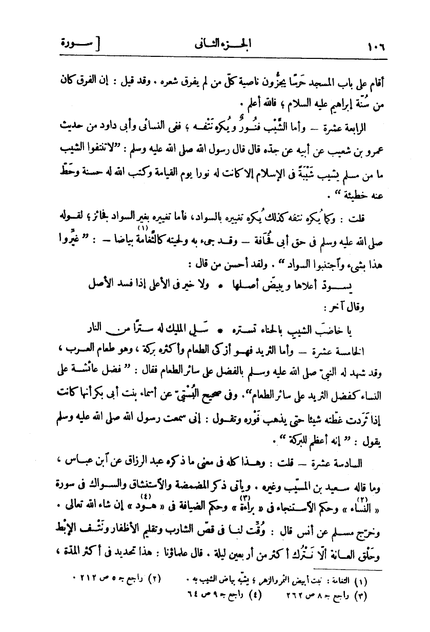 أَقَامَ عَلَى بَابِ الْمَسْجِدِ حَرَسًا يَجُزُّونَ نَاصِيَةَ كُلِّ مَنْ لَمْ يُفَرِّقْ شَعْرَهُ. وَقَدْ قِيلَ: إِنَّ الْفَرْقَ كَانَ مِنْ سُنَّةِ إِبْرَاهِيمَ عَلَيْهِ السَّلَامُ، فَاللَّهُ أَعْلَمُ. الرَّابِعَةَ عَشْرَةَ- وَأَمَّا الشَّيْبُ فَنُورٌ وَيُكْرَهُ نَتْفُهُ، فَفِي النَّسَائِيِّ وَأَبِي دَاوُدَ مِنْ حَدِيثِ عَمْرِو بْنِ شُعَيْبٍ عَنْ أَبِيهِ عَنْ جَدِّهِ قَالَ: قَالَ رَسُولُ اللَّهِ صَلَّى اللَّهُ عَلَيْهِ وَسَلَّمَ: (لَا تَنْتِفُوا الشَّيْبَ مَا مِنْ مُسْلِمٍ يَشِيبُ شَيْبَةً فِي الْإِسْلَامِ إِلَّا كَانَتْ لَهُ نُورًا يَوْمَ الْقِيَامَةِ وَكَتَبَ اللَّهُ لَهُ حَسَنَةً وَحَطَّ عَنْهُ خَطِيئَةً). قُلْتُ: وَكَمَا يُكْرَهُ نَتْفَهُ كَذَلِكَ يُكْرَهُ تَغْيِيرَهُ بِالسَّوَادِ، فَأَمَّا تَغْيِيرُهُ بِغَيْرِ السَّوَادِ فَجَائِزٌ، لِقَوْلِهِ صَلَّى اللَّهُ عَلَيْهِ وَسَلَّمَ فِي حَقِّ أَبِي قُحَافَةَ- وَقَدْ جئ بِهِ وَلِحْيَتُهُ كَالثَّغَامَةِ «١» بَيَاضًا-: (غَيِّرُوا هَذَا بِشَيْءٍ وَاجْتَنِبُوا السَّوَادَ). وَلَقَدْ أَحْسَنَ مَنْ قَالَ: