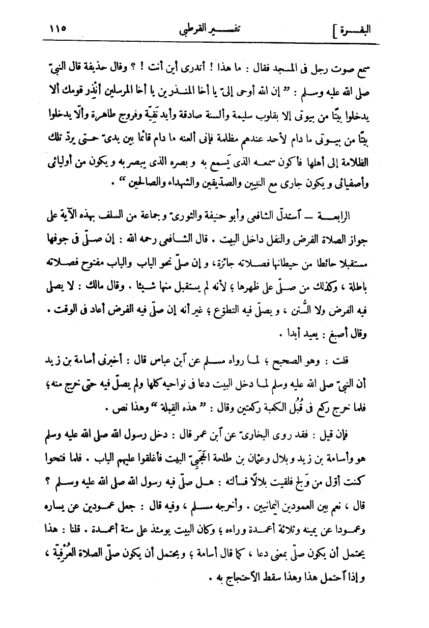 سَمِعَ صَوْتَ رَجُلٍ فِي الْمَسْجِدِ فَقَالَ: مَا هَذَا! أَتَدْرِي أَيْنَ أَنْتَ!؟ وَقَالَ حُذَيْفَةُ قَالَ النَّبِيُّ صَلَّى اللَّهُ عَلَيْهِ وَسَلَّمَ: (إِنَّ اللَّهَ أَوْحَى إِلَيَّ يَا أَخَا الْمُنْذِرِينَ يَا أَخَا الْمُرْسَلِينَ أَنْذِرْ قَوْمَكَ أَلَّا يَدْخُلُوا بَيْتًا مِنْ بُيُوتِي إِلَّا بِقُلُوبٍ سَلِيمَةٍ وَأَلْسِنَةٍ صَادِقَةٍ وَأَيْدٍ نَقِيَّةٍ وَفُرُوجٍ طَاهِرَةٍ وَأَلَّا يَدْخُلُوا بَيْتًا مِنْ بُيُوتِي مَا دَامَ لِأَحَدٍ عِنْدَهُمْ مَظْلِمَةٌ فَإِنِّي أَلْعَنُهُ مَا دَامَ قَائِمًا بَيْنَ يَدَيَّ حَتَّى يَرُدَّ تِلْكَ الظُّلَامَةَ إِلَى أَهْلِهَا فَأَكُونَ سَمْعَهُ الَّذِي يَسْمَعُ بِهِ وَبَصَرَهُ الَّذِي يُبْصِرُ بِهِ وَيَكُونَ مِنْ أَوْلِيَائِي وَأَصْفِيَائِي وَيَكُونَ جَارِي مَعَ النَّبِيِّينَ وَالصِّدِّيقِينَ وَالشُّهَداءِ وَالصَّالِحِينَ (. الرَّابِعَةُ- اسْتَدَلَّ الشَّافِعِيُّ وَأَبُو حَنِيفَةَ وَالثَّوْرِيُّ وَجَمَاعَةٌ مِنَ السَّلَفِ بِهَذِهِ الْآيَةِ عَلَى جَوَازِ الصَّلَاةِ الْفَرْضِ وَالنَّفْلِ دَاخِلَ الْبَيْتِ. قَالَ الشَّافِعِيُّ رَحِمَهُ اللَّهُ: إِنْ صَلَّى فِي جَوْفِهَا مُسْتَقْبِلًا حَائِطًا مِنْ حِيطَانِهَا فَصَلَاتَهُ جَائِزَةٌ، وَإِنْ صَلَّى نَحْوَ الْبَابِ وَالْبَابِ مَفْتُوحٌ فَصَلَاتُهُ بَاطِلَةٌ، وَكَذَلِكَ مَنْ صَلَّى عَلَى ظَهْرِهَا، لِأَنَّهُ لَمْ يَسْتَقْبِلْ مِنْهَا شَيْئًا. وَقَالَ مَالِكٌ: لَا يُصَلَّى فِيهِ الْفَرْضُ وَلَا السُّنَنُ، وَيُصَلَّى فِيهِ التَّطَوُّعُ، غَيْرَ أَنَّهُ إِنْ صَلَّى فِيهِ الْفَرْضُ أَعَادَ فِي الْوَقْتِ. وَقَالَ أَصْبَغُ: يُعِيدُ أَبَدًا. قُلْتُ: وَهُوَ الصَّحِيحُ، لِمَا رَوَاهُ مُسْلِمٌ عَنِ ابْنِ عَبَّاسٍ قَالَ: أَخْبَرَنِي أُسَامَةُ بْنُ زَيْدٍ أَنَّ النَّبِيَّ صَلَّى اللَّهُ عَلَيْهِ وَسَلَّمَ لَمَّا دَخَلَ الْبَيْتَ دَعَا فِي نَوَاحِيهِ كُلِّهَا وَلَمْ يُصَلِّ فِيهِ حَتَّى خَرَجَ مِنْهُ، فَلَمَّا خَرَجَ رَكَعَ فِي قُبُلِ الْكَعْبَةِ رَكْعَتَيْنِ وَقَالَ: (هَذِهِ الْقِبْلَةُ) وَهَذَا نَصٌّ. فَإِنْ قِيلَ: فَقَدْ رَوَى الْبُخَارِيُّ عَنِ ابْنِ عُمَرَ قَالَ: دَخَلَ رَسُولُ اللَّهِ صَلَّى اللَّهُ عَلَيْهِ وَسَلَّمَ هُوَ وَأُسَامَةُ بْنُ زَيْدٍ وَبِلَالٌ وَعُثْمَانُ بْنُ طَلْحَةَ الْحَجَبِيُّ الْبَيْتَ فَأَغْلَقُوا عَلَيْهِمُ الْبَابَ. فَلَمَّا فَتَحُوا كُنْتُ أَوَّلَ مَنْ وَلَجَ فَلَقِيتُ بِلَالًا فَسَأَلْتُهُ: هَلْ صَلَّى فِيهِ رَسُولُ اللَّهِ صَلَّى اللَّهُ عَلَيْهِ وَسَلَّمَ؟ قَالَ، نَعَمْ بَيْنَ الْعَمُودَيْنِ الْيَمَانِيَيْنِ. وَأَخْرَجَهُ مُسْلِمٌ، وَفِيهِ قَالَ: جَعَلَ عَمُودَيْنِ عَنْ يَسَارِهِ وَعَمُودًا عَنْ يَمِينِهِ وَثَلَاثَةُ أَعْمِدَةٍ وَرَاءَهُ، وَكَانَ الْبَيْتُ يَوْمئِذٍ عَلَى سِتَّةِ أَعْمِدَةٍ. قُلْنَا: هَذَا يَحْتَمِلُ أَنْ يَكُونَ صَلَّى بِمَعْنَى دَعَا، كَمَا قَالَ أُسَامَةُ، وَيَحْتَمِلُ أَنْ يَكُونَ صَلَّى الصَّلَاةَ الْعُرْفِيَّةَ، وَإِذَا احْتَمَلَ هَذَا وَهَذَا سَقَطَ الاحتجاج به.