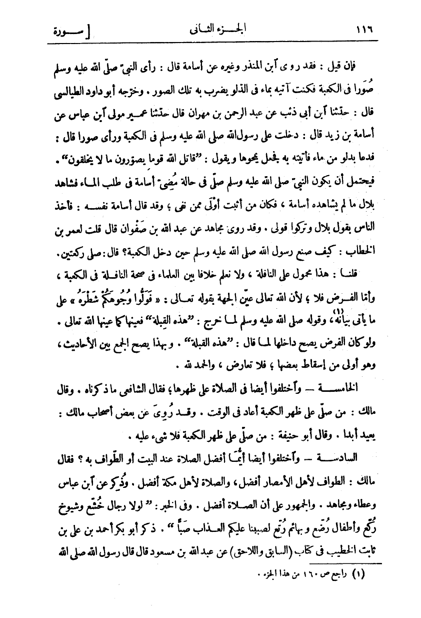 فَإِنْ قِيلَ: فَقَدْ رَوَى ابْنُ الْمُنْذِرِ وَغَيْرُهُ عَنْ أُسَامَةَ قَالَ: رَأَى النَّبِيُّ صَلَّى اللَّهُ عَلَيْهِ وَسَلَّمَ صُوَرًا فِي الْكَعْبَةِ فَكُنْتُ آتِيهِ بِمَاءٍ فِي الدَّلْوِ يَضْرِبُ بِهِ تِلْكَ الصُّوَرَ. وَخَرَّجَهُ أَبُو دَاوُدَ الطَّيَالِسِيُّ قَالَ: حَدَّثَنَا ابْنُ أَبِي ذِئْبٍ عَنْ عَبْدِ الرَّحْمَنِ بْنِ مِهْرَانَ قَالَ حَدَّثَنَا عُمَيْرٌ مَوْلَى ابْنِ عَبَّاسٍ عَنْ أُسَامَةَ بْنِ زَيْدٍ قَالَ: دَخَلْتُ عَلَى رَسُولِ اللَّهِ صَلَّى اللَّهُ عَلَيْهِ وَسَلَّمَ فِي الْكَعْبَةِ وَرَأَى صُوَرًا قَالَ: فَدَعَا بِدَلْوٍ مِنْ مَاءٍ فَأَتَيْتُهُ بِهِ فَجَعَلَ يَمْحُوهَا وَيَقُولُ: (قَاتَلَ اللَّهُ قَوْمًا يُصَوِّرُونَ مَا لَا يَخْلُقُونَ). فَيُحْتَمَلُ أَنْ يَكُونَ النَّبِيُّ صَلَّى اللَّهُ عَلَيْهِ وَسَلَّمَ صَلَّى فِي حَالَةِ مُضِيِّ أُسَامَةَ فِي طَلَبِ الْمَاءِ فَشَاهَدَ بِلَالٌ مَا لَمْ يُشَاهِدْهُ أُسَامَةُ، فَكَانَ مَنْ أَثْبَتَ أَوْلَى مِمَّنْ نَفَى، وَقَدْ قَالَ أُسَامَةُ نَفْسُهُ: فَأَخَذَ النَّاسُ بِقَوْلِ بِلَالٍ وَتَرَكُوا قَوْلِي. وَقَدْ رَوَى مُجَاهِدٌ عَنْ عَبْدِ اللَّهِ بْنِ صَفْوَانَ قَالَ: قُلْتُ لِعُمَرَ بْنِ الْخَطَّابِ: كَيْفَ صَنَعَ رَسُولُ اللَّهِ صَلَّى اللَّهُ عَلَيْهِ وَسَلَّمَ حِينَ دَخَلَ الْكَعْبَةَ؟ قَالَ: صَلَّى رَكْعَتَيْنِ. قُلْنَا: هَذَا مَحْمُولٌ عَلَى النَّافِلَةِ، وَلَا نَعْلَمُ خِلَافًا بَيْنَ الْعُلَمَاءِ فِي صِحَّةِ النَّافِلَةِ فِي الْكَعْبَةِ، وَأَمَّا الْفَرْضُ فَلَا، لِأَنَّ اللَّهَ تَعَالَى عَيَّنَ الْجِهَةَ بِقَوْلِهِ تَعَالَى:" فَوَلُّوا وُجُوهَكُمْ شَطْرَهُ" عَلَى مَا يَأْتِي بَيَانُهُ «١»، وَقَوْلُهُ صَلَّى اللَّهُ عَلَيْهِ وَسَلَّمَ لَمَّا خَرَجَ: (هَذِهِ الْقِبْلَةُ) فَعَيَّنَهَا كَمَا عَيَّنَهَا اللَّهُ تَعَالَى. وَلَوْ كَانَ الْفَرْضُ يَصِحُّ دَاخِلَهَا لَمَا قَالَ: (هَذِهِ الْقِبْلَةُ). وَبِهَذَا يَصِحُّ الْجَمْعُ بَيْنَ الْأَحَادِيثِ، وَهُوَ أَوْلَى مِنْ إِسْقَاطِ بَعْضِهَا، فَلَا تَعَارُضَ، وَالْحَمْدُ لِلَّهِ. الْخَامِسَةُ- وَاخْتَلَفُوا أَيْضًا فِي الصَّلَاةِ عَلَى ظَهْرِهَا، فَقَالَ الشَّافِعِيُّ مَا ذَكَرْنَاهُ. وَقَالَ مَالِكٌ: مَنْ صَلَّى عَلَى ظَهْرِ الْكَعْبَةِ أَعَادَ فِي الْوَقْتِ. وَقَدْ روي عن بعض أصحاب مالك: يعيدا أَبَدًا. وَقَالَ أَبُو حَنِيفَةَ: مَنْ صَلَّى عَلَى ظهر الكعبة فلا شي عَلَيْهِ. السَّادِسَةُ- وَاخْتَلَفُوا أَيْضًا أَيُّمَا أَفْضَلُ الصَّلَاةُ عِنْدَ الْبَيْتِ أَوِ الطَّوَافُ بِهِ؟ فَقَالَ مَالِكٌ: الطَّوَافُ لِأَهْلِ الْأَمْصَارِ أَفْضَلُ، وَالصَّلَاةُ لِأَهْلِ مَكَّةَ أَفْضَلُ. وَذُكِرَ عَنِ ابْنِ عَبَّاسٍ وَعَطَاءٍ وَمُجَاهِدٍ. وَالْجُمْهُورُ عَلَى أَنَّ الصَّلَاةَ أَفْضَلُ. وَفِي الْخَبَرِ: (لَوْلَا رِجَالٌ خُشَّعٌ وَشُيُوخٌ رُكَّعٌ وَأَطْفَالٌ رُضَّعٌ وَبَهَائِمُ رُتَّعٌ لَصَبَبْنَا عَلَيْكُمُ الْعَذَابَ صَبًّا). وَذَكَرَ أَبُو بَكْرٍ أَحْمَدُ بْنُ عَلِيِّ بْنِ ثَابِتٍ الْخَطِيبُ فِي كِتَابِ (السَّابِقِ وَاللَّاحِقِ) عَنْ عَبْدِ اللَّهِ بْنِ مَسْعُودٍ قَالَ: قَالَ رَسُولُ اللَّهِ صلى الله