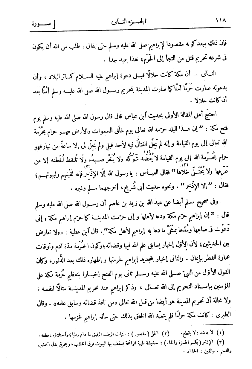 فَإِنَّ ذَلِكَ يُبْعِدُ كَوْنَهُ مَقْصُودًا لِإِبْرَاهِيمَ صَلَّى اللَّهُ عَلَيْهِ وَسَلَّمَ حَتَّى يُقَالَ: طَلَبَ مِنَ اللَّهِ أَنْ يَكُونَ فِي شَرْعِهِ تَحْرِيمُ قَتْلِ مَنِ الْتَجَأَ إِلَى الْحَرَمِ، هَذَا بَعِيدٌ جِدًّا. الثَّانِي- أَنَّ مَكَّةَ كَانَتْ حَلَالًا قَبْلَ دَعْوَةِ إِبْرَاهِيمَ عَلَيْهِ السَّلَامُ كَسَائِرِ الْبِلَادِ، وَأَنَّ بِدَعْوَتِهِ صَارَتْ حَرَمًا آمِنًا كَمَا صَارَتْ الْمَدِينَةُ بِتَحْرِيمِ رَسُولِ اللَّهِ صَلَّى اللَّهُ عَلَيْهِ وَسَلَّمَ آمِنًا بَعْدَ أَنْ كَانَتْ حَلَالًا. احْتَجَّ أَهْلُ الْمَقَالَةِ الْأُولَى بِحَدِيثِ ابْنِ عَبَّاسٍ قَالَ قَالَ رَسُولُ اللَّهِ صَلَّى اللَّهُ عَلَيْهِ وَسَلَّمَ يَوْمَ فَتْحِ مَكَّةَ (إِنَّ هَذَا الْبَلَدَ حَرَّمَهُ اللَّهُ تَعَالَى يوم خلق السموات والأرض فهو حرام بحرمة الله تعالى إلى يَوْمِ الْقِيَامَةِ وَإِنَّهُ لَمْ يَحِلَّ الْقِتَالُ فِيهِ لِأَحَدٍ قَبْلِي وَلَمْ يَحِلَّ لِي إِلَّا سَاعَةً مِنْ نَهَارٍ فَهُوَ حَرَامٌ بِحُرْمَةِ اللَّهِ إِلَى يَوْمِ الْقِيَامَةِ لَا يُعْضَدُ «١» شَوْكُهُ وَلَا يُنَفَّرُ صَيْدُهُ وَلَا تُلْتَقَطُ لُقَطَتُهُ إِلَّا مَنْ عَرَّفَهَا وَلَا يُخْتَلَى خَلَاهَا «٢» (فَقَالَ الْعَبَّاسُ: يَا رَسُولَ اللَّهِ إِلَّا الْإِذْخِرُ «٣» فَإِنَّهُ لِقَيْنِهِمْ وَلِبُيُوتِهِمْ، فَقَالَ:) إِلَّا الْإِذْخِرُ (. وَنَحْوُهُ حَدِيثُ أَبِي شُرَيْحٍ، أَخْرَجَهُمَا مُسْلِمٌ وَغَيْرُهُ. وَفِي صَحِيحِ مُسْلِمٍ أَيْضًا عَنْ عَبْدِ اللَّهِ بْنِ زَيْدِ بْنِ عَاصِمٍ أَنَّ رسول الله صَلَّى اللَّهُ عَلَيْهِ وَسَلَّمَ قال: (إِنَّ إِبْرَاهِيمَ حَرَّمَ مَكَّةَ وَدَعَا لِأَهْلِهَا وَإِنِّي حَرَّمْتُ الْمَدِينَةَ كَمَا حَرَّمَ إِبْرَاهِيمُ مَكَّةَ وَإِنِّي دَعَوْتُ فِي صَاعِهَا وَمُدَّهَا بِمِثْلَيْ مَا دَعَا بِهِ إِبْرَاهِيمُ لِأَهْلِ مَكَّةَ (. قَالَ ابْنُ عَطِيَّةَ:" وَلَا تَعَارُضَ بَيْنَ الْحَدِيثَيْنِ، لِأَنَّ الْأَوَّلَ إِخْبَارٌ بِسَابِقِ عِلْمِ اللَّهِ فِيهَا وَقَضَائِهِ، وَكَوْنُ الْحُرْمَةِ مُدَّةُ آدَمَ وَأَوْقَاتُ عِمَارَةِ الْقُطْرِ بِإِيمَانٍ. وَالثَّانِي إِخْبَارٌ بِتَجْدِيدِ إِبْرَاهِيمَ لِحُرْمَتِهَا وَإِظْهَارِهِ ذَلِكَ بَعْدَ الدُّثُورِ، وَكَانَ الْقَوْلُ الْأَوَّلُ مِنَ النَّبِيِّ صَلَّى اللَّهُ عَلَيْهِ وَسَلَّمَ ثَانِيَ يَوْمِ الْفَتْحِ إِخْبَارًا بِتَعْظِيمِ حُرْمَةِ مَكَّةَ عَلَى الْمُؤْمِنِينَ بِإِسْنَادِ التَّحْرِيمِ إِلَى اللَّهِ تَعَالَى، وَذَكَرَ إِبْرَاهِيمُ عِنْدَ تَحْرِيمِ الْمَدِينَةِ مِثَالًا لِنَفْسِهِ، وَلَا مَحَالَةَ أَنَّ تَحْرِيمَ الْمَدِينَةِ هُوَ أَيْضًا مِنْ قِبَلِ اللَّهِ تَعَالَى وَمِنْ نَافِذِ قَضَائِهِ وَسَابِقِ عِلْمِهِ". وَقَالَ الطَّبَرِيُّ: كَانَتْ مَكَّةُ حَرَامًا فَلَمْ يَتَعَبَّدِ اللَّهُ الْخَلْقَ بذلك حتى سأله إبراهيم فحرمها.
