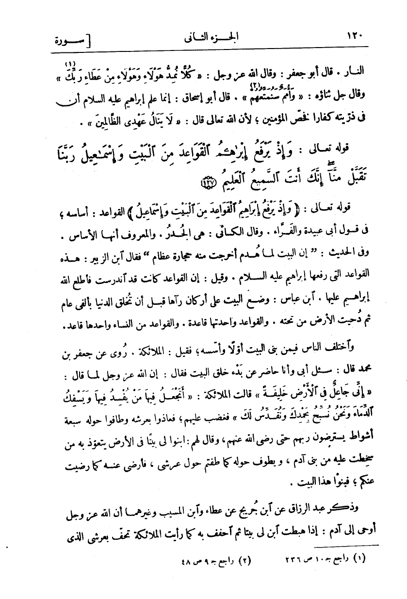 قَوْلُهُ تَعَالَى: (وَإِذْ يَرْفَعُ إِبْراهِيمُ الْقَواعِدَ مِنَ الْبَيْتِ وَإِسْماعِيلُ" الْقَوَاعِدُ: أَسَاسُهُ، فِي قَوْلِ أَبِي عُبَيْدَةَ وَالْفَرَّاءِ. وَقَالَ الْكِسَائِيُّ: هِيَ الْجُدُرُ. وَالْمَعْرُوفُ أَنَّهَا الْأَسَاسُ. وَفِي الْحَدِيثِ: (إِنَّ الْبَيْتَ لَمَّا هُدِمَ أُخْرِجَتْ مِنْهُ حِجَارَةٌ عِظَامٌ) فَقَالَ ابْنُ الزُّبَيْرِ: هَذِهِ الْقَوَاعِدُ الَّتِي رَفَعَهَا إِبْرَاهِيمُ عَلَيْهِ السَّلَامُ. وَقِيلَ: إِنَّ الْقَوَاعِدَ كَانَتْ قَدِ انْدَرَسَتْ فَأَطْلَعَ اللَّهُ إِبْرَاهِيمَ عَلَيْهَا. ابْنُ عَبَّاسٍ: وَضَعَ الْبَيْتَ عَلَى أَرْكَانٍ رَآهَا قَبْلَ أَنْ تُخْلَقَ الدُّنْيَا بِأَلْفَيْ عَامٍ ثُمَّ دُحِيَتِ الْأَرْضُ مِنْ تَحْتِهِ. وَالْقَوَاعِدُ وَاحِدَتُهَا قَاعِدَةٌ. وَالْقَوَاعِدُ مِنَ النِّسَاءِ وَاحِدهَا قَاعِدٌ. وَاخْتَلَفَ النَّاسُ فِيمَنْ بَنَى الْبَيْتَ أَوَّلًا وَأَسَّسَهُ، فَقِيلَ: الْمَلَائِكَةُ. رُوِيَ عَنْ جَعْفَرٍ بْنِ مُحَمَّدٍ قَالَ: سُئِلَ أَبِي وَأَنَا حَاضِرٌ عَنْ بَدْءِ خَلْقِ الْبَيْتِ فَقَالَ: إِنَّ اللَّهَ عَزَّ وَجَلَّ لَمَّا قَالَ:" إِنِّي جاعِلٌ فِي الْأَرْضِ خَلِيفَةً" قَالَتِ الْمَلَائِكَةُ:" أَتَجْعَلُ فِيها مَنْ يُفْسِدُ فِيها وَيَسْفِكُ الدِّماءَ وَنَحْنُ نُسَبِّحُ بِحَمْدِكَ وَنُقَدِّسُ لَكَ" فَغَضِبَ عَلَيْهِمْ، فَعَاذُوا بِعَرْشِهِ وَطَافُوا حَوْلَهُ سَبْعَةَ أَشْوَاطٍ يَسْتَرْضُونَ رَبَّهُمْ حَتَّى رَضِيَ اللَّهُ عَنْهُمْ، وَقَالَ لَهُمُ: ابْنُوا لِي بَيْتًا فِي الْأَرْضِ يَتَعَوَّذُ بِهِ مَنْ سَخِطْتُ عَلَيْهِ مِنْ بَنِي آدَمَ، وَيَطُوفُ حَوْلَهُ كَمَا طُفْتُمْ حَوْلَ عَرْشِي، فَأَرْضَى عَنْهُ كَمَا رَضِيَتْ عَنْكُمْ، فَبَنَوْا هَذَا الْبَيْتَ. وَذَكَرَ عَبْدُ الرَّزَّاقِ عَنِ ابْنِ جُرَيْجٍ عَنْ عَطَاءٍ وَابْنِ الْمُسَيَّبِ وَغَيْرِهِمَا أَنَّ اللَّهَ عَزَّ وَجَلَّ أَوْحَى إِلَى آدَمَ: إِذَا هَبَطْتَ ابْنِ لِي بَيْتًا ثُمَّ احْفُفْ بِهِ كَمَا رَأَيْتَ الْمَلَائِكَةَ تَحُفُّ بِعَرْشِي الَّذِي