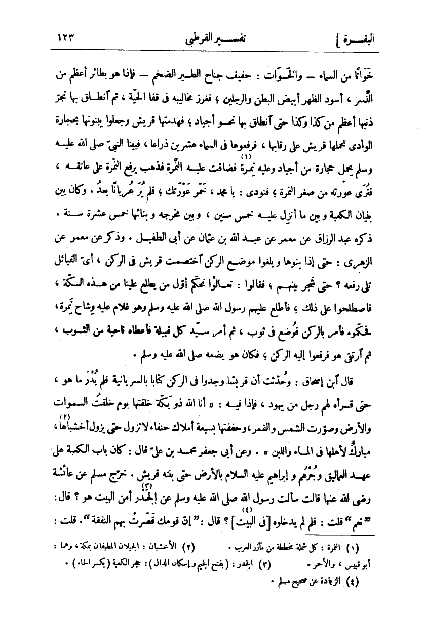 خَوَاتًا مِنَ السَّمَاءِ- وَالْخَوَاتُ: حَفِيفُ جَنَاحِ الطَّيْرِ الضَّخْمِ- فَإِذَا هُوَ بِطَائِرٍ أَعْظَمَ مِنَ النَّسْرِ، أَسْوَدَ الظَّهْرِ أَبْيَضَ الْبَطْنِ وَالرِّجْلَيْنِ، فَغَرَزَ مَخَالِيبَهُ فِي قَفَا الْحَيَّةِ، ثُمَّ انْطَلَقَ بِهَا تَجُرُّ ذَنَبهَا أَعْظَمَ مِنْ كَذَا وَكَذَا حَتَّى انْطَلَقَ بِهَا نَحْوَ أَجْيَادٍ، فَهَدَمَتْهَا قُرَيْشٌ وَجَعَلُوا يَبْنُونَهَا بِحِجَارَةِ الْوَادِي تَحْمِلُهَا قُرَيْشٌ عَلَى رِقَابِهَا، فَرَفَعُوهَا فِي السَّمَاءِ عِشْرِينَ ذِرَاعًا، فَبَيْنَا النَّبِيُّ صَلَّى اللَّهُ عَلَيْهِ وَسَلَّمَ يَحْمِلُ حِجَارَةً مِنْ أَجْيَادٍ وَعَلَيْهِ نَمِرَةٌ «١» فَضَاقَتْ عَلَيْهِ النَّمِرَةُ فَذَهَبَ يَرْفَعُ النَّمِرَةَ عَلَى عَاتِقِهِ، فَتُرَى عَوْرَتُهُ مِنْ صِغَرِ النَّمِرَةِ، فَنُودِيَ: يَا مُحَمَّدُ، خَمِّرْ عَوْرَتَكَ، فَلَمْ يُرَ عُرْيَانًا بَعْدُ. وَكَانَ بَيْنَ بُنْيَانِ الْكَعْبَةِ وَبَيْنَ مَا أُنْزِلَ عَلَيْهِ خَمْسُ سِنِينَ، وَبَيْنَ مَخْرَجِهِ وَبِنَائِهَا خَمْسَ عَشْرَةَ سَنَةً. ذَكَرَهُ عَبْدُ الرَّزَّاقِ عَنْ مَعْمَرٍ عَنْ عَبْدِ اللَّهِ بْنِ عُثْمَانَ عَنْ أَبِي الطُّفَيْلِ. وَذُكِرَ عَنْ مَعْمَرٍ عَنْ الزُّهْرِيِّ: حَتَّى إِذَا بَنَوْهَا وَبَلَغُوا مَوْضِعَ الرُّكْنِ اخْتَصَمَتْ قُرَيْشٌ فِي الرُّكْنِ، أَيُّ الْقَبَائِلِ تَلِي رَفْعَهُ؟ حَتَّى شَجَرَ بَيْنَهُمْ، فَقَالُوا: تَعَالَوْا نُحَكِّمُ أَوَّلَ مَنْ يَطْلُعُ عَلَيْنَا مِنْ هَذِهِ السِّكَّةِ، فَاصْطَلَحُوا عَلَى ذَلِكَ، فَاطَّلَعَ عَلَيْهِمْ رَسُولُ اللَّهِ صَلَّى اللَّهُ عَلَيْهِ وَسَلَّمَ وَهُوَ غُلَامٌ عَلَيْهِ وِشَاحُ نَمِرَةٍ، فَحَكَّمُوهُ فَأَمَرَ بِالرُّكْنِ فَوُضِعَ فِي ثَوْبٍ، ثُمَّ أَمَرَ سَيِّدَ كُلِّ قَبِيلَةٍ فَأَعْطَاهُ نَاحِيَةً مِنَ الثَّوْبِ، ثُمَّ ارْتَقَى هُوَ فَرَفَعُوا إِلَيْهِ الرُّكْنَ، فَكَانَ هُوَ يَضَعُهُ صَلَّى اللَّهُ عَلَيْهِ وَسَلَّمَ. قَالَ ابْنُ إِسْحَاقَ: وَحُدِّثْتُ أَنَّ قُرَيْشًا وَجَدُوا فِي الرُّكْنِ كِتَابًا بِالسُّرْيَانِيَّةِ فَلَمْ يُدْرِ مَا هُوَ، حَتَّى قَرَأَهُ لَهُمْ رَجُلٌ مِنْ يَهُودِ، فَإِذَا فِيهِ:" أَنَا اللَّهُ ذو بكة خلقتها يوم خلقت السموات وَالْأَرْضَ وَصَوَّرْتُ الشَّمْسَ وَالْقَمَرَ، وَحَفَفْتُهَا بِسَبْعَةِ أَمْلَاكٍ حُنَفَاءَ لَا تَزُولُ حَتَّى يَزُولَ أَخْشَبَاهَا «٢»، مُبَارَكٌ لِأَهْلِهَا فِي الْمَاءِ وَاللَّبَنِ". وَعَنْ أَبِي جَعْفَرٍ مُحَمَّدِ بْنِ عَلِيٍّ قَالَ: كَانَ بَابُ الْكَعْبَةِ عَلَى عَهْدِ الْعَمَالِيقِ وَجُرْهُمُ وَإِبْرَاهِيمَ عَلَيْهِ السَّلَامُ بِالْأَرْضِ حَتَّى بَنَتْهُ قُرَيْشٌ. خَرَّجَ مُسْلِمٌ عَنْ عَائِشَةَ رَضِيَ اللَّهُ عَنْهَا قَالَتْ: سَأَلْتُ رَسُولَ اللَّهِ صَلَّى اللَّهُ عَلَيْهِ وَسَلَّمَ عَنِ الْجَدْرِ «٣» أَمِنَ الْبَيْتِ هُوَ؟ قَالَ: (نَعَمْ) قُلْتُ: فَلِمَ لَمْ يُدْخِلُوهُ [فِي الْبَيْتِ «٤»]؟ قَالَ: (إِنَّ قَوْمَكِ قصرت بهم النفقة). قلت: