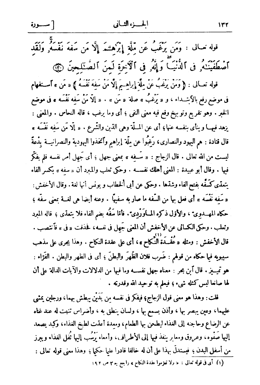 قَوْلُهُ تَعَالَى:" وَمَنْ يَرْغَبُ عَنْ مِلَّةِ إِبْراهِيمَ إِلَّا مَنْ سَفِهَ نَفْسَهُ"" مَنْ" اسْتِفْهَامٌ فِي مَوْضِعِ رَفْعٍ بِالِابْتِدَاءِ، و" يَرْغَبُ" صِلَةُ" مَنْ" ... " إِلَّا مَنْ سَفِهَ نَفْسَهُ" فِي مَوْضِعِ الْخَبَرِ. وَهُوَ تَقْرِيعٌ وَتَوْبِيخٌ وَقَعَ فِيهِ مَعْنَى النَّفْيِ، أَيْ وَمَا يَرْغَبُ، قَالَهُ النَّحَّاسُ. وَالْمَعْنَى: يَزْهَدُ فِيهَا وَيَنْأَى بِنَفْسِهِ عَنْهَا، أَيْ عَنِ الْمِلَّةِ وَهِيَ الدِّينُ وَالشَّرْعُ." إِلَّا مَنْ سَفِهَ نَفْسَهُ" قَالَ قَتَادَةُ: هُمِ الْيَهُودُ وَالنَّصَارَى، رَغِبُوا عَنْ مِلَّةِ إِبْرَاهِيمَ وَاتَّخَذُوا الْيَهُودِيَّةَ وَالنَّصْرَانِيَّةَ بِدْعَةً لَيْسَتْ مِنَ اللَّهِ تَعَالَى. قَالَ الزَّجَّاجُ:" سَفِهَ" بِمَعْنَى جَهِلَ، أَيْ جَهِلَ أَمْرَ نَفْسِهِ فَلَمْ يُفَكِّرْ فِيهَا. وَقَالَ أَبُو عُبَيْدَةَ: الْمَعْنَى أَهْلَكَ نَفْسَهُ. وَحَكَى ثَعْلَبٌ وَالْمُبَرِّدُ أَنَّ" سَفِهَ" بِكَسْرِ الْفَاءِ يَتَعَدَّى كَسَفَّهَ بِفَتْحِ الْفَاءِ وَشَدِّهَا. وَحُكِيَ عَنْ أَبِي الْخَطَّابِ وَيُونُسَ أَنَّهَا لُغَةٌ. وَقَالَ الْأَخْفَشُ:" سَفِهَ نَفْسَهُ" أَيْ فَعَلَ بِهَا مِنَ السَّفَهِ مَا صَارَ بِهِ سَفِيهًا. وَعَنْهُ أَيْضًا هِيَ لُغَةٌ بِمَعْنَى سَفَّهَ، حَكَاهُ الْمَهْدَوِيُّ، وَالْأَوَّلُ ذَكَرَهُ الْمَاوَرْدِيُّ. فَأَمَّا سَفُهَ بِضَمِ الْفَاءِ فَلَا يَتَعَدَّى، قَالَهُ الْمُبَرِّدُ وَثَعْلَبٌ. وَحَكَى الْكِسَائِيُّ عَنِ الْأَخْفَشِ أَنَّ الْمَعْنَى جَهِلَ فِي نَفْسِهِ، فَحُذِفَتْ" فِي" فَانْتَصَبَ. قَالَ الْأَخْفَشُ: وَمِثْلُهُ" عُقْدَةَ النِّكاحِ «١» "، أَيْ عَلَى عُقْدَةِ النِّكَاحِ. وَهَذَا يَجْرِي عَلَى مَذْهَبِ سِيبَوَيْهِ فِيمَا حَكَاهُ مِنْ قَوْلِهِمْ: ضَرَبَ فُلَانٌ الظَّهْرَ وَالْبَطْنَ، أَيْ فِي الظَّهْرِ وَالْبَطْنِ. الْفَرَّاءُ: هُوَ تَمْيِيزٌ. قَالَ ابْنُ بَحْرٍ: مَعْنَاهُ جَهِلَ نَفْسَهُ وَمَا فِيهَا مِنَ الدِّلَالَاتِ وَالْآيَاتِ الدَّالَّةِ عَلَى أَنَّ لَهَا صَانِعًا لَيْسَ كمثله شي، فَيُعْلَمُ بِهِ تَوْحِيدُ اللَّهِ وَقُدْرَتُهُ. قُلْتُ: وَهَذَا هُوَ مَعْنَى قَوْلِ الزَّجَّاجِ، فَيُفَكِّرُ فِي نَفْسِهِ مِنْ يَدَيْنِ يَبْطِشُ بِهِمَا، وَرِجْلَيْنِ يَمْشِي عَلَيْهِمَا، وَعَيْنٍ يُبْصِرُ بِهَا، وَأُذُنٍ يَسْمَعُ بِهَا، وَلِسَانٍ يَنْطِقُ بِهِ، وَأَضْرَاسٍ تَنْبُتُ لَهُ عِنْدَ غِنَاهُ عَنِ الرَّضَاعِ وَحَاجَتِهِ إِلَى الْغِذَاءِ لِيَطْحَنَ بِهَا الطَّعَامَ، وَمَعِدَةٍ أُعِدَّتْ لِطَبْخِ الْغِذَاءِ، وَكَبِدٍ يَصْعَدُ إِلَيْهَا صَفْوِهِ، وَعُرُوقٍ وَمَعَابِرَ يَنْفُذُ فِيهَا إِلَى الْأَطْرَافِ، وَأَمْعَاءٍ يَرْسُبُ إِلَيْهَا ثُفْلُ الْغِذَاءِ وَيَبْرُزُ مِنْ أَسْفَلِ الْبَدَنِ، فَيُسْتَدَلُّ بِهَذَا عَلَى أَنَّ لَهُ خَالِقًا قَادِرًا عَلِيمًا حَكِيمًا، وَهَذَا مَعْنَى قوله تعالى:"
