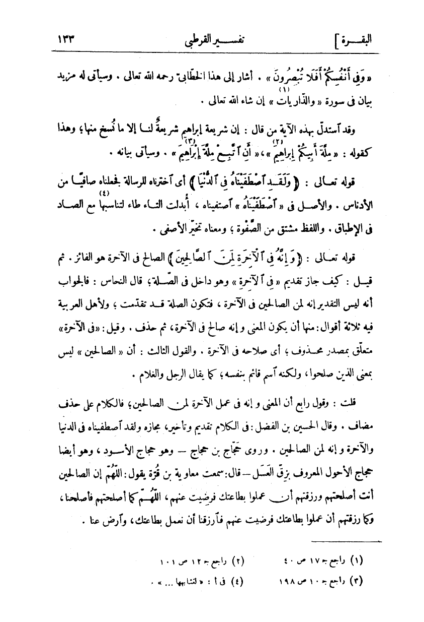 " وَفِي أَنْفُسِكُمْ أَفَلا تُبْصِرُونَ" أَشَارَ إِلَى هَذَا الْخَطَّابِيُّ رَحِمَهُ اللَّهُ تَعَالَى. وَسَيَأْتِي لَهُ مَزِيدُ بَيَانٍ فِي سُورَةِ" وَالذَّارِيَاتِ «١» " إِنْ شَاءَ اللَّهُ تَعَالَى. وَقَدِ اسْتَدَلَّ بِهَذِهِ الْآيَةِ مَنْ قَالَ: إِنَّ شَرِيعَةَ إِبْرَاهِيمَ شَرِيعَةٌ لَنَا إِلَّا مَا نُسِخَ مِنْهَا، وَهَذَا كَقَوْلِهِ:" مِلَّةَ أَبِيكُمْ إِبْراهِيمَ «٢» "،" أَنِ اتَّبِعْ مِلَّةَ إِبْراهِيمَ «٣» ". وَسَيَأْتِي بَيَانُهُ. قَوْلُهُ تَعَالَى:" وَلَقَدِ اصْطَفَيْناهُ فِي الدُّنْيا" أَيِ اخْتَرْنَاهُ لِلرِّسَالَةِ فَجَعَلْنَاهُ صَافِيًا مِنَ الْأَدْنَاسِ وَالْأَصْلُ فِي" اصْطَفَيْناهُ" اصْتَفَيْنَاهُ، أُبْدِلَتِ التَّاءُ طَاءً لِتَنَاسُبِهَا «٤» مَعَ الصَّادِ فِي الْإِطْبَاقِ. وَاللَّفْظُ مُشْتَقٌّ مِنَ الصَّفْوَةِ، وَمَعْنَاهُ تَخَيُّرُ الْأَصْفَى. قَوْلُهُ تَعَالَى:" وَإِنَّهُ فِي الْآخِرَةِ لَمِنَ الصَّالِحِينَ" الصَّالِحُ فِي الْآخِرَةِ هُوَ الْفَائِزُ. ثُمَّ قِيلَ: كَيْفَ جَازَ تَقْدِيمُ" فِي الْآخِرَةِ" وَهُوَ دَاخِلٌ فِي الصِّلَةِ، قَالَ النَّحَّاسُ: فَالْجَوَابُ أَنَّهُ لَيْسَ التَّقْدِيرُ إِنَّهُ لَمِنَ الصَّالِحِينَ فِي الْآخِرَةِ، فَتَكُونُ الصِّلَةُ قَدْ تَقَدَّمَتْ، وَلِأَهْلِ الْعَرَبِيَّةِ فِيهِ ثَلَاثَةُ أَقْوَالٍ: مِنْهَا أَنْ يَكُونَ الْمَعْنَى وَإِنَّهُ صَالِحٌ فِي الْآخِرَةِ، ثُمَّ حُذِفَ. وَقِيلَ:" فِي الْآخِرَةِ" مُتَعَلِّقٌ بِمَصْدَرٍ مَحْذُوفٍ، أَيْ صَلَاحُهُ فِي الْآخِرَةِ. وَالْقَوْلُ الثَّالِثُ: أَنَّ" الصَّالِحِينَ" لَيْسَ بِمَعْنَى الَّذِينَ صَلَحُوا، وَلَكِنَّهُ اسْمٌ قَائِمٌ بِنَفْسِهِ، كَمَا يُقَالُ الرَّجُلُ وَالْغُلَامُ. قُلْتُ: وَقَوْلٌ رَابِعٌ أَنَّ الْمَعْنَى وَإِنَّهُ فِي عَمَلِ الْآخِرَةِ لَمِنَ الصَّالِحِينَ، فَالْكَلَامُ عَلَى حَذْفِ مُضَافٍ. وَقَالَ الْحُسَيْنُ بْنُ الْفَضْلِ: فِي الْكَلَامِ تَقْدِيمٌ وَتَأْخِيرٌ، مَجَازُهُ وَلَقَدِ اصْطَفَيْنَاهُ فِي الدُّنْيَا وَالْآخِرَةِ وَإِنَّهُ لَمِنَ الصَّالِحِينَ. وَرَوَى حَجَّاجُ بْنُ حَجَّاجٍ- وَهُوَ حَجَّاجٌ الْأَسْوَدُ، وَهُوَ أَيْضًا حَجَّاجٌ الْأَحْوَلُ الْمَعْرُوفُ بِزِقِّ الْعَسَلِ- قَالَ: سَمِعْتُ مُعَاوِيَةَ بْنَ قُرَّةَ يَقُولُ: اللَّهُمَّ إِنَّ الصَّالِحِينَ أَنْتَ أَصْلَحْتَهُمْ وَرَزَقْتَهُمْ أَنْ عَمِلُوا بِطَاعَتِكَ فَرَضِيتَ عَنْهُمْ، اللَّهُمَّ كَمَا أَصْلَحْتَهُمْ فَأَصْلِحْنَا، وَكَمَا رَزَقْتَهُمْ أَنْ عَمِلُوا بِطَاعَتِكَ فَرَضِيتَ عَنْهُمْ فَارْزُقْنَا أَنْ نَعْمَلَ بِطَاعَتِكَ، وَارْضَ عنا.