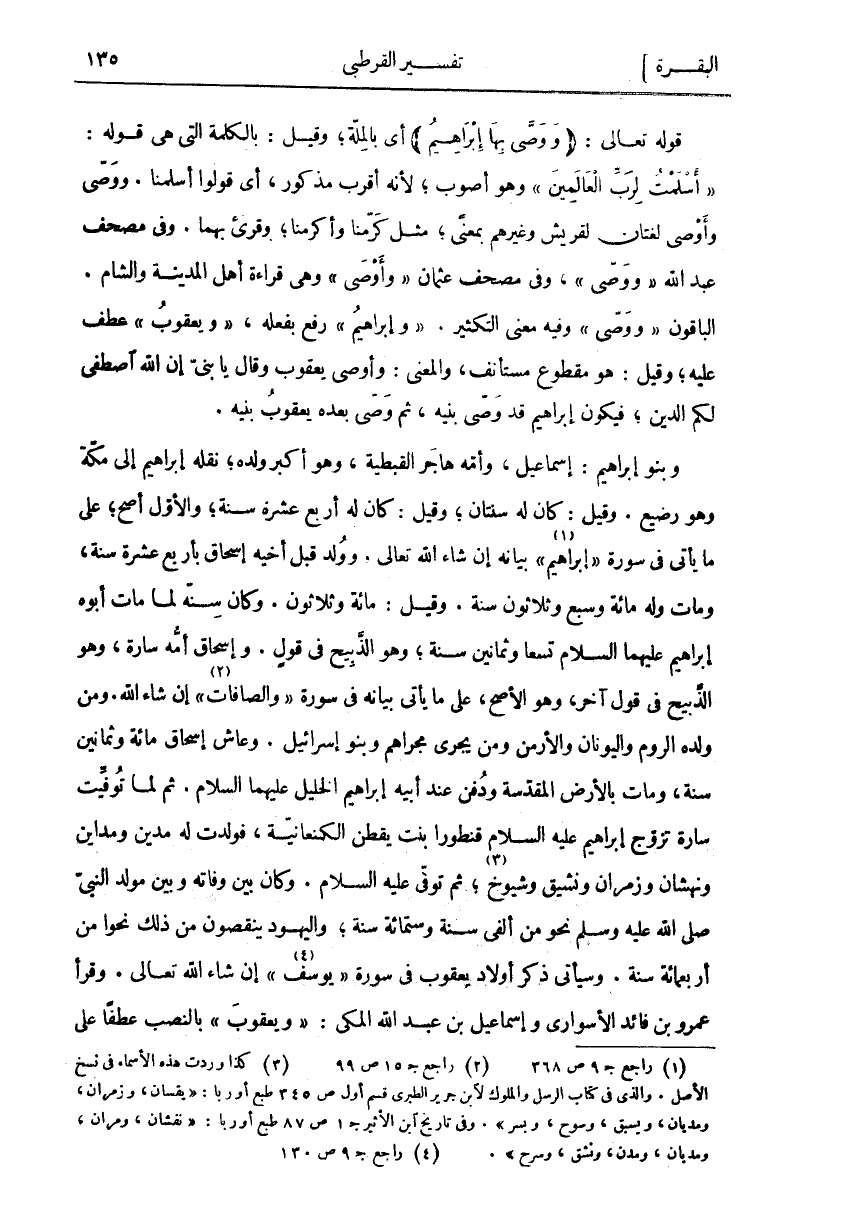 قَوْلُهُ تَعَالَى:" وَوَصَّى بِها إِبْراهِيمُ" أَيْ بِالْمِلَّةِ، وَقِيلَ: بِالْكَلِمَةِ الَّتِي هِيَ قَوْلُهُ:" أَسْلَمْتُ لِرَبِّ الْعالَمِينَ" وَهُوَ أَصْوَبُ، لِأَنَّهُ أَقْرَبُ مَذْكُورٍ، أَيْ قُولُوا أَسْلَمْنَا. وَوَصَّى وَأَوْصَى لُغَتَانِ لِقُرَيْشٍ وَغَيْرِهِمْ بمعنى، مثل كرمنا وأكرمنا، وقرى بِهِمَا. وَفِي مُصْحَفِ عَبْدِ اللَّهِ" وَوَصَّى"، وَفِي مُصْحَفِ عُثْمَانَ" وَأَوْصَى" وَهِيَ قِرَاءَةُ أَهْلِ الْمَدِينَةِ وَالشَّامِ. الْبَاقُونَ" وَوَصَّى" وَفِيهِ مَعْنَى التَّكْثِيرِ." وإِبْراهِيمُ" رُفِعَ بِفِعْلِهِ،" وَيَعْقُوبُ" عُطِفَ عَلَيْهِ، وَقِيلَ: هُوَ مَقْطُوعٌ مُسْتَأْنَفٌ، وَالْمَعْنَى: وَأَوْصَى يَعْقُوبُ وَقَالَ يَا بَنِيَّ إِنَّ اللَّهَ اصْطَفَى لَكُمُ الدِّينَ، فَيَكُونُ إِبْرَاهِيمُ قَدْ وَصَّى بَنِيهِ، ثُمَّ وَصَّى بَعْدَهُ يَعْقُوبُ بَنِيهِ. وَبَنُو إِبْرَاهِيمَ: إِسْمَاعِيلُ، وَأُمُّهُ هَاجَرُ الْقِبْطِيَّة، وَهُوَ أَكْبَرُ وَلَدِهِ، نَقَلَهُ إِبْرَاهِيمُ إِلَى مَكَّةَ وَهُوَ رَضِيعٌ. وَقِيلَ: كَانَ لَهُ سَنَتَانِ، وَقِيلَ: كَانَ لَهُ أَرْبَعَ عَشْرَةَ سَنَةً، وَالْأَوَّلُ أَصَحُّ، عَلَى مَا يَأْتِي فِي سُورَةِ" إِبْرَاهِيمَ «١» " بَيَانُهُ إِنْ شَاءَ اللَّهُ تَعَالَى: وَوُلِدَ قَبْلَ أَخِيهِ إِسْحَاقَ بِأَرْبَعَ عَشْرَةَ سَنَةً، وَمَاتَ وَلَهُ مِائَةٌ وَسَبْعٌ وَثَلَاثُونَ سَنَةً. وَقِيلَ: مِائَةٌ وَثَلَاثُونَ. وَكَانَ سِنُّهُ لَمَّا مَاتَ أَبُوهُ إِبْرَاهِيمُ عَلَيْهِمَا السَّلَامُ تِسْعًا وَثَمَانِينَ سَنَةً. وَهُوَ الذَّبِيحُ فِي قَوْلٍ. وَإِسْحَاقُ أُمُّهُ سَارَةُ، وَهُوَ الذَّبِيحُ فِي قَوْلٍ آخَرَ، وَهُوَ الْأَصَحُّ، عَلَى مَا يَأْتِي بَيَانُهُ فِي سُورَةِ" وَالصَّافَّاتِ «٢» " إِنْ شَاءَ اللَّهُ. وَمِنْ وَلَدِهِ الرُّومُ وَالْيُونَانَ وَالْأَرْمَنُ وَمَنْ يَجْرِي مَجْرَاهُمْ وَبَنُو إِسْرَائِيلَ. وَعَاشَ إِسْحَاقُ مِائَةً وَثَمَانِينَ سَنَةً، وَمَاتَ بِالْأَرْضِ الْمُقَدَّسَةِ وَدُفِنَ عِنْدَ أَبِيهِ إِبْرَاهِيمَ الْخَلِيلِ عَلَيْهِمَا السَّلَامُ. ثُمَّ لَمَّا تُوُفِّيَتْ سَارَةُ تَزَوَّجَ إِبْرَاهِيمُ عَلَيْهِ السَّلَامُ قَنْطُورَا بِنْتَ يقطن الكنعانية، فولدت له مدين ومدائن وَنَهْشَانَ وَزَمْرَانَ وَنَشِيقَ وَشُيُوخَ «٣»، ثُمَّ تُوُفِّيَ عَلَيْهِ السَّلَامُ. وَكَانَ بَيْنَ وَفَاتِهِ وَبَيْنَ مَوْلِدِ النَّبِيِّ صَلَّى اللَّهُ عَلَيْهِ وَسَلَّمَ نَحْوٌ مِنْ أَلْفَيْ سَنَةٍ وَسِتِّمِائَةِ سَنَةٍ، وَالْيَهُودُ يَنْقُصُونَ مِنْ ذَلِكَ نَحْوًا مِنْ أَرْبَعمِائَةِ سَنَةٍ. وَسَيَأْتِي ذِكْرُ أَوْلَادِ يَعْقُوبَ فِي سُورَةِ" يُوسُفَ «٤» " إِنْ شَاءَ اللَّهُ تَعَالَى. وَقَرَأَ عَمْرُو بْنُ فَائِدِ الْأَسْوَارِيُّ وَإِسْمَاعِيلُ بْنُ عَبْدِ اللَّهِ الْمَكِّيُّ:" وَيَعْقُوبَ" بِالنَّصْبِ عَطْفًا على