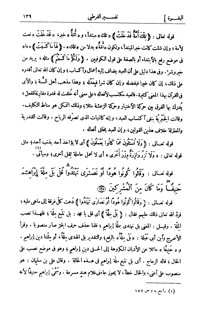قَوْلُهُ تَعَالَى:" وَقالُوا كُونُوا هُوداً أَوْ نَصارى تَهْتَدُوا" دَعَتْ كُلُّ فِرْقَةٍ إِلَى مَا هِيَ عَلَيْهِ، فَرَدَّ اللَّهُ تَعَالَى ذَلِكَ عَلَيْهِمْ فَقَالَ:" بَلْ مِلَّةَ" أَيْ قُلْ يَا مُحَمَّدُ: بَلْ نَتَّبِعُ مِلَّةَ، فَلِهَذَا نُصِبَ الْمِلَّةُ. وَقِيلَ: الْمَعْنَى بَلْ نَهْتَدِي بِمِلَّةِ إِبْرَاهِيمَ، فَلَمَّا حُذِفَ حَرْفُ الْجَرِّ صَارَ مَنْصُوبًا. وَقَرَأَ الْأَعْرَجُ وَابْنُ أَبِي عَبْلَةَ:" بَلْ مِلَّةُ" بِالرَّفْعِ، وَالتَّقْدِيرُ بَلِ الهدى ملة، أو ملتنا دين إبراهيم. و" حَنِيفاً" مَائِلًا عَنِ الْأَدْيَانِ الْمَكْرُوهَةِ إِلَى الْحَقِّ دِينِ إِبْرَاهِيمَ، وَهُوَ فِي مَوْضِعِ نَصْبٍ عَلَى الْحَالِ، قَالَهُ الزَّجَّاجُ. أَيْ بَلْ نَتَّبِعُ مِلَّةَ إِبْرَاهِيمَ فِي هَذِهِ الْحَالَةِ. وَقَالَ عَلِيُّ بْنُ سُلَيْمَانَ: هُوَ مَنْصُوبٌ عَلَى أَعْنِي، وَالْحَالُ خَطَأٌ، لَا يَجُوزُ جَاءَنِي غُلَامُ هِنْدٍ مُسْرِعَةً. وَسُمِّيَ إِبْرَاهِيمُ حنيفا لأنه