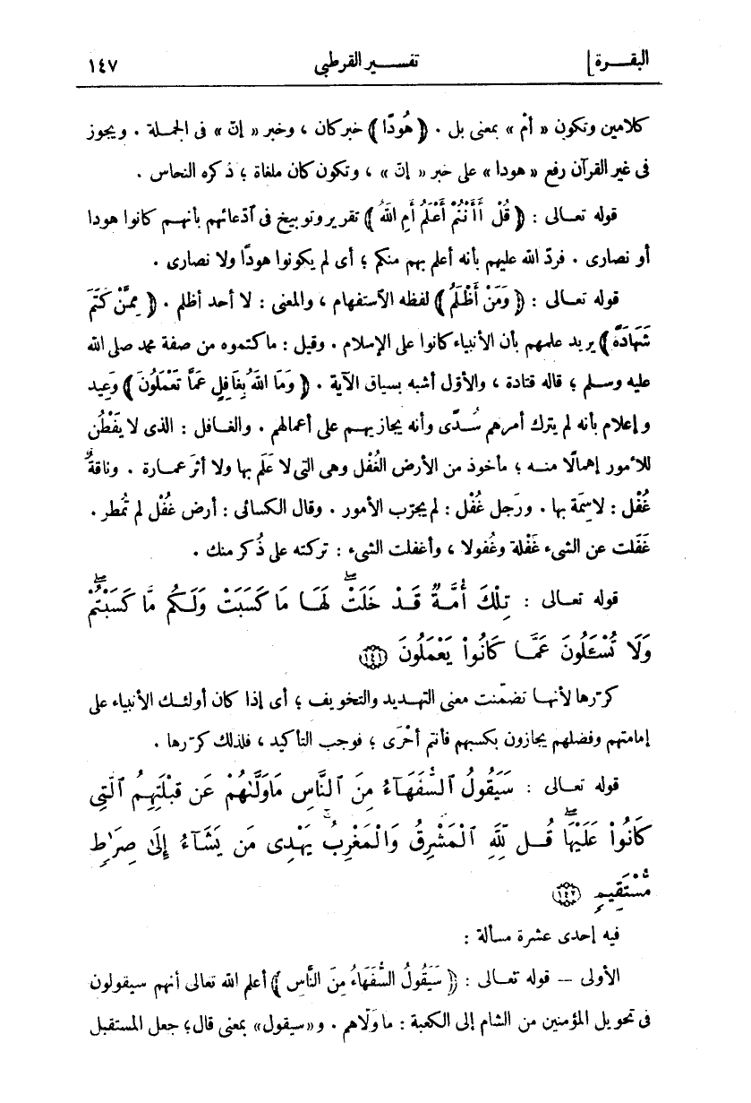 كَلَامَيْنِ وَتَكُونُ" أَمْ" بِمَعْنَى بَلْ." هُوداً" خَبَرُ كَانَ، وَخَبَرُ" إِنَّ" فِي الْجُمْلَةِ. وَيَجُوزُ فِي غَيْرِ الْقُرْآنِ رَفْعُ" هُوداً" عَلَى خَبَرِ" إِنَّ" وَتَكُونُ كَانَ مُلْغَاةً، ذَكَرَهُ النَّحَّاسُ. قَوْلُهُ تَعَالَى: قُلْ أَأَنْتُمْ أَعْلَمُ أَمِ اللَّهُ" تَقْرِيرٌ وَتَوْبِيخٌ فِي ادِّعَائِهِمْ بِأَنَّهُمْ كَانُوا هُودًا أَوْ نَصَارَى. فَرَدَّ اللَّهُ عَلَيْهِمْ بِأَنَّهُ أَعْلَمَ بِهِمْ مِنْكُمْ، أَيْ لَمْ يَكُونُوا هُودًا وَلَا نَصَارَى. قَوْلُهُ تَعَالَى:" وَمَنْ أَظْلَمُ" لَفْظُهُ الِاسْتِفْهَامُ، وَالْمَعْنَى: لَا أحد أظلم." مِمَّنْ كَتَمَ شَهادَةً" يُرِيدُ عِلْمَهُمْ بِأَنَّ الْأَنْبِيَاءَ كَانُوا عَلَى الْإِسْلَامِ. وَقِيلَ: مَا كَتَمُوهُ مِنْ صِفَةِ مُحَمَّدٍ صَلَّى اللَّهُ عَلَيْهِ وَسَلَّمَ، قَالَهُ قَتَادَةُ، وَالْأَوَّلُ أَشْبَهُ بِسِيَاقِ الْآيَةِ." وَمَا اللَّهُ بِغافِلٍ عَمَّا تَعْمَلُونَ" وَعِيدٌ وَإِعْلَامٌ بِأَنَّهُ لَمْ يَتْرُكْ أَمْرَهُمْ سُدًى وَأَنَّهُ يُجَازِيهِمْ عَلَى أَعْمَالِهِمْ. وَالْغَافِلُ: الَّذِي لَا يَفْطِنُ لِلْأُمُورِ إِهْمَالًا مِنْهُ، مَأْخُوذٌ مِنَ الْأَرْضِ الْغُفْلِ وَهِيَ الَّتِي لَا عِلْمَ بِهَا وَلَا أَثَرَ عُمَارَةٍ. وَنَاقَةٌ غُفْلٌ: لَا سِمَةَ بِهَا. وَرَجُلٌ غُفْلٌ: لَمْ يُجَرِّبِ الْأُمُورَ. وَقَالَ الْكِسَائِيُّ: أَرْضٌ غُفْلٌ لَمْ تُمْطَرْ. غَفَلْتُ عَنِ الشَّيْءِ غَفْلَةً وَغُفُولًا، وَأَغْفَلْتُ الشَّيْءَ: تَرَكْتُهُ عَلَى ذِكْرٍ منك.