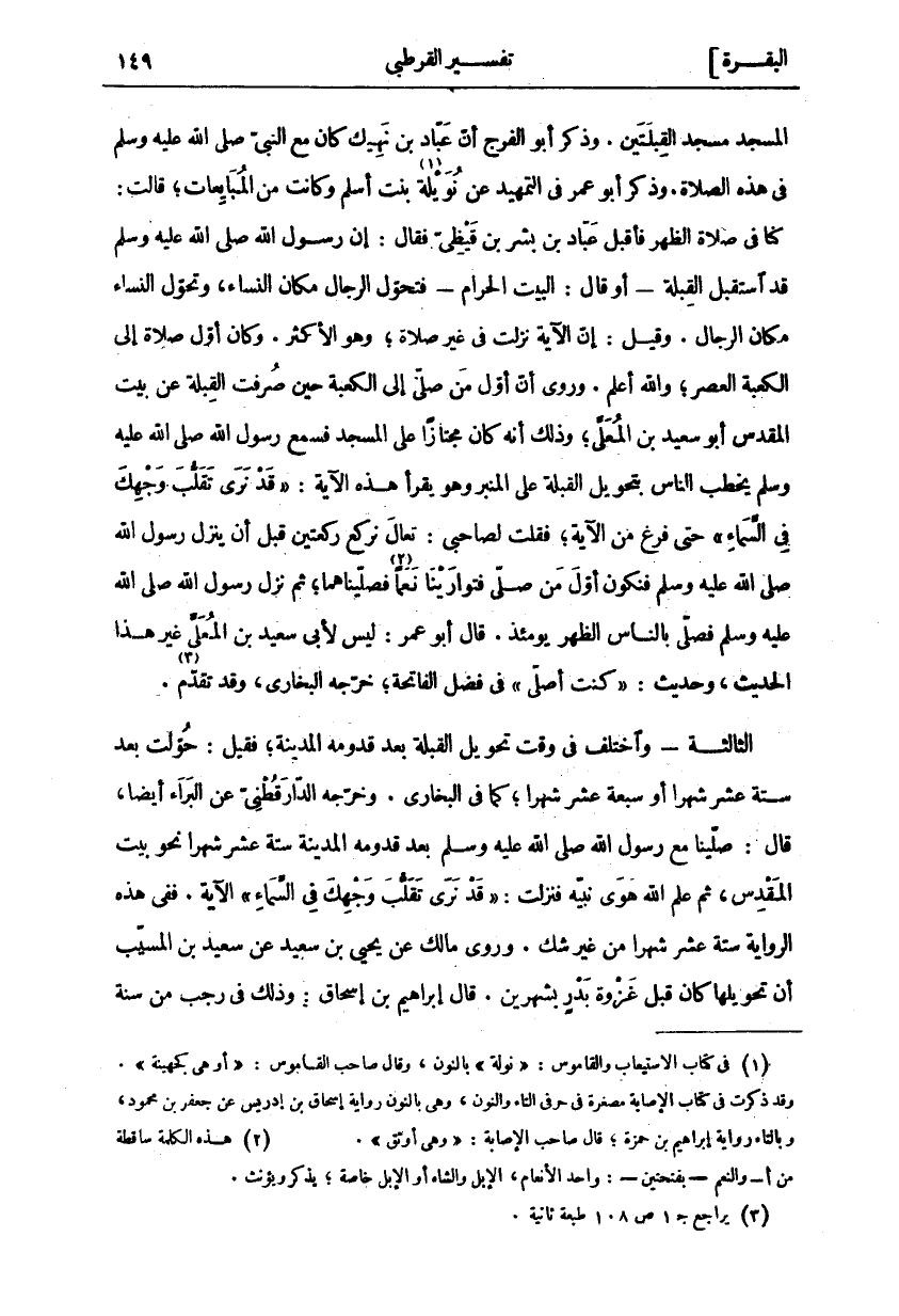 فَصَلَّيْنَاهُمَا، ثُمَّ نَزَلَ رَسُولُ اللَّهِ صَلَّى اللَّهُ عَلَيْهِ وَسَلَّمَ فَصَلَّى بِالنَّاسِ الظُّهْرَ يَوْمئِذٍ. قَالَ أَبُو عُمَرَ: لَيْسَ لِأَبِي سَعِيدِ بْنِ الْمُعَلَّى غَيْرُ هَذَا الْحَدِيثِ، وَحَدِيثُ:" كُنْتُ أُصَلِّي" فِي فَضْلِ الْفَاتِحَةِ، خَرَّجَهُ الْبُخَارِيُّ، وَقَدْ تَقَدَّمَ «٣». الثَّالِثَةُ- وَاخْتُلِفَ فِي وَقْتِ تَحْوِيلِ الْقِبْلَةِ بَعْدَ قُدُومِهِ الْمَدِينَةَ، فَقِيلَ: حُوِّلَتْ بَعْدَ سِتَّةَ عَشَرَ شَهْرًا أَوْ سَبْعَةَ عَشَرَ شَهْرًا، كَمَا فِي الْبُخَارِيِّ. وَخَرَّجَهُ الدَّارَقُطْنِيُّ عَنِ الْبَرَاءِ أَيْضًا، قَالَ: صَلَّيْنَا مَعَ رَسُولِ اللَّهِ صَلَّى اللَّهُ عَلَيْهِ وَسَلَّمَ بعد قُدُومِهِ الْمَدِينَةَ سِتَّةَ عَشَرَ شَهْرًا نَحْوَ بَيْتِ الْمَقْدِسِ، ثُمَّ عَلِمَ اللَّهُ هَوَى نَبِيِّهِ فَنَزَلَتْ:" قَدْ نَرى تَقَلُّبَ وَجْهِكَ فِي السَّماءِ" الْآيَةَ. فَفِي هَذِهِ الرِّوَايَةِ سِتَّةَ عَشَرَ شَهْرًا مِنْ غَيْرِ شَكٍّ. وَرَوَى مَالِكٌ عَنْ يَحْيَى بْنِ سَعِيدٍ عَنْ سَعِيدِ بْنِ الْمُسَيَّبِ أَنَّ تَحْوِيلَهَا كَانَ قَبْلَ غَزْوَةِ بَدْرٍ بِشَهْرَيْنِ. قَالَ إِبْرَاهِيمُ بْنُ إِسْحَاقَ: وَذَلِكَ فِي رَجَبٍ مِنْ سَنَةِ