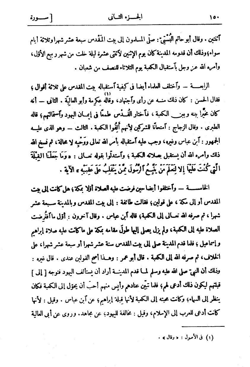 اثْنَتَيْنِ. وَقَالَ أَبُو حَاتِمٍ الْبُسْتِيُّ: صَلَّى الْمُسْلِمُونَ إِلَى بَيْتِ الْمَقْدِسِ سَبْعَةَ عَشَرَ شَهْرًا وَثَلَاثَةَ أَيَّامٍ سَوَاءً، وَذَلِكَ أَنَّ قُدُومَهُ الْمَدِينَةَ كَانَ يَوْمَ الِاثْنَيْنِ لِاثْنَتَيْ عَشْرَةَ لَيْلَةً خَلَتْ مِنْ شَهْرِ رَبِيعٍ الْأَوَّلِ، وَأَمَرَهُ اللَّهُ عَزَّ وَجَلَّ باستقبال الكعبة الثُّلَاثَاءِ لِلنِّصْفِ مِنْ شَعْبَانَ. الرَّابِعَةُ- وَاخْتَلَفَ الْعُلَمَاءُ أَيْضًا فِي كَيْفِيَّةِ اسْتِقْبَالِهِ بَيْتِ الْمَقْدِسِ عَلَى ثَلَاثَةِ أَقْوَالٍ، فَقَالَ الْحَسَنُ: كَانَ ذَلِكَ مِنْهُ عَنْ رَأْيٍ وَاجْتِهَادٍ، وَقَالَهُ «١» عِكْرِمَةُ وَأَبُو الْعَالِيَةِ. الثَّانِي- أَنَّهُ كَانَ مُخَيَّرًا بَيْنَهُ وَبَيْنَ الْكَعْبَةِ، فَاخْتَارَ الْقُدْسَ طَمَعًا فِي إِيمَانِ الْيَهُودِ وَاسْتِمَالَتِهِمْ، قَالَهُ الطَّبَرِيُّ. وَقَالَ الزَّجَّاجُ: امْتِحَانًا لِلْمُشْرِكِينَ لِأَنَّهُمْ أَلِفُوا الْكَعْبَةَ. الثَّالِثُ- وَهُوَ الَّذِي عَلَيْهِ الْجُمْهُورُ: ابْنُ عَبَّاسٍ وَغَيْرُهُ، وَجَبَ عَلَيْهِ اسْتِقْبَالُهُ بِأَمْرِ اللَّهِ تَعَالَى وَوَحْيِهِ لَا مَحَالَةَ، ثُمَّ نَسَخَ اللَّهُ ذَلِكَ وَأَمَرَهُ اللَّهُ أَنْ يَسْتَقْبِلَ بِصَلَاتِهِ الْكَعْبَةَ، وَاسْتَدَلُّوا بِقَوْلِهِ تَعَالَى:" وَما جَعَلْنَا الْقِبْلَةَ الَّتِي كُنْتَ عَلَيْها إِلَّا لِنَعْلَمَ مَنْ يَتَّبِعُ الرَّسُولَ مِمَّنْ يَنْقَلِبُ عَلى عَقِبَيْهِ" الْآيَةَ. الْخَامِسَةُ- وَاخْتَلَفُوا أَيْضًا حِينَ فُرِضَتْ عَلَيْهِ الصَّلَاةُ أَوَّلًا بِمَكَّةَ، هَلْ كَانَتْ إِلَى بَيْتِ الْمَقْدِسِ أَوْ إِلَى مَكَّةَ، عَلَى قَوْلَيْنِ، فَقَالَتْ طَائِفَةٌ: إِلَى بَيْتِ الْمَقْدِسِ وَبِالْمَدِينَةِ سَبْعَةَ عَشَرَ شَهْرًا، ثُمَّ صَرَفَهُ اللَّهُ تَعَالَى إِلَى الْكَعْبَةِ، قَالَهُ ابْنُ عَبَّاسٍ. وَقَالَ آخَرُونَ: أَوَّلُ مَا افْتُرِضَتْ الصَّلَاةُ عَلَيْهِ إِلَى الْكَعْبَةِ، وَلَمْ يَزَلْ يُصَلِّي إِلَيْهَا طُولَ مُقَامِهِ بِمَكَّةَ عَلَى مَا كَانَتْ عَلَيْهِ صَلَاةُ إِبْرَاهِيمَ وَإِسْمَاعِيلَ، فَلَمَّا قَدِمَ الْمَدِينَةَ صَلَّى إِلَى بَيْتِ الْمَقْدِسِ سِتَّةَ عَشَرَ شَهْرًا أَوْ سَبْعَةَ عَشَرَ شَهْرًا، عَلَى الْخِلَافِ، ثُمَّ صَرَفَهُ اللَّهُ إِلَى الْكَعْبَةِ. قَالَ أَبُو عُمَرَ: وَهَذَا أَصَحُّ الْقَوْلَيْنِ عِنْدِي. قَالَ غَيْرُهُ: وَذَلِكَ أَنَّ النَّبِيَّ صَلَّى اللَّهُ عَلَيْهِ وَسَلَّمَ لَمَّا قَدِمَ الْمَدِينَةَ أَرَادَ أَنْ يَسْتَأْلِفَ الْيَهُودَ فَتَوَجَّهَ [إِلَى] قِبْلَتِهِمْ لِيَكُونَ ذَلِكَ أَدْعَى لَهُمْ، فَلَمَّا تَبَيَّنَ عِنَادَهُمْ وَأَيِسَ مِنْهُمْ أَحَبَّ أَنْ يُحَوَّلَ إِلَى الْكَعْبَةَ فَكَانَ يَنْظُرُ إِلَى السَّمَاءِ، وَكَانَتْ مَحَبَّتُهُ إِلَى الْكَعْبَةِ لِأَنَّهَا قِبْلَةُ إِبْرَاهِيمَ، عَنِ ابْنِ عَبَّاسٍ. وَقِيلَ: لِأَنَّهَا كَانَتْ أَدْعَى لِلْعَرَبِ إِلَى الْإِسْلَامِ، وَقِيلَ: مُخَالَفَةً لِلْيَهُودِ، عَنْ مُجَاهِدٍ. وَرُوِيَ عن أبي العالية