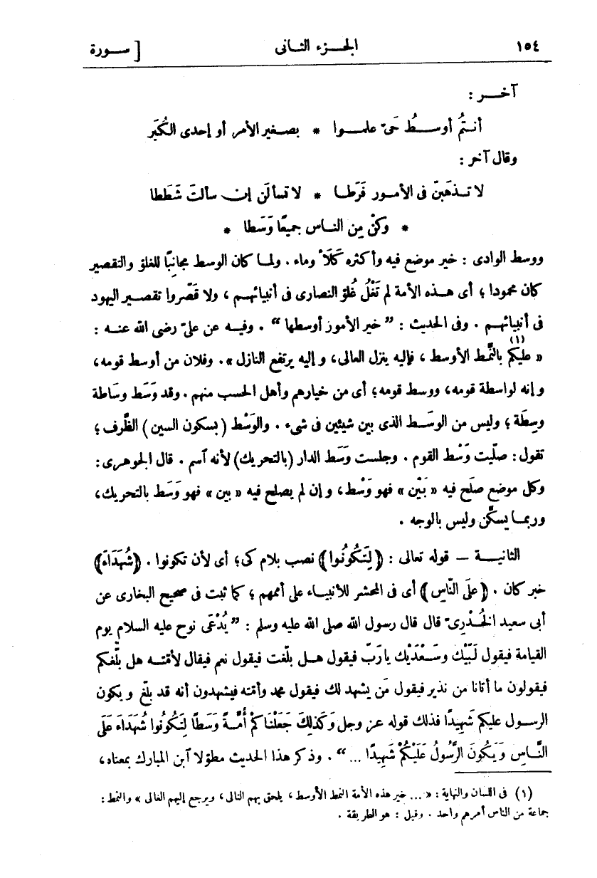 وَوَسَطُ الْوَادِي: خَيْرُ مَوْضِعٍ فِيهِ وَأَكْثَرُهُ كَلَأً وَمَاءً. ولما كان الوسط مجانبا للغلق وَالتَّقْصِيرِ كَانَ مَحْمُودًا، أَيْ هَذِهِ الْأُمَّةُ لَمْ تُغْلِ غُلُوَّ النَّصَارَى فِي أَنْبِيَائِهِمْ، وَلَا قَصَّرُوا تَقْصِيرَ الْيَهُودِ فِي أَنْبِيَائِهِمْ. وَفِي الْحَدِيثِ: (خَيْرُ الْأُمُورِ أَوْسَطُهَا). وَفِيهِ عَنْ عَلِيٍّ رَضِيَ اللَّهُ عَنْهُ:" عَلَيْكُمْ «١» بِالنَّمَطِ الْأَوْسَطِ، فَإِلَيْهِ يَنْزِلُ الْعَالِي، وَإِلَيْهِ يَرْتَفِعُ النَّازِلَ". وَفُلَانٌ مِنْ أَوْسَطِ قَوْمِهِ، وَإِنَّهُ لَوَاسِطَةُ قَوْمِهِ، وَوَسَطَ قَوْمِهِ، أَيْ مِنْ خِيَارِهِمْ وَأَهْلُ الْحَسَبِ مِنْهُمْ. وَقَدْ وَسَطَ وَسَاطَةً وَسِطَةً، وَلَيْسَ مِنَ الْوَسَطِ الَّذِي بَيْنَ شَيْئَيْنِ في شي. وَالْوَسْطُ (بِسُكُونِ السِّينِ) الظَّرْفُ، تَقُولُ: صَلَّيْتُ وَسْطَ الْقَوْمِ. وَجَلَسْتُ وَسَطَ الدَّارِ (بِالتَّحْرِيكِ) لِأَنَّهُ اسْمٌ. قَالَ الْجَوْهَرِيُّ: وَكُلُّ مَوْضِعٍ صَلُحَ فِيهِ" بَيْنَ" فَهُوَ وَسْطٌ، وَإِنْ لَمْ يَصْلُحْ فِيهِ" بَيْنَ" فَهُوَ وَسَطٌ بِالتَّحْرِيكِ، وَرُبَّمَا يُسَكَّنُ وَلَيْسَ بِالْوَجْهِ. الثَّانِيَةُ- قَوْلُهُ تَعَالَى:" لِتَكُونُوا" نُصِبَ بِلَامِ كَيْ، أي لان تكونوا." شُهَداءَ" خَبَرُ كَانَ." عَلَى النَّاسِ" أَيْ فِي الْمَحْشَرِ لِلْأَنْبِيَاءِ عَلَى أُمَمِهِمْ، كَمَا ثَبَتَ فِي صَحِيحِ الْبُخَارِيِّ عَنْ أَبِي سَعِيدٍ الْخُدْرِيِّ قَالَ قَالَ رَسُولُ اللَّهِ صَلَّى اللَّهُ عَلَيْهِ وَسَلَّمَ: (يُدْعَى نُوحٌ عَلَيْهِ السَّلَامُ يَوْمَ الْقِيَامَةِ فَيَقُولُ لَبَّيْكَ وَسَعْدَيْكَ يَا رَبِّ فَيَقُولُ هَلْ بَلَّغْتَ فَيَقُولُ نَعَمْ فَيُقَالُ لِأُمَّتِهِ هَلْ بَلَّغَكُمْ فَيَقُولُونَ مَا أَتَانَا مِنْ نَذِيرٍ فَيَقُولُ مَنْ يَشْهَدُ لَكَ فَيَقُولُ مُحَمَّدٌ وَأُمَّتُهُ فَيَشْهَدُونَ أَنَّهُ قَدْ بَلَّغَ وَيَكُونُ الرَّسُولُ عَلَيْكُمْ شَهِيدًا فَذَلِكَ قَوْلُهُ عَزَّ وَجَلَّ وَكَذلِكَ جَعَلْناكُمْ أُمَّةً وَسَطاً لِتَكُونُوا شُهَداءَ عَلَى النَّاسِ وَيَكُونَ الرَّسُولُ عَلَيْكُمْ شَهِيداً ... (. وَذَكَرَ هَذَا الْحَدِيثَ مُطَوَّلًا ابن المبارك بمعناه،