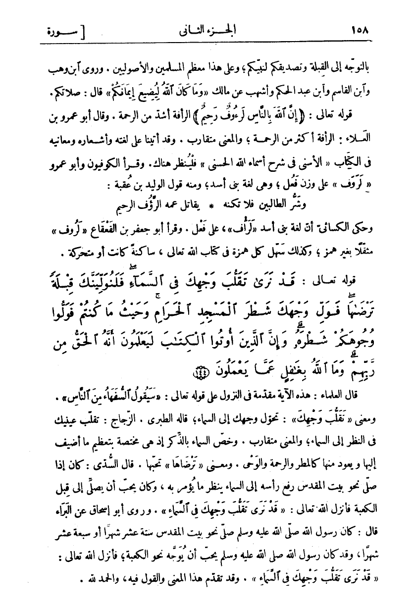 قَالَ الْعُلَمَاءُ: هَذِهِ الْآيَةُ مُقَدَّمَةٌ فِي النُّزُولِ عَلَى قَوْلِهِ تَعَالَى:" سَيَقُولُ السُّفَهاءُ مِنَ النَّاسِ". وَمَعْنَى" تَقَلُّبَ وَجْهِكَ": تَحَوُّلُ وَجْهِكَ إِلَى السَّمَاءِ، قَالَهُ الطَّبَرِيُّ. الزَّجَّاجُ: تَقَلُّبُ عَيْنَيْكَ فِي النَّظَرِ إِلَى السَّمَاءِ، وَالْمَعْنَى مُتَقَارِبٌ. وَخَصَّ السَّمَاءَ بِالذِّكْرِ إِذْ هِيَ مُخْتَصَّةٌ بِتَعْظِيمِ مَا أُضِيفَ إِلَيْهَا وَيَعُودُ مِنْهَا كَالْمَطَرِ وَالرَّحْمَةِ وَالْوَحْيِ. وَمَعْنَى" تَرْضاها" تُحِبُّهَا. قَالَ السُّدِّيُّ: كَانَ إِذَا صَلَّى نَحْوَ بَيْتِ الْمَقْدِسِ رَفَعَ رَأْسَهُ إِلَى السَّمَاءِ يَنْظُرُ مَا يُؤْمَرُ بِهِ، وَكَانَ يُحِبُّ أَنْ يُصَلِّيَ إِلَى قِبَلِ الْكَعْبَةِ فَأَنْزَلَ اللَّهُ تَعَالَى:" قَدْ نَرى تَقَلُّبَ وَجْهِكَ فِي السَّماءِ". وَرَوَى أَبُو إِسْحَاقَ عَنِ الْبَرَاءِ قَالَ: كَانَ رَسُولُ اللَّهِ صَلَّى اللَّهُ عَلَيْهِ وَسَلَّمَ صَلَّى نَحْوَ بَيْتِ الْمَقْدِسِ سِتَّةَ عَشَرَ شَهْرًا أَوْ سَبْعَةَ عَشَرَ شَهْرًا، وَقَدْ كَانَ رَسُولُ اللَّهِ صَلَّى اللَّهُ عَلَيْهِ وَسَلَّمَ يُحِبُّ أَنْ يُوَجَّهَ نَحْوَ الْكَعْبَةِ، فَأَنْزَلَ اللَّهُ تَعَالَى:" قَدْ نَرى تَقَلُّبَ وَجْهِكَ فِي السَّماءِ". وَقَدْ تَقَدَّمَ هَذَا الْمَعْنَى وَالْقَوْلُ فِيهِ، وَالْحَمْدُ لِلَّهِ.