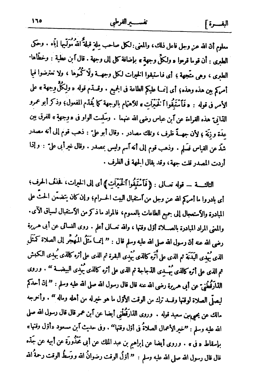 " أَيْ إِلَى الْخَيْرَاتِ، فَحَذَفَ الْحَرْفَ، أَيْ بَادِرُوا مَا أَمَرَكُمُ اللَّهُ عَزَّ وَجَلَّ مِنَ اسْتِقْبَالِ الْبَيْتِ الْحَرَامِ، وَإِنْ كَانَ يَتَضَمَّنُ الْحَثَّ عَلَى الْمُبَادَرَةِ وَالِاسْتِعْجَالِ إِلَى جَمِيعِ الطَّاعَاتِ بِالْعُمُومِ، فَالْمُرَادُ مَا ذُكِرَ مِنَ الِاسْتِقْبَالِ لِسِيَاقِ الْآيِ. وَالْمَعْنَى الْمُرَادُ الْمُبَادَرَةُ بِالصَّلَاةِ أَوَّلَ وَقْتِهَا، وَاللَّهُ تَعَالَى أَعْلَمُ. رَوَى النَّسَائِيُّ عَنْ أَبِي هُرَيْرَةَ رَضِيَ اللَّهُ عَنْهُ أَنَّ رَسُولَ اللَّهِ صَلَّى اللَّهُ عَلَيْهِ وَسَلَّمَ قَالَ: (إِنَّمَا مَثَلُ الْمُهَجِّرِ إِلَى الصَّلَاةِ كَمَثَلِ الَّذِي يُهْدِي الْبَدَنَةَ ثُمَّ الَّذِي عَلَى أَثَرِهِ كَالَّذِي يُهْدِي الْبَقَرَةَ ثُمَّ الَّذِي عَلَى أَثَرِهِ كَالَّذِي يُهْدِي الْكَبْشَ ثُمَّ الَّذِي عَلَى أَثَرِهِ كَالَّذِي يُهْدِي الدَّجَاجَةَ ثُمَّ الَّذِي عَلَى أَثَرِهِ كَالَّذِي يُهْدِي الْبَيْضَةَ (. وَرَوَى الدَّارَقُطْنِيُّ عَنْ أَبِي هُرَيْرَةَ رَضِيَ اللَّهُ عَنْهُ قَالَ قَالَ رَسُولُ اللَّهِ صَلَّى اللَّهُ عَلَيْهِ وَسَلَّمَ:) إِنَّ أَحَدَكُمْ لَيُصَلِّي الصَّلَاةَ لِوَقْتِهَا وَقَدْ تَرَكَ مِنَ الْوَقْتِ الْأَوَّلِ مَا هُوَ خَيْرٌ لَهُ مِنْ أَهْلِهِ وَمَالِهِ (. وَأَخْرَجَهُ مَالِكٌ عَنْ يَحْيَى بْنِ سَعِيدٍ قَوْلَهُ. وَرَوَى الدَّارَقُطْنِيُّ أَيْضًا عَنِ ابْنِ عُمَرَ قَالَ قَالَ رَسُولُ اللَّهِ صَلَّى اللَّهُ عَلَيْهِ وَسَلَّمَ: (خَيْرُ الْأَعْمَالِ الصَّلَاةُ فِي أَوَّلِ وَقْتِهَا). وَفِي حَدِيثِ ابْنِ مَسْعُودٍ" أَوَّلَ وَقْتِهَا" بِإِسْقَاطِ" فِي". وَرُوِيَ أَيْضًا عَنْ إِبْرَاهِيمَ بْنِ عَبْدِ الْمَلِكِ عَنْ أَبِي مَحْذُورَةَ عَنْ أَبِيهِ عَنْ جَدِّهِ قَالَ قَالَ رَسُولُ اللَّهِ صَلَّى اللَّهُ عَلَيْهِ وَسَلَّمَ: (أَوَّلُ الْوَقْتِ رِضْوَانُ اللَّهِ وَوَسَطُ الْوَقْتِ رَحْمَةُ اللَّهِ