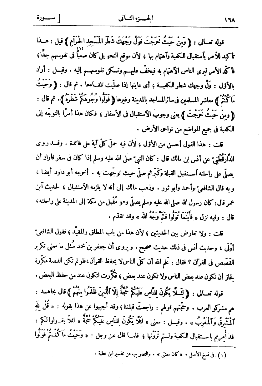 قَوْلُهُ تَعَالَى:" وَمِنْ حَيْثُ خَرَجْتَ فَوَلِّ وَجْهَكَ شَطْرَ الْمَسْجِدِ الْحَرامِ" قِيلَ: هَذَا تَأْكِيدٌ لِلْأَمْرِ بِاسْتِقْبَالِ الْكَعْبَةِ وَاهْتِمَامٌ بِهَا، لِأَنَّ مَوْقِعَ التَّحْوِيلِ كَانَ صَعْبًا «١» فِي نُفُوسِهِمْ جِدًّا، فَأَكَّدَ الْأَمْرَ لِيَرَى النَّاسُ الِاهْتِمَامَ بِهِ فَيَخِفُّ عَلَيْهِمْ وَتَسْكُنُ نُفُوسُهُمْ إِلَيْهِ. وَقِيلَ: أَرَادَ بِالْأَوَّلِ: وَلِّ وَجْهَكَ شَطْرَ الْكَعْبَةِ، أَيْ عَايِنْهَا إِذَا صَلَّيْتَ تِلْقَاءَهَا. ثم قال:" وَحَيْثُ ما كُنْتُمْ" مَعَاشِرَ الْمُسْلِمِينَ فِي سَائِرِ الْمَسَاجِدِ بِالْمَدِينَةِ وَغَيْرِهَا" فَوَلُّوا وُجُوهَكُمْ شَطْرَهُ". ثُمَّ قَالَ:" وَمِنْ حَيْثُ خَرَجْتَ" يَعْنِي وُجُوبَ الِاسْتِقْبَالِ فِي الْأَسْفَارِ، فَكَانَ هَذَا أَمْرًا بِالتَّوَجُّهِ إِلَى الْكَعْبَةِ فِي جَمِيعِ الْمَوَاضِعِ مِنْ نَوَاحِي الْأَرْضِ. قُلْتُ: هَذَا الْقَوْلُ أَحْسَنُ مِنَ الْأَوَّلِ، لِأَنَّ فِيهِ حَمْلُ كُلِّ آيَةٍ عَلَى فَائِدَةٍ. وَقَدْ رَوَى الدَّارَقُطْنِيُّ عَنْ أَنَسِ بْنِ مَالِكٍ قَالَ: كَانَ النَّبِيُّ صَلَّى اللَّهُ عَلَيْهِ وَسَلَّمَ إِذَا كَانَ فِي سَفَرٍ فَأَرَادَ أَنْ يُصَلِّيَ عَلَى رَاحِلَتِهِ اسْتَقْبَلَ الْقِبْلَةَ وَكَبَّرَ ثُمَّ صَلَّى حَيْثُ تَوَجَّهَتْ بِهِ. أَخْرَجَهُ أَبُو دَاوُدَ أَيْضًا، وَبِهِ قَالَ الشَّافِعِيُّ وَأَحْمَدُ وَأَبُو ثَوْرٍ. وَذَهَبَ مَالِكٌ إِلَى أَنَّهُ لَا يَلْزَمُهُ الِاسْتِقْبَالُ، لِحَدِيثِ ابْنِ عُمَرَ قَالَ: كَانَ رَسُولُ اللَّهِ صَلَّى اللَّهُ عَلَيْهِ وَسَلَّمَ يُصَلِّي وَهُوَ مُقْبِلٌ مِنْ مَكَّةَ إِلَى الْمَدِينَةِ عَلَى رَاحِلَتِهِ. قَالَ: وَفِيهِ نَزَلَ" فَأَيْنَما تُوَلُّوا فَثَمَّ وَجْهُ اللَّهِ" وَقَدْ تَقَدَّمَ. قُلْتُ: وَلَا تَعَارُضَ بَيْنَ الْحَدِيثَيْنِ، لِأَنَّ هَذَا مِنْ بَابِ الْمُطْلَقِ وَالْمُقَيَّدِ، فَقَوْلُ الشَّافِعِيِّ أَوْلَى، وَحَدِيثُ أَنَسٍ فِي ذَلِكَ حَدِيثٌ صَحِيحٌ. وَيُرْوَى أَنَّ جَعْفَرَ بْنَ مُحَمَّدٍ سُئِلَ مَا مَعْنَى تَكْرِيرِ الْقَصَصِ فِي الْقُرْآنِ؟ فَقَالَ: عَلِمَ اللَّهُ أَنَّ كُلَّ النَّاسِ لَا يَحْفَظُ الْقُرْآنَ، فَلَوْ لَمْ تَكُنِ الْقِصَّةُ مُكَرَّرَةً لَجَازَ أَنْ تَكُونَ عِنْدَ بَعْضِ النَّاسِ وَلَا تَكُونُ عِنْدَ بَعْضٍ، فَكُرِّرَتْ لِتَكُونَ عِنْدَ مَنْ حَفِظَ الْبَعْضَ. قَوْلُهُ تَعَالَى:" لِئَلَّا يَكُونَ لِلنَّاسِ عَلَيْكُمْ حُجَّةٌ إِلَّا الَّذِينَ ظَلَمُوا مِنْهُمْ" قَالَ مُجَاهِدٌ: هُمْ مُشْرِكُو الْعَرَبِ. وَحُجَّتُهُمْ قَوْلُهُمْ: رَاجَعْتَ قِبْلَتَنَا، وَقَدْ أُجِيبُوا عَنْ هَذَا بِقَوْلِهِ:" قُلْ لِلَّهِ الْمَشْرِقُ وَالْمَغْرِبُ". وَقِيلَ: مَعْنَى" لِئَلَّا يَكُونَ لِلنَّاسِ عَلَيْكُمْ حُجَّةٌ" لِئَلَّا يَقُولُوا لَكُمْ: قَدْ أُمِرْتُمْ بِاسْتِقْبَالِ الْكَعْبَةِ وَلَسْتُمْ تَرَوْنَهَا، فلما قال عز وجل:" وَحَيْثُ ما كُنْتُمْ فَوَلُّوا وُجُوهَكُمْ شَطْرَهُ"