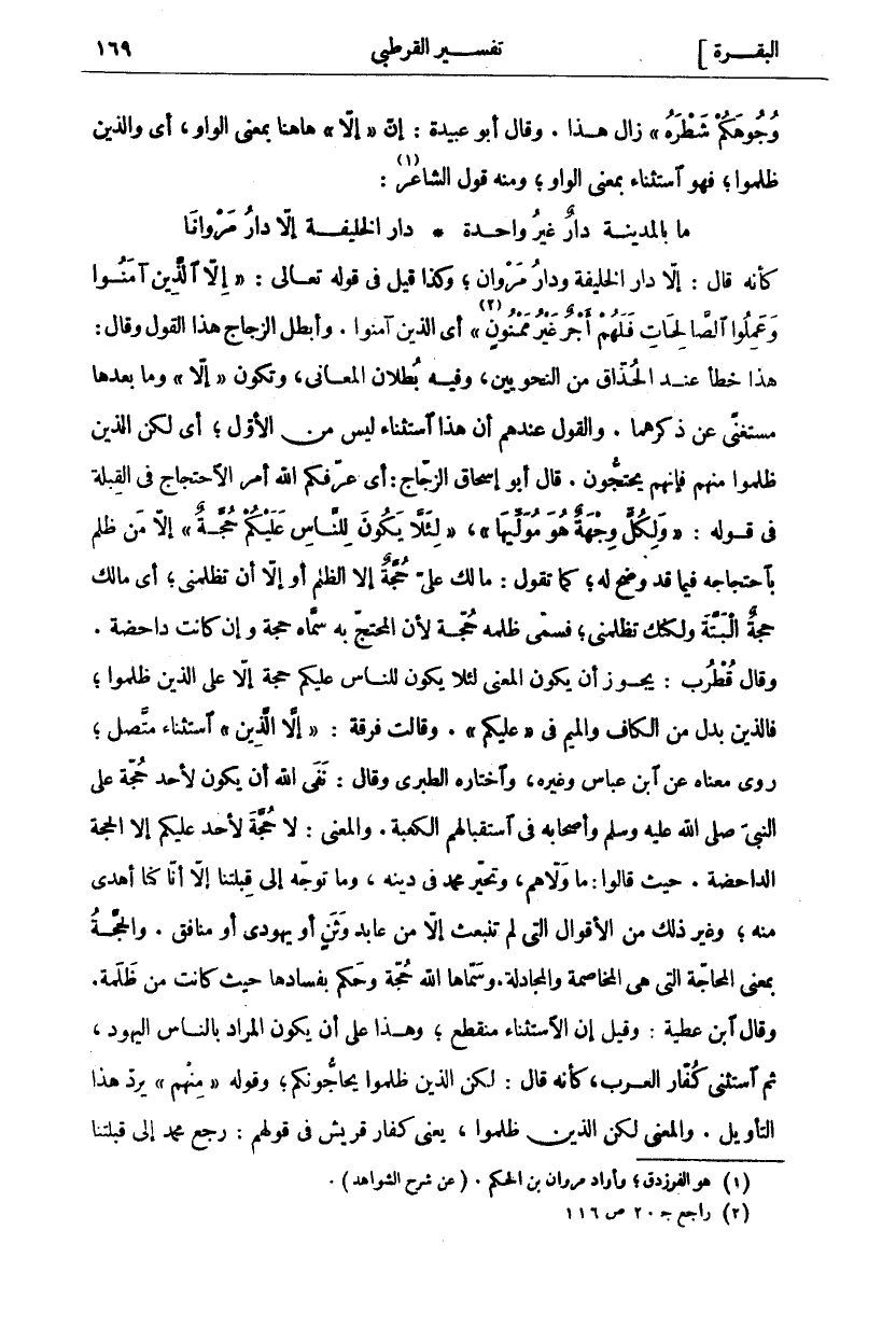 كَأَنَّهُ قَالَ: إِلَّا دَارُ الْخَلِيفَةِ وَدَارُ مَرْوَانَ، وَكَذَا قِيلَ فِي قَوْلِهِ تَعَالَى:" إِلَّا الَّذِينَ آمَنُوا وَعَمِلُوا الصَّالِحاتِ فَلَهُمْ أَجْرٌ غَيْرُ مَمْنُونٍ «٢» " أَيِ الَّذِينَ آمَنُوا. وَأَبْطَلَ الزَّجَّاجُ هَذَا الْقَوْلَ وَقَالَ: هَذَا خَطَأٌ عِنْدَ الْحُذَّاقِ مِنَ النَّحْوِيِّينَ، وَفِيهِ بُطْلَانُ الْمَعَانِي، وَتَكُونُ" إِلَّا" وَمَا بَعْدَهَا مُسْتَغْنًى عَنْ ذِكْرِهِمَا. وَالْقَوْلُ عِنْدَهُمْ أَنَّ هَذَا اسْتِثْنَاءٌ لَيْسَ مِنَ الْأَوَّلِ، أَيْ لَكِنِ الَّذِينَ ظَلَمُوا مِنْهُمْ فَإِنَّهُمْ يَحْتَجُّونَ. قَالَ أَبُو إِسْحَاقَ الزَّجَّاجُ: أَيْ عَرَّفَكُمُ اللَّهُ أمر الاحتجاج في القبلة في قوله:"- لِكُلٍّ وِجْهَةٌ هُوَ مُوَلِّيها