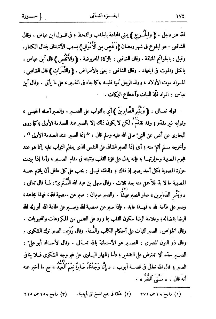 اللَّهِ عَزَّ وَجَلَّ." وَالْجُوعِ" يَعْنِي الْمَجَاعَةَ بِالْجَدْبِ وَالْقَحْطِ، فِي قَوْلِ ابْنِ عَبَّاسٍ. وَقَالَ الشَّافِعِيُّ: هُوَ الْجُوعُ فِي شَهْرِ رَمَضَانَ" وَنَقْصٍ مِنَ الْأَمْوالِ" بسبب الاشتغال بقتال الكفار. وقيل: الجوائح الْمُتْلِفَةِ. وَقَالَ الشَّافِعِيُّ: بِالزَّكَاةِ الْمَفْرُوضَةِ." وَالْأَنْفُسِ" قَالَ ابن عباس: بالقتل ولموت فِي الْجِهَادِ. وَقَالَ الشَّافِعِيُّ: يَعْنِي بِالْأَمْرَاضِ." وَالثَّمَراتِ" قَالَ الشَّافِعِيُّ: الْمُرَادُ مَوْتُ الْأَوْلَادِ، وَوَلَدُ الرَّجُلِ ثَمَرَةُ قَلْبِهِ، كَمَا جَاءَ فِي الْخَبَرِ، عَلَى مَا يَأْتِي. وَقَالَ ابْنُ عَبَّاسٍ: الْمُرَادُ قِلَّةُ النَّبَاتِ وَانْقِطَاعُ الْبَرَكَاتِ. قَوْلُهُ تَعَالَى:" وَبَشِّرِ الصَّابِرِينَ" أَيْ بِالثَّوَابِ عَلَى الصَّبْرِ. وَالصَّبْرُ أَصْلُهُ الْحَبْسُ، وَثَوَابُهُ غَيْرُ مُقَدَّرٍ، وَقَدْ تَقَدَّمَ «١». لَكِنْ لَا يَكُونُ ذَلِكَ إِلَّا بِالصَّبْرِ عِنْدَ الصَّدْمَةِ الْأُولَى، كَمَا رَوَى الْبُخَارِيُّ عَنْ أَنَسٍ عَنِ النَّبِيِّ صَلَّى اللَّهُ عَلَيْهِ وَسَلَّمَ قَالَ: (إِنَّمَا الصَّبْرُ عِنْدَ الصَّدْمَةِ الْأُولَى). وَأَخْرَجَهُ مُسْلِمٌ أَتَمَّ مِنْهُ، أَيْ إِنَّمَا الصَّبْرُ الشَّاقُّ عَلَى النَّفْسِ الَّذِي يَعْظُمُ الثَّوَابُ عَلَيْهِ إِنَّمَا هُوَ عِنْدَ هُجُومِ الْمُصِيبَةِ وَحَرَارَتِهَا، فَإِنَّهُ يَدُلُّ عَلَى قُوَّةِ الْقَلْبِ وَتَثَبُّتِهِ فِي مَقَامِ الصَّبْرِ، وَأَمَّا إِذَا بَرَدَتْ حَرَارَةُ الْمُصِيبَةِ فَكُلُّ أَحَدٍ يَصْبِرُ إِذْ ذَاكَ، وَلِذَلِكَ قِيلَ: يَجِبُ عَلَى كُلِّ عَاقِلٍ أَنْ يَلْتَزِمَ عِنْدَ الْمُصِيبَةِ مَا لَا بُدَّ لِلْأَحْمَقِ مِنْهُ بَعْدَ ثَلَاثٍ. وَقَالَ سَهْلُ بْنُ عَبْدِ اللَّهِ التُّسْتَرِيُّ: لَمَّا قَالَ تَعَالَى:" وَبَشِّرِ الصَّابِرِينَ" صَارَ الصَّبْرُ عَيْشًا «٢». وَالصَّبْرُ صَبْرَانِ: صَبْرٌ عَنْ مَعْصِيَةِ اللَّهِ، فَهَذَا مُجَاهِدٌ، وَصَبْرٌ عَلَى طَاعَةِ اللَّهِ، فَهَذَا عَابِدٌ. فَإِذَا صَبَرَ عَنْ مَعْصِيَةِ اللَّهِ وَصَبَرَ عَلَى طَاعَةِ اللَّهِ أَوْرَثَهُ اللَّهُ الرِّضَا بِقَضَائِهِ، وَعَلَامَةُ الرِّضَا سُكُونُ الْقَلْبِ بِمَا وَرَدَ عَلَى النَّفْسِ مِنَ الْمَكْرُوهَاتِ وَالْمَحْبُوبَاتِ. وَقَالَ الْخَوَّاصُ: الصَّبْرُ الثَّبَاتُ عَلَى أَحْكَامِ الْكِتَابِ وَالسُّنَّةِ. وَقَالَ رُوَيْمٌ: الصَّبْرُ تَرْكُ الشَّكْوَى. وَقَالَ ذُو النُّونِ الْمِصْرِيُّ: الصَّبْرُ هُوَ الِاسْتِعَانَةُ بِاللَّهِ تَعَالَى. وَقَالَ الْأُسْتَاذُ أَبُو عَلِيٍّ: الصَّبْرُ حَدُّهُ أَلَّا تَعْتَرِضَ عَلَى التَّقْدِيرِ، فَأَمَّا إِظْهَارُ الْبَلْوَى عَلَى غَيْرِ وَجْهِ الشَّكْوَى فَلَا يُنَافِي الصَّبْرَ، قَالَ اللَّهُ تَعَالَى فِي قِصَّةِ أَيُّوبَ:" إِنَّا وَجَدْناهُ صابِراً نِعْمَ الْعَبْدُ «٣» " مَعَ مَا أَخْبَرَ عَنْهُ أنه قال:" مَسَّنِيَ الضُّرُّ".