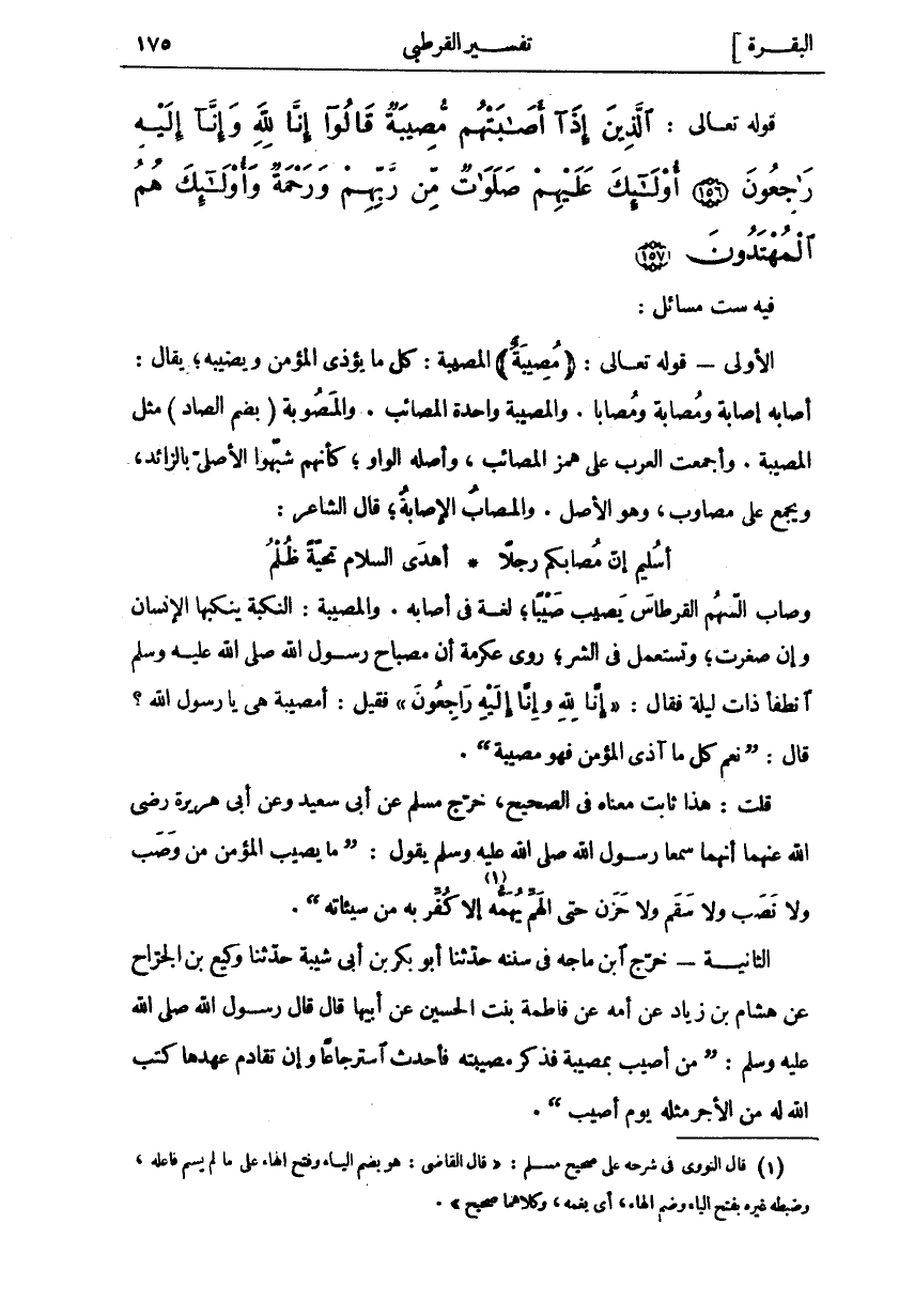 وَصَابَ السَّهْمُ الْقِرْطَاسُ يُصِيبُ صبيا، لُغَةٌ فِي أَصَابَهُ. وَالْمُصِيبَةُ: النَّكْبَةُ يُنْكَبُهَا الْإِنْسَانُ وَإِنْ صَغُرَتْ، وَتُسْتَعْمَلُ فِي الشَّرِّ، رَوَى عِكْرِمَةُ أَنَّ مِصْبَاحَ رَسُولِ اللَّهِ صَلَّى اللَّهُ عَلَيْهِ وَسَلَّمَ انْطَفَأَ ذَاتَ لَيْلَةٍ فَقَالَ:" إِنَّا لِلَّهِ وَإِنَّا إِلَيْهِ راجِعُونَ" فَقِيلَ: أَمُصِيبَةٌ هِيَ يَا رَسُولَ اللَّهِ؟ قَالَ: (نَعَمْ كُلُّ مَا آذَى الْمُؤْمِنِ فَهُوَ مُصِيبَةٌ). قُلْتُ: هَذَا ثَابِتٌ مَعْنَاهُ فِي الصَّحِيحِ، خَرَّجَ مُسْلِمٌ عَنْ أَبِي سَعِيدٍ وَعَنْ أَبِي هُرَيْرَةَ رَضِيَ اللَّهُ عَنْهُمَا أَنَّهُمَا سَمِعَا رَسُولَ اللَّهِ صَلَّى اللَّهُ عَلَيْهِ وَسَلَّمَ يَقُولُ: (مَا يُصِيبُ الْمُؤْمِنُ مِنْ وَصَبٍ وَلَا نَصَبٍ وَلَا سَقَمٍ وَلَا حَزَنٍ حَتَّى الْهَمِّ يُهَمُّهُ «١» إِلَّا كُفِّرَ بِهِ مِنْ سَيِّئَاتِهِ). الثَّانِيَةُ- خَرَّجَ ابْنُ مَاجَهْ فِي سُنَنِهِ حَدَّثَنَا أَبُو بَكْرِ بْنُ أَبِي شَيْبَةَ حَدَّثَنَا وَكِيعُ بْنُ الْجَرَّاحِ عَنْ هِشَامِ بْنِ زِيَادٍ عَنْ أُمِّهِ عَنْ فَاطِمَةَ بِنْتِ الْحُسَيْنِ عَنْ أَبِيهَا قَالَ قَالَ رَسُولُ اللَّهِ صَلَّى اللَّهُ عَلَيْهِ وَسَلَّمَ: (مَنْ أُصِيبَ بِمُصِيبَةٍ فَذَكَرَ مُصِيبَتَهُ فَأَحْدَثَ اسْتِرْجَاعًا وَإِنْ تَقَادَمَ عَهْدُهَا كَتَبَ اللَّهُ لَهُ مِنَ الأجر مثله يوم أصيب).