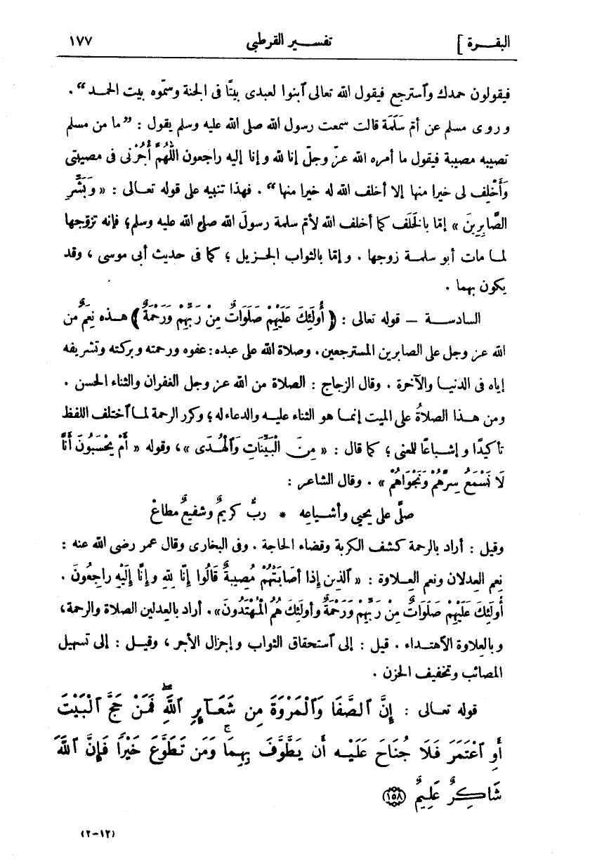 فَيَقُولُونَ حَمِدَكَ وَاسْتَرْجَعَ فَيَقُولُ اللَّهُ تَعَالَى ابْنُوا لِعَبْدِي بَيْتًا فِي الْجَنَّةِ وَسَمُّوهُ بَيْتَ الْحَمْدِ (. وَرَوَى مُسْلِمٌ عَنْ أُمِّ سَلَمَةَ قَالَتْ سَمِعْتُ رَسُولَ اللَّهِ صَلَّى اللَّهُ عَلَيْهِ وَسَلَّمَ يقول:) مَا مِنْ مُسْلِمٍ تُصِيبُهُ مُصِيبَةٌ فَيَقُولُ مَا أَمَرَهُ اللَّهُ عَزَّ وَجَلَّ إِنَّا لِلَّهِ وَإِنَّا إِلَيْهِ راجِعُونَ اللَّهُمَّ أَجِرْنِي فِي مُصِيبَتِي وَأَخْلِفْ لِي خَيْرًا مِنْهَا إِلَّا أَخْلَفَ اللَّهُ لَهُ خَيْرًا مِنْهَا (. فَهَذَا تَنْبِيهٌ عَلَى قَوْلِهِ تَعَالَى:" وَبَشِّرِ الصَّابِرِينَ" إِمَّا بِالْخَلَفِ كَمَا أَخْلَفَ اللَّهُ لِأُمِّ سَلَمَةَ رَسُولَ اللَّهِ صَلَّى اللَّهُ عَلَيْهِ وَسَلَّمَ، فَإِنَّهُ تَزَوَّجَهَا لَمَّا مَاتَ أَبُو سَلَمَةَ زَوْجُهَا. وَإِمَّا بِالثَّوَابِ الْجَزِيلِ، كَمَا فِي حَدِيثِ أَبِي مُوسَى، وَقَدْ يَكُونُ بِهِمَا. السَّادِسَةُ- قَوْلُهُ تَعَالَى:" أُولئِكَ عَلَيْهِمْ صَلَواتٌ مِنْ رَبِّهِمْ وَرَحْمَةٌ" هَذِهِ نِعَمٌ مِنَ اللَّهِ عَزَّ وَجَلَّ عَلَى الصَّابِرِينَ الْمُسْتَرْجِعِينَ. وَصَلَاةُ اللَّهِ عَلَى عَبْدِهِ: عَفْوُهُ وَرَحْمَتُهُ وَبَرَكَتُهُ وَتَشْرِيفُهُ إِيَّاهُ فِي الدُّنْيَا وَالْآخِرَةِ. وَقَالَ الزَّجَّاجُ: الصَّلَاةُ مِنَ اللَّهِ عَزَّ وَجَلَّ الْغُفْرَانُ وَالثَّنَاءُ الْحَسَنُ. وَمِنْ هَذَا الصَّلَاةُ عَلَى الْمَيِّتِ إِنَّمَا هُوَ الثَّنَاءُ عَلَيْهِ وَالدُّعَاءُ لَهُ، وَكَرَّرَ الرَّحْمَةَ لَمَّا اخْتَلَفَ اللَّفْظُ تَأْكِيدًا وَإِشْبَاعًا لِلْمَعْنَى، كَمَا قَالَ:" مِنَ الْبَيِّناتِ وَالْهُدى "، وَقَوْلُهُ" أَمْ يَحْسَبُونَ أَنَّا لَا نَسْمَعُ سِرَّهُمْ وَنَجْواهُمْ". وَقَالَ الشَّاعِرُ: