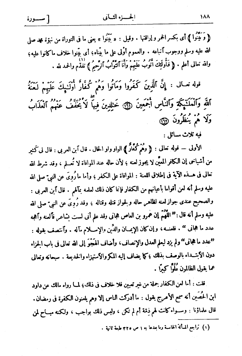 فِيهِ ثَلَاثُ مَسَائِلَ: الْأُولَى- قَوْلُهُ تَعَالَى:" وَهُمْ كُفَّارٌ" الْوَاوُ وَاوُ الْحَالِ. قَالَ ابْنُ الْعَرَبِيِّ: قَالَ لِي كَثِيرٌ مِنْ أَشْيَاخِي إِنَّ الْكَافِرَ الْمُعَيَّنَ لَا يَجُوزُ لَعْنُهُ، لِأَنَّ حَالَهُ عِنْدَ الْمُوَافَاةِ لَا تُعْلَمُ، وَقَدْ شَرَطَ اللَّهُ تَعَالَى فِي هَذِهِ الْآيَةِ فِي إِطْلَاقِ اللَّعْنَةِ: الْمُوَافَاةَ عَلَى الْكُفْرِ، وَأَمَّا مَا رُوِيَ عَنِ النَّبِيِّ صَلَّى اللَّهُ عَلَيْهِ وَسَلَّمَ أَنَّهُ لَعَنَ أَقْوَامًا بِأَعْيَانِهِمْ مِنَ الْكُفَّارِ فَإِنَّمَا كَانَ ذَلِكَ لِعِلْمِهِ بِمَآلِهِمْ. قَالَ ابْنُ الْعَرَبِيِّ: وَالصَّحِيحُ عِنْدِي جَوَازِ لَعْنِهِ لِظَاهِرِ حَالِهِ وَلِجَوَازِ قَتْلِهِ وَقِتَالِهِ، وَقَدْ رُوِيَ عَنِ النَّبِيِّ صَلَّى اللَّهُ عَلَيْهِ وَسَلَّمَ أَنَّهُ قَالَ: (اللَّهُمَّ إِنَّ عَمْرَو بْنَ الْعَاصِ هَجَانِي وَقَدْ عَلِمَ أَنِّي لَسْتُ بِشَاعِرٍ فَالْعَنْهُ وَاهْجُهُ عَدَدَ مَا هَجَانِي). فَلَعَنَهُ، وَإِنْ كَانَ الْإِيمَانُ وَالدِّينُ وَالْإِسْلَامُ مَآلَهُ. وَانْتَصَفَ بِقَوْلِهِ: (عَدَدَ مَا هَجَانِي) وَلَمْ يَزِدْ لِيُعْلَمَ الْعَدْلُ وَالْإِنْصَافُ. وَأَضَافَ الْهَجْوَّ إِلَى اللَّهِ تَعَالَى فِي بَابِ الْجَزَاءِ دُونَ الِابْتِدَاءِ بِالْوَصْفِ بِذَلِكَ، كَمَا يُضَافُ إِلَيْهِ الْمَكْرُ وَالِاسْتِهْزَاءُ وَالْخَدِيعَةُ. سُبْحَانَهُ وَتَعَالَى عَمَّا يَقُولُ الظَّالِمُونَ عُلُوًّا كَبِيرًا. قُلْتُ: أَمَّا لَعْنُ الْكُفَّارِ جُمْلَةً مِنْ غَيْرِ تَعْيِينٍ فَلَا خِلَافَ فِي ذَلِكَ، لِمَا رَوَاهُ مَالِكٌ عَنْ دَاوُدَ بْنِ الْحُصَيْنِ أَنَّهُ سَمِعَ الْأَعْرَجَ يَقُولُ: مَا أَدْرَكْتُ النَّاسَ إِلَّا وَهُمْ يَلْعَنُونَ الْكَفَرَةَ فِي رَمَضَانَ. قَالَ عُلَمَاؤُنَا: وَسَوَاءٌ كَانَتْ لَهُمْ ذِمَّةٌ أَمْ لَمْ تَكُنْ، وَلَيْسَ ذَلِكَ بِوَاجِبٍ، ولكنه مباح لمن
