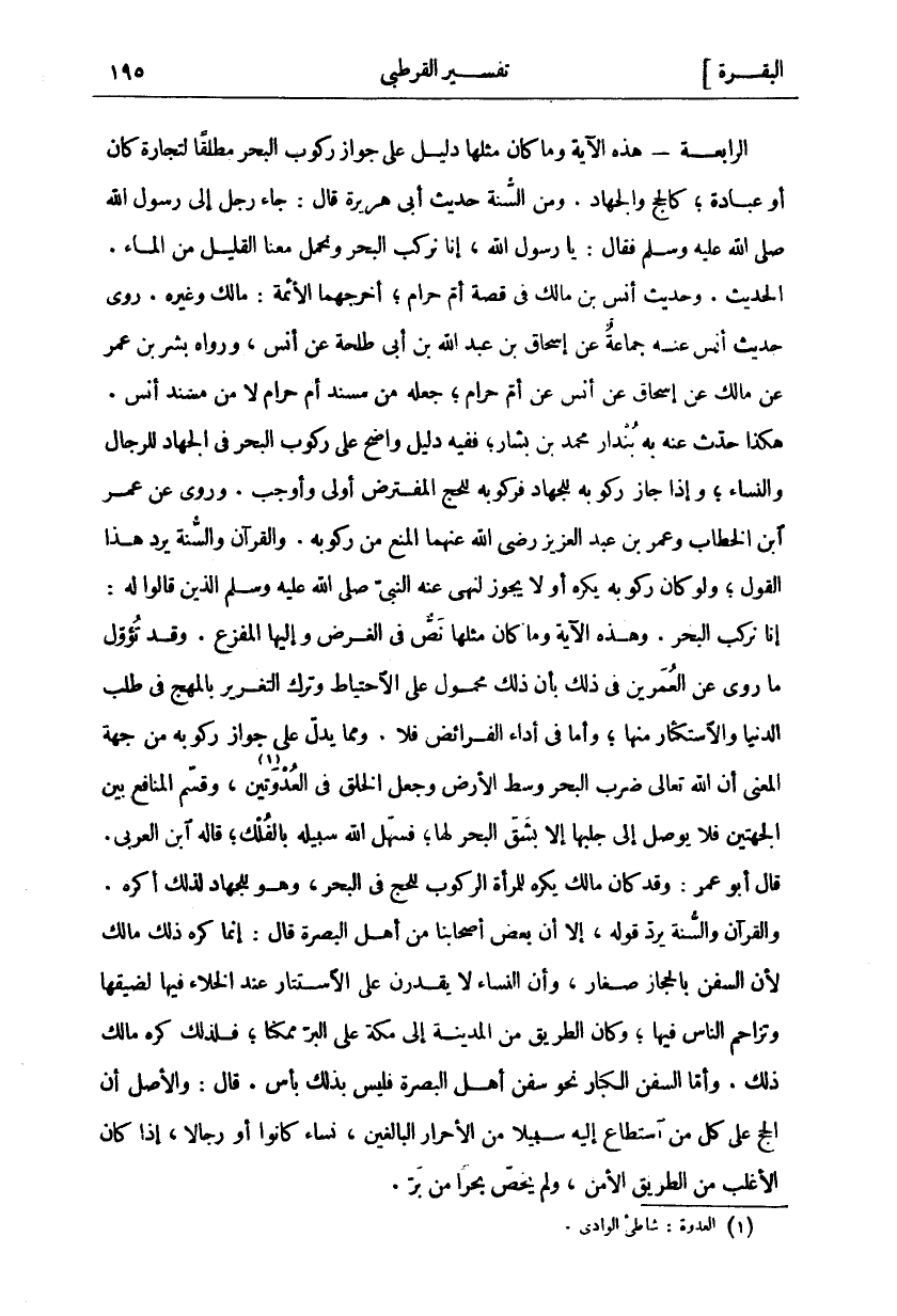 الرَّابِعَةُ- هَذِهِ الْآيَةُ وَمَا كَانَ مِثْلُهَا دَلِيلٌ عَلَى جَوَازِ رُكُوبِ الْبَحْرِ مُطْلَقًا لِتِجَارَةٍ كَانَ أَوْ عِبَادَةٍ، كَالْحَجِّ وَالْجِهَادِ. وَمِنَ السُّنَّةِ حَدِيثُ أَبِي هُرَيْرَةَ قَالَ: جَاءَ رَجُلٌ إِلَى رَسُولِ اللَّهِ صَلَّى اللَّهُ عَلَيْهِ وَسَلَّمَ فَقَالَ: يَا رَسُولَ اللَّهِ، إِنَّا نَرْكَبُ الْبَحْرَ وَنَحْمِلُ مَعَنَا الْقَلِيلَ مِنَ الْمَاءِ. الْحَدِيثُ. وَحَدِيثُ أَنَسِ بْنِ مَالِكٍ فِي قِصَّةِ أُمِّ حَرَامٍ، أَخْرَجَهُمَا الْأَئِمَّةُ: مَالِكٌ وَغَيْرُهُ. رَوَى حَدِيثَ أَنَسٍ عَنْهُ جَمَاعَةٌ عَنْ إِسْحَاقَ بْنِ عَبْدِ اللَّهِ بْنِ أَبِي طَلْحَةَ عَنْ أَنَسٍ، وَرَوَاهُ بِشْرُ بْنُ عُمَرَ عَنْ مَالِكٍ عَنْ إِسْحَاقَ عَنْ أَنَسٍ عَنْ أُمِّ حَرَامٍ، جَعَلَهُ مِنْ مُسْنَدِ أُمِّ حَرَامٍ لَا مِنْ مُسْنَدِ أَنَسٍ. هَكَذَا حَدَّثَ عَنْهُ بِهِ بُنْدَارٌ مُحَمَّدُ بْنُ بَشَّارٍ، فَفِيهِ دَلِيلٌ وَاضِحٌ عَلَى رُكُوبِ الْبَحْرِ فِي الْجِهَادِ لِلرِّجَالِ وَالنِّسَاءِ، وَإِذَا جَازَ رُكُوبُهُ لِلْجِهَادِ فَرُكُوبُهُ لِلْحَجِّ المفترض أولى وأوجب. وروي عن عمر ابن الْخَطَّابِ وَعُمَرَ بْنِ عَبْدِ الْعَزِيزِ رَضِيَ اللَّهُ عَنْهُمَا الْمَنْعُ مِنْ رُكُوبِهِ. وَالْقُرْآنُ وَالسُّنَّةُ يَرُدُّ هَذَا الْقَوْلَ، وَلَوْ كَانَ رُكُوبُهُ يُكْرَهُ أَوْ لَا يَجُوزُ لَنَهَى عَنْهُ النَّبِيُّ صَلَّى اللَّهُ عَلَيْهِ وَسَلَّمَ الَّذِينَ قَالُوا لَهُ: إِنَّا نَرْكَبُ الْبَحْرَ. وَهَذِهِ الْآيَةُ وَمَا كَانَ مِثْلُهَا نَصٌّ فِي الْغَرَضِ وَإِلَيْهَا الْمَفْزَعُ. وَقَدْ تُؤُوِّلَ مَا رُوِيَ عَنِ الْعُمَرَيْنِ فِي ذَلِكَ بِأَنَّ ذَلِكَ مَحْمُولٌ عَلَى الِاحْتِيَاطِ وَتَرْكِ التَّغْرِيرِ بِالْمُهَجِ فِي طَلَبِ الدُّنْيَا وَالِاسْتِكْثَارِ مِنْهَا، وَأَمَّا فِي أَدَاءِ الْفَرَائِضِ فَلَا. وَمِمَّا يَدُلُّ عَلَى جَوَازِ رُكُوبِهِ مِنْ جِهَةِ الْمَعْنَى أَنَّ اللَّهَ تَعَالَى ضَرَبَ الْبَحْرَ وَسْطَ الْأَرْضِ وَجَعَلَ الْخَلْقَ فِي الْعَدْوَتَيْنِ «١»، وَقَسَّمَ الْمَنَافِعَ بَيْنَ الْجِهَتَيْنِ فَلَا يُوصَلُ إِلَى جَلْبِهَا إِلَّا بِشَقِ الْبَحْرِ لَهَا، فَسَهَّلَ اللَّهُ سَبِيلَهُ بِالْفُلْكِ، قَالَهُ ابْنُ الْعَرَبِيِّ. قَالَ أَبُو عُمَرَ: وَقَدْ كَانَ مَالِكٌ يَكْرَهُ لِلْمَرْأَةِ الرُّكُوبَ لِلْحَجِّ فِي الْبَحْرِ، وَهُوَ لِلْجِهَادِ لِذَلِكَ أَكْرَهُ. وَالْقُرْآنُ وَالسُّنَّةُ يَرُدُّ قَوْلَهُ، إِلَّا أَنَّ بَعْضَ أَصْحَابِنَا مِنْ أَهْلِ الْبَصْرَةِ قَالَ: إِنَّمَا كَرِهَ ذَلِكَ مَالِكٌ لِأَنَّ السُّفُنَ بِالْحِجَازِ صِغَارٌ، وَأَنَّ النِّسَاءَ لَا يَقْدِرْنَ عَلَى الِاسْتِتَارِ عِنْدَ الْخَلَاءِ فِيهَا لِضِيقِهَا وَتَزَاحُمِ النَّاسِ فِيهَا، وَكَانَ الطَّرِيقُ مِنْ الْمَدِينَةِ إِلَى مَكَّةَ عَلَى الْبَرِّ مُمْكِنًا، فَلِذَلِكَ كَرِهَ مَالِكٌ ذَلِكَ. وَأَمَّا السُّفُنُ الْكِبَارُ نَحْوُ سُفُنِ أَهْلِ الْبَصْرَةِ فَلَيْسَ بِذَلِكَ بَأْسٌ. قَالَ: وَالْأَصْلُ أَنَّ الْحَجَّ عَلَى كُلِّ مَنِ اسْتَطَاعَ إِلَيْهِ سَبِيلًا مِنَ الْأَحْرَارِ الْبَالِغِينَ، نِسَاءً كَانُوا أَوْ رِجَالًا، إِذَا كَانَ الْأَغْلَبُ مِنَ الطَّرِيقِ الْأَمْنِ، وَلَمْ يَخُصَّ بَحْرًا مِنْ بَرٍّ.