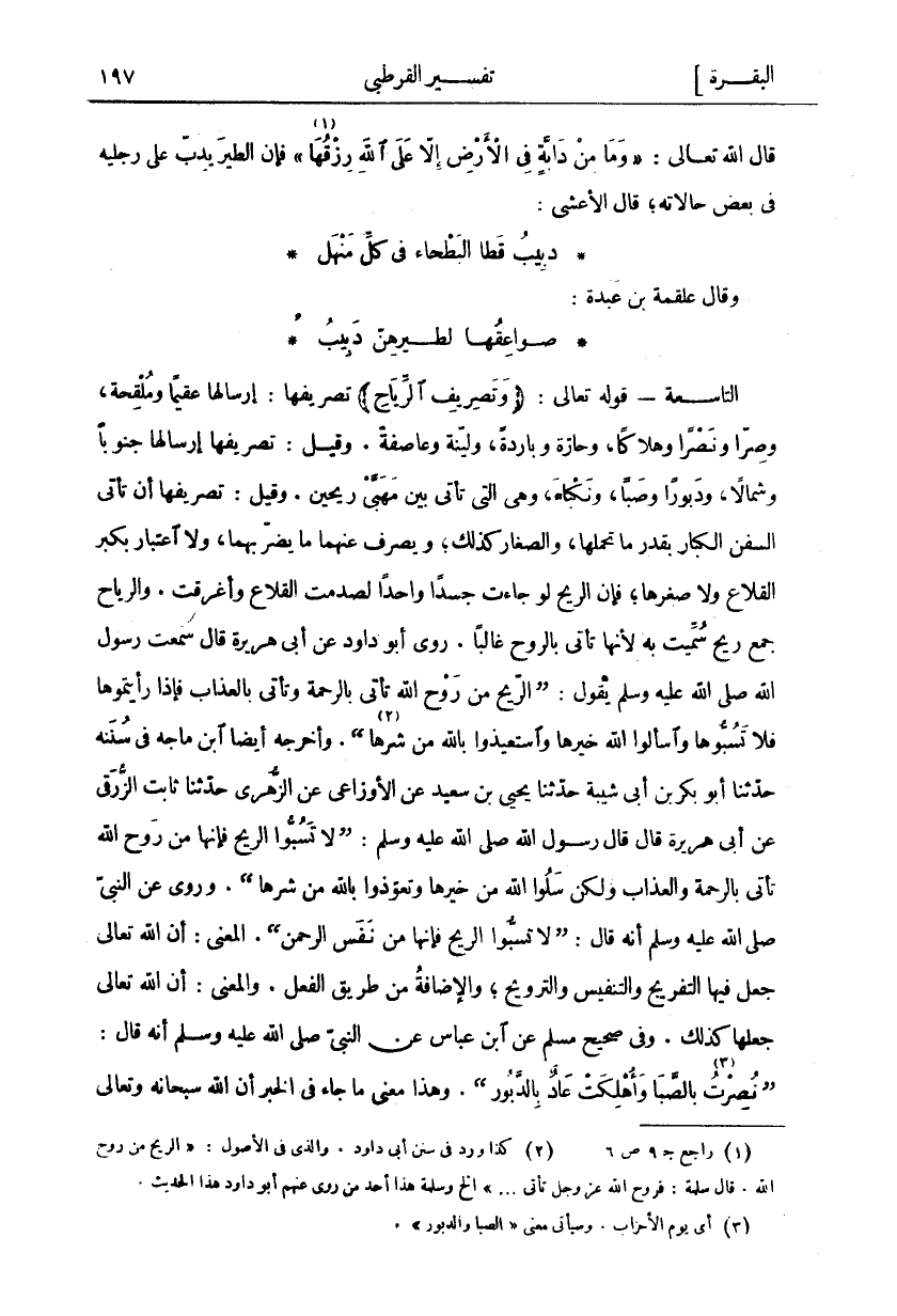 التَّاسِعَةُ- قَوْلُهُ تَعَالَى:" وَتَصْرِيفِ الرِّياحِ" تَصْرِيفُهَا: إِرْسَالُهَا عَقِيمًا وَمُلْقِحَةً، وَصِرًّا وَنَصْرًا وَهَلَاكًا، وَحَارَّةً وَبَارِدَةً، وَلَيِّنَةً وَعَاصِفَةً. وَقِيلَ: تَصْرِيفُهَا إِرْسَالُهَا جَنُوبًا وَشَمَالًا، وَدَبُورًا وَصَبًّا، وَنَكْبَاءَ، وَهِيَ الَّتِي تَأْتِي بَيْنَ مَهَبَّيْ رِيحَيْنِ. وَقِيلَ: تَصْرِيفُهَا أَنْ تَأْتِيَ السُّفُنُ الْكِبَارُ بِقَدْرِ مَا تَحْمِلُهَا، وَالصِّغَارُ كَذَلِكَ، وَيُصْرَفُ عنهما ما يضربهما، وَلَا اعْتِبَارَ بِكِبَرِ الْقِلَاعِ وَلَا صِغَرِهَا، فَإِنَّ الرِّيحَ لَوْ جَاءَتْ جَسَدًا وَاحِدًا لَصَدَمَتِ الْقِلَاعَ وَأَغْرَقَتْ. وَالرِّيَاحُ جَمْعُ رِيحٍ سُمِّيَتْ بِهِ لِأَنَّهَا تَأْتِي بِالرَّوْحِ غَالِبًا. رَوَى أَبُو دَاوُدَ عَنْ أَبِي هُرَيْرَةَ قَالَ سَمِعْتُ رَسُولَ اللَّهِ صَلَّى اللَّهُ عَلَيْهِ وَسَلَّمَ يَقُولُ: (الرِّيحُ مِنْ رَوْحِ اللَّهِ تَأْتِي بِالرَّحْمَةِ وَتَأْتِي بِالْعَذَابِ فَإِذَا رَأَيْتُمُوهَا فَلَا تَسُبُّوهَا وَاسْأَلُوا اللَّهَ خَيْرَهَا وَاسْتَعِيذُوا بِاللَّهِ مِنْ شَرِّهَا «٢»). وَأَخْرَجَهُ أَيْضًا ابْنُ مَاجَهْ فِي سُنَنِهِ حَدَّثَنَا أَبُو بَكْرِ بْنُ أَبِي شَيْبَةَ حَدَّثَنَا يَحْيَى بْنُ سَعِيدٍ عَنِ الْأَوْزَاعِيِّ عَنِ الزُّهْرِيِّ حَدَّثَنَا ثَابِتٌ الزُّرَقِيُّ عَنْ أَبِي هُرَيْرَةَ قَالَ قَالَ رَسُولُ اللَّهِ صَلَّى اللَّهُ عَلَيْهِ وَسَلَّمَ: (لَا تَسُبُّوا الرِّيحَ فَإِنَّهَا مِنْ رَوْحِ اللَّهِ تَأْتِي بِالرَّحْمَةِ وَالْعَذَابِ وَلَكِنْ سَلُوا اللَّهَ مِنْ خَيْرِهَا وَتَعَوَّذُوا بِاللَّهِ مِنْ شَرِّهَا (. وَرُوِيَ عَنِ النَّبِيِّ صَلَّى اللَّهُ عَلَيْهِ وَسَلَّمَ أَنَّهُ قَالَ: (لَا تَسُبُّوا الرِّيحَ فَإِنَّهَا مِنْ نَفَسِ الرَّحْمَنِ). الْمَعْنَى: أَنَّ اللَّهَ تَعَالَى جَعَلَ فِيهَا التَّفْرِيجُ وَالتَّنْفِيسُ وَالتَّرْوِيحُ، وَالْإِضَافَةُ مِنْ طَرِيقِ الْفِعْلِ. وَالْمَعْنَى: أَنَّ اللَّهَ تَعَالَى جَعَلَهَا كَذَلِكَ. وَفِي صَحِيحِ مُسْلِمٍ عَنِ ابْنِ عَبَّاسٍ عَنِ النَّبِيِّ صَلَّى اللَّهُ عَلَيْهِ وَسَلَّمَ أَنَّهُ قَالَ: (نُصِرْتُ «٣» بِالصَّبَا وَأُهْلِكَتْ عَادٌ بِالدَّبُورِ). وَهَذَا مَعْنَى مَا جَاءَ فِي الْخَبَرِ أَنَّ اللَّهَ سُبْحَانَهُ وَتَعَالَى