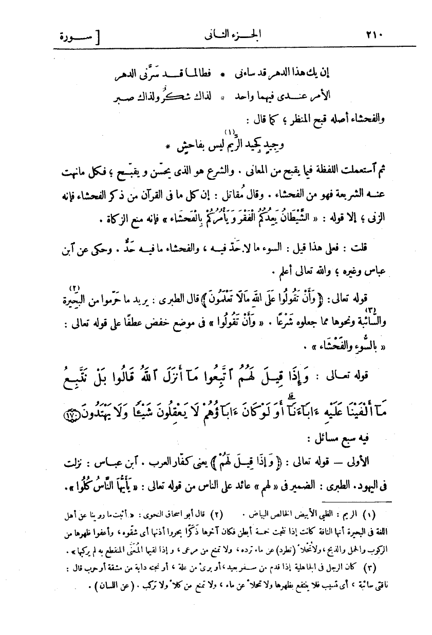 (٢). قال أبو إسحاق النحوي:" أثبت ما روينا عن أهل اللغة في البحيرة أنها الناقة كانت إذا نتجت خمسة أبطن فكان آخرها ذكرا بحروا أذنها أي شقوه، واعفوا ظهرها من الركوب والحمل والذبح، ولا تحلا، (تطرد) عن ماء ترده، ولا تمنع من مرعى، وإذا لقيها المعنى المنقطع به لم يركبها".