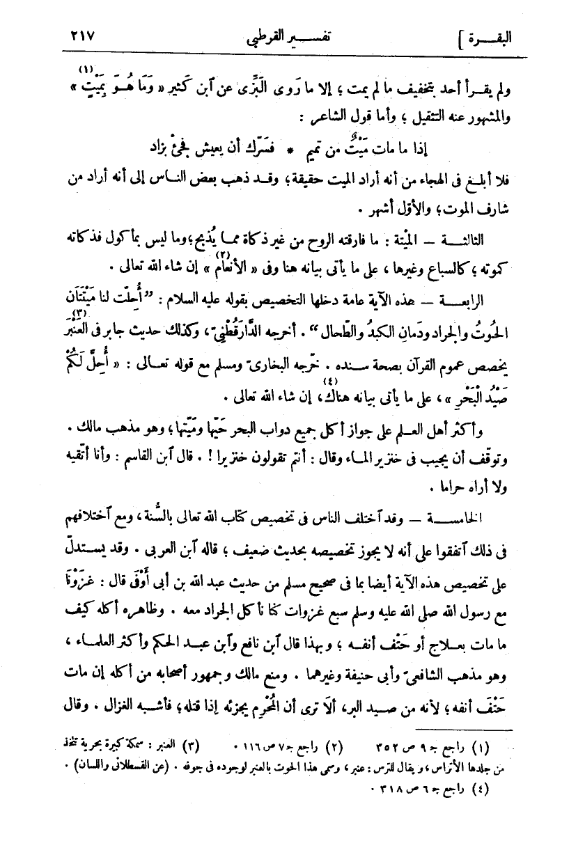 فَلَا أَبْلَغَ فِي الْهِجَاءِ مِنْ أَنَّهُ أَرَادَ الْمَيِّتَ حَقِيقَةً، وَقَدْ ذَهَبَ بَعْضُ النَّاسِ إِلَى أَنَّهُ أَرَادَ مَنْ شَارَفَ الْمَوْتَ، وَالْأَوَّلُ أَشْهَرُ. الثَّالِثَةُ- الْمَيْتَةُ: مَا فَارَقَتْهُ الرُّوحُ مِنْ غَيْرِ ذَكَاةٍ مِمَّا يُذْبَحُ، وَمَا لَيْسَ بِمَأْكُولٍ فَذَكَاتُهُ كَمَوْتِهِ، كَالسِّبَاعِ وَغَيْرِهَا، عَلَى مَا يَأْتِي بَيَانُهُ هُنَا وَفِي" الْأَنْعَامِ «٢» " إِنْ شَاءَ اللَّهُ تَعَالَى. الرَّابِعَةُ- هَذِهِ الْآيَةُ عَامَّةٌ دَخَلَهَا التَّخْصِيصُ بِقَوْلِهِ عَلَيْهِ السَّلَامُ: (أُحِلَّتْ لَنَا مَيْتَتَانِ الْحُوتُ وَالْجَرَادُ وَدَمَانِ الْكَبِدُ وَالطِّحَالُ). أَخْرَجَهُ الدَّارَقُطْنِيُّ، وَكَذَلِكَ حَدِيثُ جَابِرٍ فِي الْعَنْبَرِ «٣» يُخَصَّصُ عُمُومَ الْقُرْآنِ بِصِحَّةِ سَنَدِهِ. خَرَّجَهُ الْبُخَارِيُّ وَمُسْلِمٌ مَعَ قَوْلِهِ تَعَالَى:" أُحِلَّ لَكُمْ صَيْدُ الْبَحْرِ"، عَلَى مَا يَأْتِي بَيَانُهُ هُنَاكَ «٤»، إِنْ شَاءَ اللَّهُ تَعَالَى. وَأَكْثَرُ أَهْلِ الْعِلْمِ عَلَى جَوَازِ أَكْلِ جَمِيعِ دَوَابِّ الْبَحْرِ حَيِّهَا وَمَيِّتِهَا، وَهُوَ مَذْهَبُ مَالِكٍ. وَتَوَقَّفَ أَنْ يُجِيبَ فِي خِنْزِيرِ الْمَاءِ وَقَالَ: أَنْتُمْ تَقُولُونَ خِنْزِيرًا! قَالَ ابْنُ الْقَاسِمِ: وَأَنَا أَتَّقِيهِ وَلَا أَرَاهُ حَرَامًا. الْخَامِسَةُ- وَقَدِ اخْتَلَفَ النَّاسُ فِي تَخْصِيصِ كِتَابِ اللَّهِ تَعَالَى بِالسُّنَّةِ، وَمَعَ اخْتِلَافِهِمْ فِي ذَلِكَ اتَّفَقُوا عَلَى أَنَّهُ لَا يَجُوزُ تَخْصِيصُهُ بِحَدِيثٍ ضَعِيفٍ، قَالَهُ ابْنُ الْعَرَبِيِّ. وَقَدْ يُسْتَدَلُّ عَلَى تَخْصِيصِ هَذِهِ الْآيَةِ أَيْضًا بِمَا فِي صَحِيحِ مُسْلِمٍ مِنْ حَدِيثِ عَبْدِ اللَّهِ بْنِ أَبِي أَوْفَى قَالَ: غَزَوْنَا مَعَ رَسُولِ اللَّهِ صَلَّى اللَّهُ عَلَيْهِ وَسَلَّمَ سَبْعَ غَزَوَاتٍ كُنَّا نَأْكُلُ الْجَرَادَ مَعَهُ. وَظَاهِرُهُ أَكْلُهُ كَيْفَ مَا مَاتَ بِعِلَاجٍ أَوْ حَتْفَ أَنْفِهِ، وَبِهَذَا قَالَ ابْنُ نَافِعٍ وَابْنُ عَبْدِ الْحَكَمِ وَأَكْثَرُ الْعُلَمَاءِ، وَهُوَ مَذْهَبُ الشَّافِعِيِّ وَأَبِي حَنِيفَةَ وَغَيْرِهِمَا. وَمَنَعَ مَالِكٌ وَجُمْهُورُ أَصْحَابِهِ مِنْ أَكْلِهِ إِنْ مَاتَ حَتْفَ أَنْفِهِ، لِأَنَّهُ مِنْ صَيْدِ الْبَرِّ، ألا ترى أن الحرم يجزئه إذا قتله، فأشبه الغزال. وقال