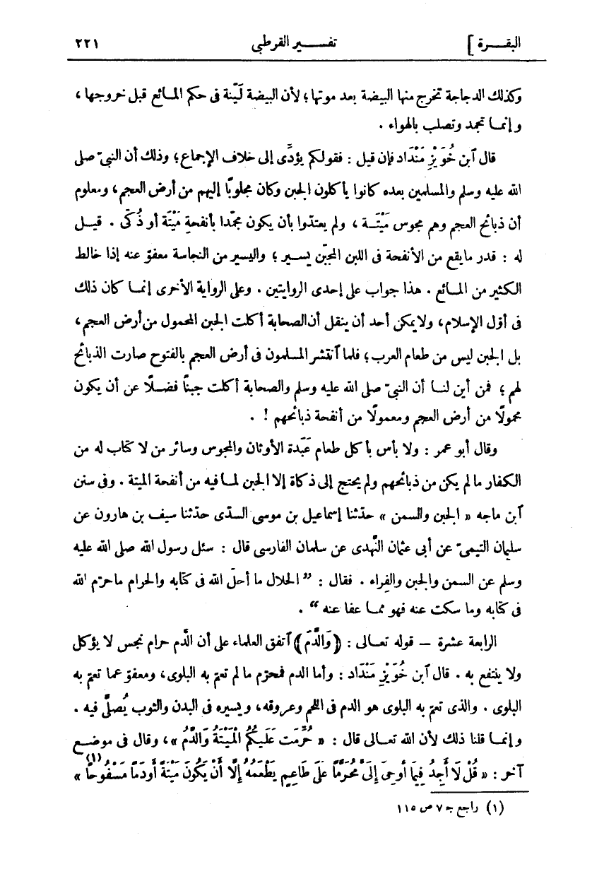 وَكَذَلِكَ الدَّجَاجَةُ تَخْرُجُ مِنْهَا الْبَيْضَةُ بَعْدَ مَوْتِهَا، لِأَنَّ الْبَيْضَةَ لَيِّنَةٌ فِي حُكْمِ الْمَائِعِ قَبْلَ خُرُوجِهَا، وَإِنَّمَا تَجْمُدُ وَتَصْلُبُ بِالْهَوَاءِ. قَالَ ابْنُ خُوَيْزِ مَنْدَادُ فَإِنْ قِيلَ: فَقَوْلُكُمْ يُؤَدِّي إِلَى خِلَافِ الْإِجْمَاعِ، وَذَلِكَ أَنَّ النَّبِيَّ صَلَّى اللَّهُ عَلَيْهِ وَسَلَّمَ وَالْمُسْلِمِينَ بَعْدَهُ كَانُوا يَأْكُلُونَ الْجُبْنَ وَكَانَ مَجْلُوبًا إِلَيْهِمْ مِنْ أَرْضِ الْعَجَمِ، وَمَعْلُومٌ أَنَّ ذَبَائِحَ الْعَجَمِ وَهُمْ مَجُوسٌ مَيْتَةٌ، وَلَمْ يَعْتَدُّوا بِأَنْ يَكُونَ مُجَمَّدًا بِإِنْفَحَةِ مَيْتَةٍ أَوْ ذُكِّيَ. قِيلَ لَهُ: قَدْرُ مَا يَقَعُ مِنَ الْإِنْفَحَةِ فِي اللَّبَنِ الْمُجَبَّنِ يَسِيرٌ، وَالْيَسِيرُ مِنَ النَّجَاسَةِ مَعْفُوٌّ عَنْهُ إِذَا خَالَطَ الْكَثِيرَ مِنَ الْمَائِعِ. هَذَا جَوَابٌ عَلَى إِحْدَى الرِّوَايَتَيْنِ. وَعَلَى الرِّوَايَةِ الْأُخْرَى إِنَّمَا كَانَ ذَلِكَ فِي أَوَّلِ الْإِسْلَامِ، وَلَا يُمْكِنُ أَحَدٌ أَنْ يَنْقُلَ أَنَّ الصَّحَابَةَ أَكَلَتِ الْجُبْنَ الْمَحْمُولَ مِنْ أَرْضِ الْعَجَمِ، بَلِ الْجُبْنُ لَيْسَ مِنْ طَعَامِ الْعَرَبِ، فَلَمَّا انْتَشَرَ الْمُسْلِمُونَ فِي أَرْضِ الْعَجَمِ بِالْفُتُوحِ صَارَتِ الذَّبَائِحُ لَهُمْ، فَمِنْ أَيْنَ لَنَا أَنَّ النَّبِيَّ صَلَّى اللَّهُ عَلَيْهِ وَسَلَّمَ وَالصَّحَابَةَ أَكَلَتْ جُبْنًا فَضْلًا عَنْ أَنْ يَكُونَ مَحْمُولًا مِنْ أَرْضِ الْعَجَمِ وَمَعْمُولًا مِنْ إِنْفَحَةِ ذَبَائِحِهِمْ. وَقَالَ أَبُو عُمَرَ: وَلَا بَأْسَ بِأَكْلِ طَعَامِ عَبَدَةِ الْأَوْثَانِ وَالْمَجُوسِ وَسَائِرِ مَنْ لَا كِتَابَ لَهُ مِنَ الْكُفَّارِ مَا لَمْ يَكُنْ مِنْ ذَبَائِحِهِمْ وَلَمْ يَحْتَجْ إِلَى ذَكَاةٍ إِلَّا الْجُبْنَ لِمَا فِيهِ مِنْ إِنْفَحَةِ الْمَيْتَةِ. وَفِي سُنَنِ ابْنِ مَاجَهْ" الْجُبْنُ وَالسَّمْنُ" حَدَّثَنَا إِسْمَاعِيلُ بْنُ مُوسَى السُّدِّيُّ حَدَّثَنَا سَيْفُ بْنُ هَارُونَ عَنْ سُلَيْمَانَ التَّيْمِيِّ عَنْ أَبِي عُثْمَانَ النَّهْدِيِّ عَنْ سَلْمَانَ الْفَارِسِيِّ قَالَ: سُئِلَ رَسُولُ اللَّهِ صَلَّى اللَّهُ عَلَيْهِ وَسَلَّمَ عَنِ السَّمْنِ وَالْجُبْنِ وَالْفِرَاءِ. فَقَالَ: (الْحَلَالُ مَا أَحَلَّ اللَّهُ فِي كِتَابِهِ وَالْحَرَامُ مَا حَرَّمَ اللَّهُ فِي كِتَابِهِ وَمَا سَكَتَ عَنْهُ فَهُوَ مِمَّا عَفَا عَنْهُ). الرَّابِعَةَ عَشْرَةَ- قَوْلُهُ تَعَالَى:" وَالدَّمَ" اتَّفَقَ الْعُلَمَاءُ عَلَى أَنَّ الدَّمَ حَرَامٌ نَجِسٌ لَا يُؤْكَلُ وَلَا يُنْتَفَعُ بِهِ. قَالَ ابْنُ خُوَيْزِ مَنْدَادُ: وَأَمَّا الدَّمُ فَمُحَرَّمٌ مَا لَمْ تَعُمَّ بِهِ الْبَلْوَى، وَمَعْفُوٌّ عَمَّا تَعُمُّ بِهِ الْبَلْوَى. وَالَّذِي تَعُمُّ بِهِ الْبَلْوَى هُوَ الدَّمُ فِي اللَّحْمِ وَعُرُوقُهُ، وَيَسِيرُهُ فِي الْبَدَنِ وَالثَّوْبِ يُصَلَّى فِيهِ. وَإِنَّمَا قُلْنَا ذَلِكَ لِأَنَّ اللَّهَ تَعَالَى قَالَ:" حُرِّمَتْ عَلَيْكُمُ الْمَيْتَةُ وَالدَّمُ"، وَقَالَ فِي مَوْضِعٍ آخَرَ" قُلْ لَا أَجِدُ فِي مَا أُوحِيَ إِلَيَّ مُحَرَّماً عَلى طاعِمٍ يَطْعَمُهُ إِلَّا أَنْ يَكُونَ مَيْتَةً أَوْ دَماً مَسْفُوحاً «١» ".