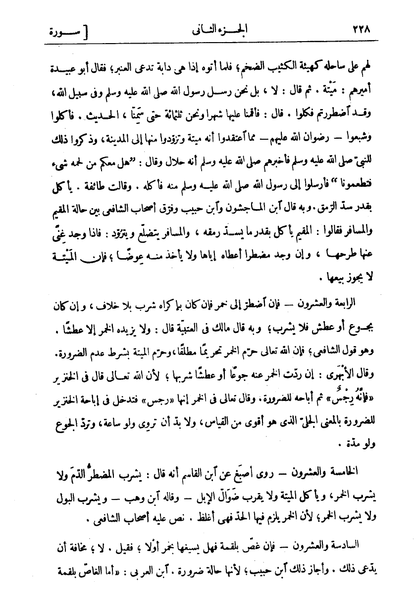 لَهُمْ عَلَى سَاحِلِهِ كَهَيْئَةِ الْكَثِيبِ الضَّخْمِ، فَلَمَّا أَتَوْهُ إِذَا هِيَ دَابَّةٌ تُدْعَى الْعَنْبَرَ، فَقَالَ أَبُو عُبَيْدَةَ أَمِيرُهُمْ: مَيْتَةٌ. ثُمَّ قَالَ: لَا، بَلْ نَحْنُ رُسُلُ رَسُولِ اللَّهِ صَلَّى اللَّهُ عَلَيْهِ وَسَلَّمَ وَفِي سَبِيلِ اللَّهِ، وَقَدِ اضْطُرِرْتُمْ فَكُلُوا. قَالَ: فَأَقَمْنَا عَلَيْهَا شَهْرًا وَنَحْنُ ثَلَاثُمِائَةٍ حَتَّى سَمِنَّا، الْحَدِيثَ. فَأَكَلُوا وَشَبِعُوا- رِضْوَانُ اللَّهِ عَلَيْهِمْ- مِمَّا اعْتَقَدُوا أَنَّهُ مَيْتَةً وَتَزَوَّدُوا مِنْهَا إِلَى الْمَدِينَةِ، وَذَكَرُوا ذَلِكَ لِلنَّبِيِّ صَلَّى اللَّهُ عَلَيْهِ وَسَلَّمَ فَأَخْبَرَهُمْ صَلَّى اللَّهُ عَلَيْهِ وَسَلَّمَ أَنَّهُ حَلَالٌ وَقَالَ: (هَلْ مَعَكُمْ مِنْ لَحْمِهِ شي فَتُطْعِمُونَا) فَأَرْسَلُوا إِلَى رَسُولِ اللَّهِ صَلَّى اللَّهُ عَلَيْهِ وَسَلَّمَ مِنْهُ فَأَكَلَهُ. وَقَالَتْ طَائِفَةٌ. يَأْكُلُ بِقَدْرِ سَدِّ الرَّمَقِ. وَبِهِ قَالَ ابْنُ الْمَاجِشُونِ وَابْنُ حَبِيبٍ وَفَرَّقَ أَصْحَابُ الشَّافِعِيِّ بَيْنَ حَالَةِ الْمُقِيمِ وَالْمُسَافِرِ فَقَالُوا: الْمُقِيمُ يَأْكُلُ بِقَدْرِ مَا يَسُدُّ رَمَقَهُ، وَالْمُسَافِرُ يَتَضَلَّعُ وَيَتَزَوَّدُ: فَإِذَا وَجَدَ غِنًى عَنْهَا طَرَحَهَا، وَإِنْ وَجَدَ مُضْطَرًّا أَعْطَاهُ إِيَّاهَا وَلَا يَأْخُذُ مِنْهُ عِوَضًا، فَإِنَّ الْمَيْتَةَ لَاَ يَجُوزُ بَيْعُهَا. الرَّابِعَةُ وَالْعِشْرُونَ- فَإِنِ اضْطُرَّ إِلَى خَمْرٍ فَإِنْ كَانَ بِإِكْرَاهٍ شَرِبَ بِلَا خِلَافٍ، وَإِنْ كَانَ بِجُوعٍ أَوْ عَطَشٍ فَلَا يَشْرَبُ، وَبِهِ قَالَ مَالِكٌ فِي الْعُتْبِيَّةِ قَالَ: وَلَا يَزِيدُهُ الْخَمْرُ إِلَّا عَطَشًا. وَهُوَ قَوْلُ الشَّافِعِيِّ، فَإِنَّ اللَّهَ تَعَالَى حَرَّمَ الْخَمْرَ تَحْرِيمًا مُطْلَقًا، وَحَرَّمَ الْمَيْتَةَ بِشَرْطِ عَدَمِ الضَّرُورَةِ. وَقَالَ الْأَبْهَرِيُّ: إِنْ رَدَّتِ الْخَمْرُ عَنْهُ جُوعًا أَوْ عَطَشًا شَرِبَهَا، لِأَنَّ اللَّهَ تَعَالَى قَالَ فِي الْخِنْزِيرِ" فَإِنَّهُ رِجْسٌ" ثُمَّ أَبَاحَهُ لِلضَّرُورَةِ. وَقَالَ تَعَالَى فِي الْخَمْرِ إِنَّهَا" رِجْسٌ" فَتَدْخُلُ فِي إِبَاحَةِ الْخِنْزِيرِ لِلضَّرُورَةِ بِالْمَعْنَى الْجَلِيِّ الَّذِي هُوَ أَقْوَى مِنَ الْقِيَاسِ، وَلَا بُدَّ أَنْ تَرْوِيَ وَلَوْ سَاعَةً، وَتَرُدَّ الْجُوعَ وَلَوْ مُدَّةً. الْخَامِسَةُ وَالْعِشْرُونَ- رَوَى أَصْبَغُ عَنِ ابْنِ الْقَاسِمِ أَنَّهُ قَالَ: يَشْرَبُ الْمُضْطَرُّ الدَّمَ وَلَا يَشْرَبُ الْخَمْرَ، وَيَأْكُلُ الْمَيْتَةَ وَلَا يَقْرَبُ ضَوَالَّ الْإِبِلِ- وَقَالَهُ ابْنُ وَهْبٍ- وَيَشْرَبُ الْبَوْلَ وَلَا يَشْرَبُ الْخَمْرَ، لِأَنَّ الْخَمْرَ يَلْزَمُ فِيهَا الْحَدُّ فَهِيَ أَغْلَظُ. نَصَّ عَلَيْهِ أَصْحَابُ الشَّافِعِيِّ. السَّادِسَةُ وَالْعِشْرُونَ- فَإِنْ غُصَّ بِلُقْمَةٍ فَهَلْ يُسِيغُهَا بِخَمْرٍ أَوْ لَا، فَقِيلَ. لَا، مَخَافَةَ أَنْ يَدَّعِيَ ذَلِكَ. وَأَجَازَ ذَلِكَ ابْنُ حَبِيبٍ، لِأَنَّهَا حَالَةُ ضَرُورَةٍ. ابْنُ الْعَرَبِيِّ:" أَمَّا الْغَاصُّ بِلُقْمَةٍ