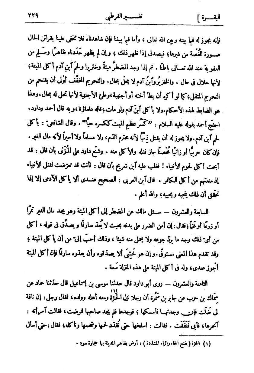 فَإِنَّهُ يَجُوزُ لَهُ فِيمَا بَيْنَهُ وَبَيْنَ اللَّهِ تَعَالَى، وَأَمَّا فِيمَا بَيْنَنَا فَإِنْ شَاهَدْنَاهُ فَلَا تَخْفَى عَلَيْنَا بِقَرَائِنِ الْحَالِ صُورَةُ الْغُصَّةِ مِنْ غَيْرِهَا، فَيُصَدَّقُ إِذَا ظَهَرَ ذَلِكَ، وَإِنْ لَمْ يَظْهَرْ حَدَدْنَاهُ ظَاهِرًا وَسَلِمَ مِنَ الْعُقُوبَةِ عِنْدَ اللَّهِ تَعَالَى بَاطِنًا. ثُمَّ إِذَا وَجَدَ الْمُضْطَرُّ مَيْتَةً وَخِنْزِيرًا وَلَحْمَ ابْنِ آدَمَ أَكَلَ الْمَيْتَةَ، لِأَنَّهَا حَلَالٌ فِي حَالِ. وَالْخِنْزِيرُ وَابْنُ آدَمَ لَا يَحِلُّ بِحَالٍ. وَالتَّحْرِيمُ الْمُخَفَّفُ أَوْلَى أَنْ يُقْتَحَمَ مِنَ التَّحْرِيمِ الْمُثَقَّلِ، كَمَا لَوْ أُكْرِهَ أَنْ يَطَأَ أُخْتَهُ أَوْ أَجْنَبِيَّةً، وَطِئَ الْأَجْنَبِيَّةَ لِأَنَّهَا تَحِلُّ لَهُ بِحَالٍ. وَهَذَا هُوَ الضَّابِطُ لِهَذِهِ الْأَحْكَامِ. وَلَا يَأْكُلُ ابْنَ آدَمَ وَلَوْ مَاتَ، قَالَهُ عُلَمَاؤُنَا، وَبِهِ قَالَ أَحْمَدُ وَدَاوُدُ. احْتَجَّ أَحْمَدُ بِقَوْلِهِ عَلَيْهِ السَّلَامُ: (كَسْرُ عَظْمِ الْمَيِّتِ كَكَسْرِهِ حَيًّا). وَقَالَ الشَّافِعِيُّ: يَأْكُلُ لَحْمَ ابْنِ آدَمَ. وَلَا يَجُوزُ لَهُ أَنْ يَقْتُلَ ذِمِّيًّا لِأَنَّهُ مُحْتَرَمُ الدَّمِ، وَلَا مُسْلِمًا وَلَا أَسِيرًا لِأَنَّهُ مَالُ الْغَيْرِ. فَإِنْ كَانَ حَرْبِيًّا أَوْ زَانِيًا مُحْصَنًا جَازَ قَتْلُهُ وَالْأَكْلُ مِنْهُ. وَشَنَّعَ دَاوُدُ عَلَى الْمُزَنِيِّ بِأَنْ قَالَ: قَدْ أَبَحْتُ أَكْلَ لُحُومِ الْأَنْبِيَاءِ! فَغَلَبَ عَلَيْهِ ابْنُ شُرَيْحٍ بِأَنْ قَالَ: فَأَنْتَ قَدْ تَعَرَّضْتَ لِقَتْلِ الْأَنْبِيَاءِ إِذْ مَنَعْتَهُمْ مِنْ أَكْلِ الْكَافِرِ. قَالَ ابْنُ الْعَرَبِيِّ: الصَّحِيحُ عِنْدِي أَلَّا يَأْكُلَ الْآدَمِيَّ إِلَّا إِذَا تَحَقَّقَ أَنَّ ذَلِكَ يُنْجِيهِ وَيُحْيِيهِ، وَاللَّهُ أَعْلَمُ. السَّابِعَةُ وَالْعِشْرُونَ- سُئِلَ مَالِكٌ عَنْ الْمُضْطَرِّ إِلَى أَكْلِ الْمَيْتَةِ وَهُوَ يَجِدُ مَالَ الْغَيْرِ تَمْرًا أَوْ زَرْعًا أَوْ غَنَمًا، فَقَالَ: إِنْ أَمِنَ الضَّرَرَ عَلَى بَدَنِهِ بِحَيْثُ لَا يُعَدُّ سَارِقًا وَيُصَدَّقُ فِي قَوْلِهِ، أَكَلَ مِنْ أَيِّ ذَلِكَ وَجَدَ مَا يَرُدُّ جُوعَهُ وَلَا يَحْمِلُ مِنْهُ شَيْئًا، وَذَلِكَ أَحَبُّ إِلَيَّ مِنْ أَنْ يَأْكُلَ الْمَيْتَةَ، وَقَدْ تَقَدَّمَ هَذَا الْمَعْنَى مُسْتَوْفًى. وَإِنْ هُوَ خَشِيَ أَلَّا يُصَدِّقُوهُ وَأَنْ يَعُدُّوهُ سَارِقًا فَإِنَّ أَكْلَ الْمَيْتَةَ أَجْوَزُ عِنْدِي، وَلَهُ فِي أَكْلِ الْمَيْتَةِ عَلَى هَذِهِ الْمَنْزِلَةِ سَعَةٌ. الثَّامِنَةُ وَالْعِشْرُونَ- رَوَى أَبُو دَاوُدَ قَالَ حَدَّثَنَا مُوسَى بْنُ إِسْمَاعِيلَ قَالَ حَدَّثَنَا حَمَّادٌ عَنْ سِمَاكِ بْنِ حَرْبٍ عَنْ جَابِرِ بْنِ سَمُرَةَ أَنَّ رَجُلًا نَزَلَ الْحَرَّةَ «١» وَمَعَهُ أَهْلُهُ وَوَلَدُهُ، فَقَالَ رَجُلٌ: إِنَّ نَاقَةً لِي ضَلَّتْ فَإِنْ وَجَدْتَهَا فَأَمْسِكْهَا، فَوَجَدَهَا فَلَمْ يَجِدْ صَاحِبهَا فَمَرِضَتْ، فَقَالَتِ امْرَأَتُهُ: انْحَرْهَا، فَأَبَى فَنَفَقَتْ. فَقَالَتِ: اسْلَخْهَا حَتَّى نُقَدِّدَ لَحْمَهَا وَشَحْمَهَا وَنَأْكُلَهُ، فَقَالَ: حتى أسأل